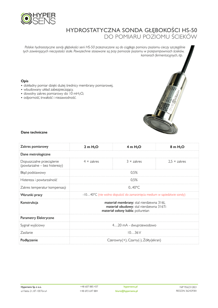 HYDROSTATYCZNA SONDA GŁĘBOKOŚCI HS-50 DO POMIARU POZIOMU ŚCIEKÓW Polskie hydrostatyczne sondy głębokości serii HS-50 przeznaczone są do ciągłego pomiaru poziomu cieczy szczególnie tych zawierających nieczystości stałe. Powszechnie stosowane są przy pomiarze poziomu w przepompowniach ścieków, komorach fermentacyjnych, itp. Opis • dokładny pomiar dzięki dużej średnicy membrany pomiarowej, • wbudowany układ zabezpieczający, • dowolny zakres pomiarowy do 10 mH2O, • odporność, trwałość i niezawodność. Dane techniczne Zakres pomiarowy 2 m H2O 4 m H2O 8 m H2O 4 × zakres 3 × zakres 2,5 × zakres Dane metrologiczne Dopuszczalne przeciążenie (powtarzalne – bez histerezy) Błąd podstawowy 0,5% Histereza i powtarzalność 0,5% Zakres temperatur kompensacji Warunki pracy 0...40°C -10…40°C (nie wolno dopuścić do zamarznięcia medium w sąsiedztwie sondy) Konstrukcja materiał membrany: stal nierdzewna 316L materiał obudowy: stal nierdzewna 316Ti materiał osłony kabla: poliuretan Parametry Elektryczne Sygnał wyjściowy 4…20 mA - dwuprzewodowo Zasilanie 10…36 V Podłączenie Czerowny(+), Czarny(-), Żółty(ekran) Hypersens Sp. z o.o. +48 607 885 437 hypersens.pl ul. Fałata 21, 87-100 Toruń +48 693 647 884 [email protected] NIP 9562312821 REGON 362429381