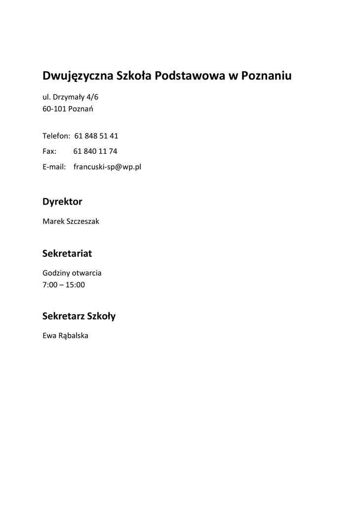 Dwujęzyczna Szkoła Podstawowa w Poznaniu ul. Drzymały 4/6 60-101 Poznań Telefon: 61 848 51 41 Fax: 61 840 11 74 E-mail: [email protected] Dyrektor Marek Szczeszak Sekretariat Godziny otwarcia 7:00 – 15:00 Sekretarz Szkoły Ewa Rąbalska