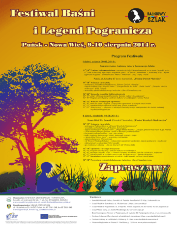 Festiwal Baśni BASNIOWY SZLAK i Legend Pogranicza Puńsk - Nowa Wieś, 9-10 sierpnia 2014 r. Program Festiwalu I dzień, sobota 09.08.2014 r. Suwalszczyzna - bajkowy tabor z Baśniowego Szlaku 1100-1600 Przejazd bajkowego taboru - prezentacja baśni i legend pogranicza na trasie: Suwałki, godz. 00 30 12 (Park Konstytucji 3-go Maja) - Augustów, godz. 13 (plaże: „Budowlani” i „Radiowej Trójki”, Rynek Zygmunta Augusta) - Studzieniczna - Płaska - Mołowiste - Giby - Sejny - Puńsk Puńsk, ul. Szkolna 67 (przy skansenie), „Wioska Dwóch Mistrzów” 1400-1800 Animacje i warsztaty animacje z Koszałkiem Opałkiem w „Wiosce Dwóch Mistrzów” zajęcia edukacyjne: „Wyrób Świec”, „Droga chleba do stołu”, „Świat baśni”, „Takajcie, plećcie moje ręce” (Gija, Prienai) warsztaty rękodzieła ludowego twórców z Litwy i Suwalszczyzny 1630-2200 Koncerty zespołów folklorystycznych 30 00 16 -17 „Gija” z Prienai; Zespół Seniorów Tańców Ludowych „Vajaunas” 30 00 17 -19 Program artystyczny Centrum Kultury w Łoździejach i Gminy Puńsk 1900-2200 Wieczór niezwykłych opowieści 00 00 19 -20 Wieczór bajek i legend: „Księżycowe opowieści” z różnych stron świata. 00 00 20 -21 Opowiadanie w oprawie muzycznej „Pieśni przedświtu” 00 30 21 -22 „Księżycovo” – piosenki o tematyce fantastycznej z nawiązaniem do świata ludowej wyobraźni Pogranicza. II dzień, niedziela 10.08.2014 r. Nowa Wieś 9 k. Suwałk (Ośrodek Maniówka), „Wioska Wesołych Wędrowców” 00 00 00 00 00 00 12 -19 Animacje i warsztaty animacje z Podziomkiem w „Wiosce Wesołych Wędrowców” warsztaty archeologiczne „W Krainie Jaćwingów” zajęcia edukacyjne: „Wyrób Świec”, „Droga chleba do stołu”, „Takajcie, pleście moje ręce” (Gija, Prienai) „Pod niebem pełnym gwiazd”- seans w Baśniowym Planetarium na podbój baśniokosmosu - start „eko rakiety” bajki i legendy Baśniowego Szlaku, balonowe postaci z bajek „Spod dłuta Mistrza Jana” – warsztaty rzeźbiarskie zajęcia plastyczne (Mamodroga) „W Wiosce Młodego Rybaka” - ciekawostki i opowieści wędkarskie, zajęcia praktyczne - możliwość zdobycia karty wędkarskiej (PZW Suwałki) gry, konkursy i zabawy - „Jak za dawnych lat” (Anima Kids) 14 -19 Opowieści i występy muzyczne 1400-1430 Program artystyczny Centrum Kultury w Łoździejach 1445-1600 Występy zespołu „Gija” z Prienai i Zespołu Seniorów Tańców Ludowych „Vajaunas” 1600-1730 Opowiadanie w oprawie muzycznej „Królowa węży”- litewska legenda 30 00 17 -19 Opowiadanie o poszukiwaniu szczęścia – bajki i legendy z różnych stron świata. 12 -18 Prezentacja rękodzieła ludowego twórców z Litwy i Suwalszczyzny Zapraszamy Organizator: SUWALSKA IZBA ROLNICZO - TURYSTYCZNA, Suwałki, ul. Kościuszki 82 lok. 7, tel./fax 87 5665872, 5665494 www.suwalki-turystyka.info.pl, e-mail: [email protected] Współorganizator: URZĄD GMINY PUŃSK ul. Mickiewicza 23, 16-515 Puńsk, tel. 87 5161 048, fax 87 5161 048 www.ugpunsk.pl, e-mail: [email protected] Współpraca: Suwalski Ośrodek Kultury, Suwałki, ul. Papieża Jana Pawła II 5, http://soksuwalki.eu Urząd Miejski w Suwałkach, ul. Mickiewicza 1, http://um.suwalki.pl Urząd Miejski w Augustowie, ul. 3 Maja 60, 16-300 Augustów, tel. 87 643 42 10, um.augustow.pl Urząd Miasta Sejny, ul. Józefa Piłsudskiego 25, www.um.sejny.pl Biuro Euroregionu Niemen w Marjampolu, ul. Vytauto 28, Marijampole, Litwa, www.nemunas.info Centrum Informacji Turystycznej w Łoździejach, Janaslavas, Litwa, www.lazdijai-turizmas.lt Centrum Kultury w Łoździejach, Vilniaus g. 6, Litwa, www.lazdijukulturoscentras.lt Projekt „Festiwal Baśni i Legend Pogranicza na pograniczu polsko-litewskim” jest współfinansowany z Europejskiego Funduszu Rozwoju Regionalnego, Funduszu Małych Projektów - wdrażanego w ramach celu 3: Europejska Współpraca Terytorialna Program Współpracy Transgranicznej „Litwa-Polska”. Muzeum Regionalne w Prienai, F. Martišiaus g. 13, Litwa, www.prienumuziejus.lt