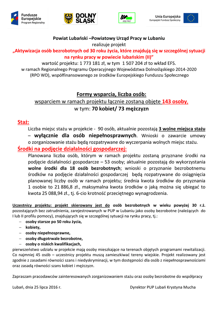 URZĄD PRACY Powiat Lubański –Powiatowy Urząd Pracy w Lubaniu realizuje projekt „Aktywizacja osób bezrobotnych od 30 roku życia, które znajdują się w szczególnej sytuacji na rynku pracy w powiecie lubańskim (II)” wartość projektu: 1 773 181 zł, w tym 1 507 204 zł to wkład EFS. w ramach Regionalnego Programu Operacyjnego Województwa Dolnośląskiego 2014-2020 (RPO WD), współfinansowanego ze środków Europejskiego Funduszu Społecznego Formy wsparcia, liczba osób: wsparciem w ramach projektu łącznie zostaną objęte 143 osoby, w tym: 70 kobiet/ 73 mężczyzn Staż: Liczba miejsc stażu w projekcie - 90 osób, aktualnie pozostają 3 wolne miejsca stażu – wyłącznie dla osób niepełnosprawnych. Wnioski o zawarcie umowy o zorganizowanie stażu będą rozpatrywane do wyczerpania wolnych miejsc stażu. Środki na podjęcie działalności gospodarczej: Planowana liczba osób, którym w ramach projektu zostaną przyznane środki na podjęcie działalności gospodarcze – 53 osoby; aktualnie pozostają do wykorzystania wolne środki dla 18 osób bezrobotnych; wnioski o przyznanie bezrobotnemu środków na podjęcie działalności gospodarczej będą rozpatrywane do osiągnięcia planowanej liczby osób w ramach projektu; średnia kwota środków do przyznania 1 osobie to 21 886,8 zł., maksymalna kwota środków o jaką można się ubiegać to kwota 25 088,94 zł., tj. 6-cio krotność przeciętnego wynagrodzenia. Uczestnicy projektu: projekt skierowany jest do osób bezrobotnych w wieku powyżej 30 r.ż. pozostających bez zatrudnienia, zarejestrowanych w PUP w Lubaniu jako osoby bezrobotne (należących do I lub II profilu pomocy), znajdujących się w szczególnej sytuacji na rynku pracy, tj.: osoby starsze po 50 roku życia, kobiety, osoby niepełnosprawne, osoby długotrwale bezrobotne, osoby o niskich kwalifikacjach, pierwszeństwo udziału w projekcie mają osoby mieszkające na terenach objętych programami rewitalizacji. Co najmniej 45 osób – uczestnicy projektu muszą zamieszkiwać tereny wiejskie. Projekt realizowany jest zgodnie z zasadami równości szans i niedyskryminacji, w tym dostępności dla osób z niepełnosprawnościami oraz zasadą równości szans kobiet i mężczyzn. Zapraszam pracodawców zainteresowanych zorganizowaniem stażu oraz osoby bezrobotne do współpracy Lubań, dnia 25 lipca 2016 r. Dyrektor PUP Lubań Krystyna Mucha