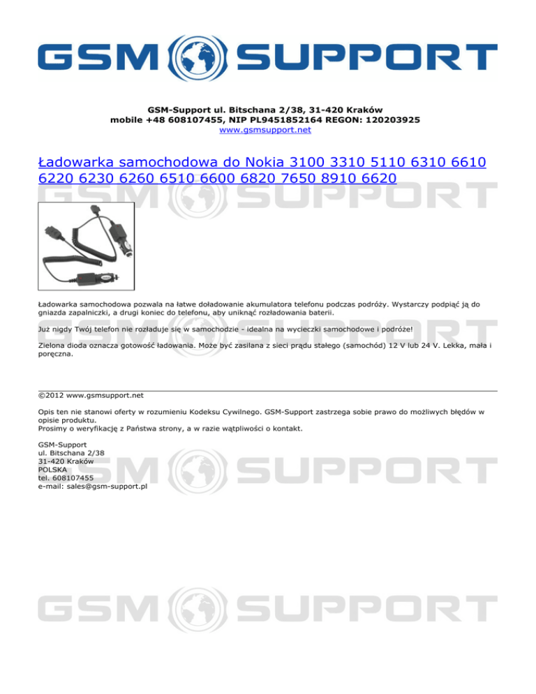 GSM-Support ul. Bitschana 2/38, 31-420 Kraków mobile +48 608107455, NIP PL9451852164 REGON: 120203925 www.gsmsupport.net Ładowarka samochodowa do Nokia 3100 3310 5110 6310 6610 6220 6230 6260 6510 6600 6820 7650 8910 6620 Ładowarka samochodowa pozwala na łatwe doładowanie akumulatora telefonu podczas podróży. Wystarczy podpiąć ją do gniazda zapalniczki, a drugi koniec do telefonu, aby uniknąć rozładowania baterii. Już nigdy Twój telefon nie rozładuje się w samochodzie - idealna na wycieczki samochodowe i podróże! Zielona dioda oznacza gotowość ładowania. Może być zasilana z sieci prądu stałego (samochód) 12 V lub 24 V. Lekka, mała i poręczna. ©2012 www.gsmsupport.net Opis ten nie stanowi oferty w rozumieniu Kodeksu Cywilnego. GSM-Support zastrzega sobie prawo do możliwych błędów w opisie produktu. Prosimy o weryfikację z Państwa strony, a w razie wątpliwości o kontakt. GSM-Support ul. Bitschana 2/38 31-420 Kraków POLSKA tel. 608107455 e-mail: [email protected] Powered by TCPDF (www.tcpdf.org)