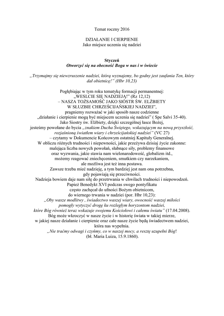 Temat roczny 2016 DZIAŁANIE I CIERPIENIE Jako miejsce uczenia się nadziei Styczeń Otworzyć się na obecność Boga w nas i w świecie „Trzymajmy się niewzruszenie nadziei, którą wyznajemy, bo godny jest zaufania Ten, który dał obietnicę!” (Hbr 10,23) Pogłębiając w tym roku tematykę formacji permanentnej: „WESLCIE SIĘ NADZIEJĄ!” (Rz 12,12) – NASZA TOŻSAMOŚĆ JAKO SIÓSTR ŚW. ELŻBIETY W SŁUZBIE CHRZEŚCIJAŃSKIEJ NADZIEI”, pragniemy rozważać w jaki sposób nasze codzienne „działanie i cierpienie mogą być miejscem uczenia się nadziei” ( Spe Salvi 35-40). Jako Siostry św. Elżbiety, dzięki szczególnej łasce Bożej, jesteśmy powołane do bycia „znakiem Ducha Świętego, wskazującym na nową przyszłość, rozjaśnioną światłem wiary i chrześcijańskiej nadziei” (VC 27) – czytamy w Dokumencie Końcowym ostatniej Kapituły Generalnej. W obliczu różnych trudności i niepewności, jakie przeżywa dzisiaj życie zakonne: malejąca liczba nowych powołań, słabnące siły, problemy finansowe oraz wyzwania, jakie stawia nam wielonarodowość, globalizm itd., możemy reagować zniechęceniem, smutkiem czy narzekaniem, ale możliwa jest też inna postawa. Zawsze trzeba mieć nadzieję, a tym bardziej jest nam ona potrzebna, gdy pojawiają się przeciwności. Nadzieja bowiem daje nam siłę do przetrwania w chwilach trudności i niepowodzeń. Papież Benedykt XVI podczas swego pontyfikatu często zachęcał do ufności Bożym obietnicom, do wiernego trwania w nadziei (por. Hbr 10,23): „Oby wasze modlitwy , świadectwo waszej wiary, owocność waszej miłości pomogły wytyczyć drogę ku rozległym horyzontom nadziei, które Bóg również teraz wskazuje swojemu Kościołowi i całemu światu” (17.04.2008). Bóg może wkroczyć w nasze życie i w historię świata w takiej mierze, w jakiej nasze działanie i cierpienie oraz całe nasze życie będą świadectwem nadziei, która nas wypełnia. „Nie traćmy odwagi i czyńmy, co w naszej mocy, a resztę uzupełni Bóg! (bł. Maria Luiza, 15.9.1860).
