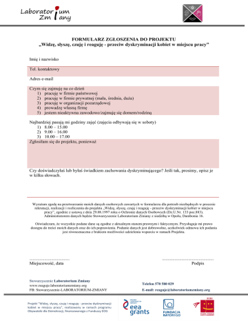 FORMULARZ ZGŁOSZENIA DO PROJEKTU „Widzę, słyszę, czuję i reaguję - przeciw dyskryminacji kobiet w miejscu pracy” Imię i nazwisko Tel. kontaktowy Adres e-mail Czym się zajmuję na co dzień 1) pracuję w firmie państwowej 2) pracuję w firmie prywatnej (mała, średnia, duża) 3) pracuję w organizacji pozarządowej 4) prowadzę własną firmę 5) jestem nieaktywna zawodowo/zajmuję się domem/rodziną Najbardziej pasują mi godziny zajęć (zajęcia odbywają się w soboty) 1) 8.00 – 15.00 2) 9.00 – 16.00 3) 10.00 – 17.00 Zgłosiłam się do projektu, ponieważ Czy doświadczyłaś lub byłaś świadkiem zachowania dyskryminującego? Jeśli tak, prosimy, opisz je w kilku słowach. Wyrażam zgodę na przetwarzanie moich danych osobowych zawartych w formularzu dla potrzeb niezbędnych w procesie rekrutacji, realizacji i rozliczenia do projektu „Widzę, słyszę, czuję i reaguję - przeciw dyskryminacji kobiet w miejscu pracy”, zgodnie z ustawą z dnia 29.08.1997 roku o Ochronie danych Osobowych (Dz.U.Nr. 133 poz.883). Administratorem danych będzie Stowarzyszenie Laboratorium Zmiany z siedzibą w Opolu, Dambonia 16. Oświadczam, że wszystkie podane dane są zgodne z aktualnym stanem prawnym i faktycznym. Przysługuje mi prawo dostępu do treści moich danych oraz do ich poprawienia. Podanie danych jest dobrowolne, aczkolwiek odmowa ich podania jest równoznaczna z brakiem możliwości udzielenia wsparcia w ramach Projektu. ................................... Miejscowość, data Stowarzyszenie Laboratorium Zmiany www.reaguje.laboratoriumzmiany.org FB: Stowarzyszenie-LABORATORIUM-ZMIANY Projekt "Widzę, słyszę, czuję i reaguję - przeciw dyskryminacji kobiet w miejscu pracy”, realizowany w ramach programu Obywatele dla Demokracji, finansowanego z Funduszy EOG ............................................. Podpis Telefon 570 580 029 E-mail: [email protected]