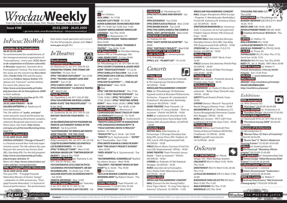 WrocławWeekly Free City Guide to Events, Music, Film, Theatre, Museum, Pubs & More Issue #188 20.03.2009 - 26.03.2009 > get more online: www.WroclawWeekly.pl > [email protected] InFocus:ThisWeek that mixes visual spectacle and concert. For the full program, please visit: http:// www.ppa.art.pl/ (PL) 06.03-22.03.2009 To commemorate the establishment of the intergovernmental organization of “Francophones,” every year, SCAC (Service de coopération et d’action culturelle) in Wrocław organizes “Journées de la Francophonie” festival. The main events this week are the concerts by Nuru Kane (SN), L’Herbe Folle (FR) and the piano recital by Frédéric Vaysse-Knitter (FR) (please see “Concerts" section below). For more info, please see: http://www.wroclawweekly.pl/index. php/journees-de-la-francophonie-2009/ or their website: http://frankofonia.wroclaw.pl (PL/FR) InTheatres Journées de la Francophonie audio_entropia 007 20.03.2009 (Friday) - 18:30 GALERIA ENTROPIA (ul. Rzeźnicza 4) Free Admissions The 7th edition of “audio_entropia" series presents sound performance by Herman Müntzing (flexichord, sampler), Johannes Bergmark (electronics) and Nano (toys). See more: http://www. entropia.art.pl/HermanMuntzing/intro. html (PL) Energy of Sound #4 21.03.2009-24.03.2009 ENERGIA DŹWIĘKU (“Energy of Sound”) is a festival around Neo-Folk and experimental sound. The 4th edition this year features the concerts by Univers Zero (BE), Gae Bolg (FR). For the full program: http://www.wroclawweekly.pl/index. php/energia-dzwieku-4/ More info: http://www.industrialart.eu/ index.php?go=energiadzwieku PPA: Przegląd Piosenki Aktorskiej 20.03.2009-29.03.2009 This year PPA - “Przegląd Piosenki Aktorskiej (Review of Actors’ Songs)" - celebrates its 30th anniversary. “Przegląd Piosenki Aktorskiej" is a festival of musical performance - the performance Współczesny (Contemporary) Theatre (ul. Rzeźnicza 12, tel. 071/ 358-89-22) Orkiestra TITANIC (The Titanic Orchestra) - Fri-Sun 19:15 [PPA] “Incubus-Succubus" - Sat 22:00 [PPA] “Techno Cabaret Love And Desire" - Sun 21:30 [PPA] Carve Carve! - Wed 19:00 [PPA] Kormorany “La Musica Teatrale" - Wed 21:00 Polski Theatre (ul. Zapolskiej 3, tel. 071/ 316-07-80) [PPA] Volksbühne am Rosa-Luxemburg-Platz “Die Fruchtfliege” - Fri & Sat 18:00 Polski Theatre / Kameralna (ul. Świdnicka 28, tel. 071/ 316-07-52) Mayday (Run for Your Wife!) - Fri 16:00 20 najśmieszniejszych piosenek na świecie (20 Funniest Songs In The World) - Sat & Sun19:00 “Gastronomia" by Wrocław Pantomime Theatre - Tue-Thu 19:00 Polski Theatre / Świebodzki (pl. Orląt Lwowskich 20c, tel. 071/ 341-29-54) Cząstki elementarne (Les particules élémentaires) - Fri 19:00 [PPA] “O’Malley’s Bar" - Mon 21:00 Nirvana (Based on “Tibetan Book of Death") - Wed & Thu 19:00 Komedia Theatre (pl. Teatralny 4, tel. 071/ 316-07-78 thru -80) Psychoterapia czyli seks w życiu człowieka (Psychotherapy, or sex in human life) - Fri 20:00; Sun 17:00 Szalone Nożyczki (Scherenschnitt) - Sat 20:00 Zemsta (Revenge) - Mon 12:00 Lalek (Puppet) Theatre (pl. Teatralny 4, tel. 071/ 344-76-77, 344-12-16) Ostatnia Ucieczka (Last Escape) - Sat 18:00 >> For Children: Och, Emil! - Fri 17:30 Mozart listy pisze - Fri 10:30 Konik Garbusek (Hunchbacked Horse) - Fri 10:00; Sat 15:00; Sun 11:00 Legendy Wrocławskie (Wrocław Legends) - Tue-Thu 10:00 Impart (ul. Mazowiecka 17) [PPA] Maria Peszek “Maria Awaria" Mon 22:00 [PPA] Krystyna Janda “Piosenki z teatru" - Tue 18:30, 21:00 Ad Spectatores (At The Main Railway Station PKP, ul. Piłsudskiego 103) 1408: seans ciszy - Fri-Sun 20:00 CAPITOL Musical Theatre (ul. Piłsudskiego 67, tel. 071/789-04-00) [PPA] Cezary Studniak & Leszek Możdżer “Takotojestitako" - Fri 22:30 [PPA] Camille O’Sullivan - Sat 21:00 [PPA] Bang on a Can All-Stars & Iva Bittová - Sun 19:00 [PPA] Edyta Geppert “… i tak 25 lat przeleciało" - Mon 18:00 > Also: [PPA] “Jak oni słuchają" - Thu 17:30, 20:30 // [PPA] “Miasto spotkań" - Sat 17:00, 19:00 // [PPA] “Wylewka" - Sun 17:00, 20:00 // [PPA] “Spektakl dźwiękowy" - Mon 18:00, 20:00 // [PPA] “Kosmiczni Chłopcy" - Tue 18:00, 21:00 ARKA Theatre (ul. Mennicza 3) Czarodziejski świat (Tales of Charles Perrault) [musical] - Fri 10:00 OPERA Wrocławska (ul. Świdnicka35) “Rękopis znaleziony w Saragossie (The Saragossa Manuscript)" & “Figle szatana (Devil’s Frolics)" [ballet] - Fri 19:00 “Rigoletto" by G. Verdi - Sat 19:00 “Hagith" by K. Szymanowski + “Ester" by T. Praszczałka - Sun 17:00 [PPA] Bente Kahan & Carolyn Dorfman “The Legacy Project: Echoes" - Mon 20:00 “Król Roger" by K. Szymanowski - Tue 19:00 “Aschenbrödel (Cinderella)" [ballet] by Johann Strauss - Wed 19:00 “Falstaff / The Merry Wives of Windsor" by G. Verdi - Thu 19:00 >> For Children: “Alicja w Krainie Czarów (Alice in Wonderland)" by Robert Chauls - Thu 11:00 SONG THEATRE (Teatr Piosenki / ul. Mazowiecka 17, tel.071/341-76-94) [PPA] “Leningrad" - Wed 19:00 Contact: Wrocław Tourist Information Center, Rynek 14, 50-101 Wrocław, tel. (+48 71) 344 31 11 OŚRODEK (ul. Piłudskiego 67) [PPA] Patti Plinko And Her Boy - Sat 23:00 [PPA] Dick4Dick - Sun 23:00 [PPA] Świetlicki & Paulus - Mon 23:00 [PPA] Baaba Kulka - Tue 23:00 [PPA] The Complainer & The Complainers, feat. Artur Rojek - Wed 23:00 BROWAR MIESZCZAŃSKI (ul. Hubska 44-48) [PPA] “Gazy Super Szlachetne" - Tue 20:00 [PPA] “Vertinsky Project" - Wed 21:00 UNIVERSITY OF WROCŁAW LAW SCHOOL (ul. Uniwersytecka 7/10, D Building) [PPA] L.U.C. “Planet LUC" - Fri 21:00 Concerts Friday 20th FIRLEJ (ul. Grabiszyńska 56) Frontside & The Supergroup (Hardcore/Metal: 30/25PLN) - 19:00 WROCŁAW PHILHARMONIC CONCERT HALL (ul. Piłsudskiego 19) Radosław Pujanek (violin) & Wrocław Philharmonic Orchestra - Program: W. Lutosławski/S. Prokofiev/F. Mendelssohn-Bartholdy (Classical: 40/25PLN) - 19:00 SONG THEATRE (Teatr Piosenki / ul. Mazowiecka 17) Janusz Radek - “Dom za