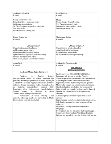 Aleksandra Dudzik Klasa I Rafał Pazdur Klasa I Kiedy smutno mi i źle Przyjdzie Ktoś i pocieszy mnie! Jeśli masz zmartwienie W Ojcu Świętym znajdziesz ukojenie. Nie martw się Bo On zawsze z Tobą jest. Ojcze Uśmiechnięty Ojcze Święty, Tyś Patronem szkoły mej, Wspieraj w nauce dzieci swoje, O to my prosimy Cię! Kinga Szczerba Klasa II Małgorzata Łabuz Klasa II ,,Ojcze Święty” Ojcze Święty, nasz kochany, pobłogosław moje plany, abym przyjęła Komunię Świętą i przez to stała się lepszą i uśmiechniętą. Bardzo modlę się za Ciebie, choć wiem, że jest Ci dobrze w niebie. ,,Ojcze Święty...” Ojcze Święty choć odszedłeś, nadal bardzo Cię kochamy. Byłeś dla nas wskazówką I o Twoim nauczaniu pamiętamy. Anna Woś Klasa III Aleksandra Staniszewska Klasa III Jan Paweł II jakiego pamiętamy Kochany Ojcze Janie Pawle II ! Dopiero po Twojej śmierci uświadomiłam sobie, że miłość powinna być głoszona bardziej czynem niż słowem. Byłeś jak „ KSIĘGA”, z której wypływała miłość, troska o: rodziny, dzieci, młodzież, ludzi, chorych, pokój na świecie, sprawiedliwy podział dóbr. Pragnąłeś, także zjednoczenia chrześcijaństwa. Jestem pewna, że siedzisz w oknie ”Domu Pana” i błogosławisz nam. Powierzam Ci nasze rodziny i nas samych. Obiecuję modlić się za Ciebie do Matki Bożej, którą sam tak ukochałeś. Jan Paweł II był POLSKIM PAPIEŻEM. Pamiętam jak kochał tą polską Ziemię. Nieraz wspominał o wadowickich kremówkach, Często opowiadał o swoich wędrówkach. Papież na pewno tęsknił za polskimi górami. Marzył, by przejść się jeszcze naszymi lasami. Starał się bardzo, aby ludzie Go zrozumieli, Więc jeździł po świecie, by Jego nauki słyszeli. Spotkał się z młodzieżą, by ich problemy omówić. A młodzi przy nim nie wstydzili się o nich mówić. Papież szukał sposobów, żeby ludzi zjednoczyć, Gdy Papież umierał, to sami postanowili się połączyć. Zrobili to z wdzięczności do Jana Pawła Drugiego, By wiedział ,że nie na darmo były nauki Jego. Teraz wszystkim brakuje Wielkiego Papieża I nie da się pogodzić z myślą, że Jego już nie ma. Bernadeta Jachowicz Kl. II Piotrze naszych czasów Piotrze naszych czasów Wybierz się z nami do górskich lasów. Wędruj znanymi szlakami i prowadź nas prostymi drogami. Magdalena Zając Klasa 1 Nasz Papież Pielgrzymował po Ojczyźnie, chodząc po górskim szlaku. Często spoglądał w niebo i na ukochany Kraków. Cała Polska go kochała i modlitwami wspierała. Jego cierpienia nie budziły trwogę, lecz torowały do Boga drogę. Jego radość-naszymi radościami. Na zawsze więc niech pozostanie z nami. Monika Limanówka Klasa II Agata Pazdur Klasa V ,,Papież Polak” Gdy Cię Ojcze na Papieża wybrali, cieszyli się duzi i mali, chociaż Cię jeszcze nie znali. Pan Bóg dał nam pocieszenie, w ciężkich chwilach umocnienie. Nauczyłeś nas miłości, poszanowania ludzkiej godności. Swoim wrogom wybaczałeś, chociaż bardzo przez nich cierpiałeś. Dzisiaj już nie jesteś z nami, ale nadal Cię kochamy i o Tobie pamiętamy! „ Na zawsze w naszych sercach” Paulina Bladocha Klasa V Ojciec dzieci Kochał i kocha, Dzieci jak swoje, Odszedł tak nagle I pustka została. Dziś powracamy Myślą do niego. On także cierpiał Wszyscy się modlili o zdrowie jego. Tłumaczył tak prosto Że każdy rozumiał I w jego słowa dobrze się wczuwał. Nasz Ojciec Święty, Przecież małym dzieckiem był. Gdy wolna chwilę miał To i w piłkę sobie grał. Na kajaku pływać umiał i na nartach też zasuwał. Rowerowe rajdy miał I po górach chodził sam. Jego duszę przepojona do Chrystusa zapaloną i Matce zawierzoną. „Totus Tuus” wypowiedziane światu życiem ukazane. Na stolicy Piotrowej nie tylko urzędował, lecz jako pielgrzym po różnych krajach wędrował. Trafiał do biednych pouczał bogatych, z młodymi żartował i tak pięknie sobie malował. On nam pokazał jak cierpieć z godnością i wytrwać do końca pałając miłością. Dwudziesta pierwsza trzydzieści siedem. Papież odbiera nagrodę w niebie. Anna Zając Klasa VI b Marta Górska Kl. VI a ,,Papież pełen ducha’’ Ujrzałam dziś, jego uśmiech, który słał znad ołtarza czekającym ludziom. Choćby wszystkie miejsca w czarne rzeki zmieniły się to on wyjrzy i w deszczu, i w słońcu, aby dać świadectwo prawdy, Drzewo życia. Sakramentalną moc On pokazał, świat wziąwszy w dłoń, Dla słowiańskiego oto Papieża, był otwarty tron. Przyszła jednak taka chwila swoje całe życie złożyłeś w ręce Boga. Był ból serca, płacz, smutek i trwoga. Zamknęła się biała księga Twoich cierpień i radości. Poszedłeś, więc do nieba w chwale i czystości. Nam zostanie pamięć, wiara, wspomnienia i myśl, że Cię z mami nie ma. Jan Paweł II Był z nami i koło nas Nawet w najgorszy czas Kochał świat cały i pokazywał jaki jest wspaniały. Smutek, radość, kochanie i wzajemne się wspieranie, także prawdy głosił nam, abyśmy dotarli do niebios bram. Aneta Pazdur Kl. VIa „Ojciec Święty odszedł do domu Ojca...” Ta wiadomość przeszyła bólem serca Wiele tysięcy ludzi na całym świecie nie spodziewała się, że pożegna Ciebie. Jednak każdy z nas wie, że Twoja wędrówka na ziemi zakończyła się. My kiedyś dołączymy do Ciebie i modlić się będziemy w potrzebie. Magdalena Puto Klasa V Patrycja Spisak Klasa V Wspomnienie Kochany Ojcze Święty Ten wiersz napisałam, Bo bardzo dużo myślałam, Jak to było, gdy On żył I z nami wspólnie był. Gdy Papieżem zostałeś, Imię Jan Paweł II wybrałeś; I o pełnieniu funkcji Sługi Bożego Sam zadecydowałeś. Kochał ludzi, Zwierzęta, rośliny. Kochał też sport I wszystkie jego dyscypliny. Gdy postrzelił Cię zamachowiec, Chciałeś się z nim zobaczyć, Żeby później jego ciężki Grzech mu wybaczyć. I nawet Anioł Pański Inaczej brzmiał, Gdy na placu świętego Pio