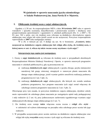 Wyjaśnienie w sprawie nauczania języka niemieckiego w Szkole Podstawowej im. Jana Pawła II w Mętowie. I. Obliczanie średniej ocen z zajęć edukacyjnych. Zgodnie z § 20 ust. 4a rozporządzeniem MEN z dnia 30 kwietnia 2007 roku w sprawie warunków i sposobu oceniania, klasyfikowania i promowania uczniów i słuchaczy oraz przeprowadzania sprawdzianów i egzaminów w szkołach publicznych (Dz. U. z 2007 r. Nr 83, poz. 562 z późn. zm.) do średniej ocen wliczane są dodatkowe obowiązkowe zajęcia edukacyjne oraz religia lub etyka (jeżeli uczeń na nie uczęszcza). Powyższe rozporządzenie wprowadziło w 2007 roku następujące zmiany: W § 20, w którym po ust. 4 dodaje się ust. 4a w brzmieniu: „Uczniowi, który uczęszczał na dodatkowe zajęcia edukacyjne lub religię albo etykę, do średniej ocen, o której mowa w ust. 4, wlicza się także roczne oceny uzyskane z tych zajęć.” Interpretacja tego zapisu jest następująca: 1. Oceny z zajęć dodatkowych są wliczane do średniej ocen w przypadkach określonych Rozporządzeniem Ministra Edukacji Narodowej i Sportu. w sprawie ramowych programów nauczania w szkołach publicznych tj. gdy są przeznaczone na: a) realizację dodatkowych zajęć edukacyjnych z języka obcego, języka mniejszości narodowej lub grupy etnicznej, nieujętych w ramowym planie nauczania dla danego etapu edukacyjnego, jeżeli wymiar godzin umożliwia realizację podstawy programowej (§ 2 ust. 5 pkt. 2), b) realizację dodatkowych zajęć edukacyjnych, dla których nie została ustalona podstawa programowa, lecz program nauczania tych zajęć został włączony do szkolnego zestawu programów nauczania (§ 2 ust. 5 pkt. 2). Obowiązuje przy tym zasada, że powyższe dodatkowe zajęcia edukacyjne, dyrektor szkoły może wprowadzić do szkolnego planu nauczania po zasięgnięciu opinii rady pedagogicznej i rady rodziców (§ 2 ust. 6), przy jednoczesnym zachowaniu tygodniowego wymiaru zajęć edukacyjnych dla danego etapu edukacyjnego (§ 2 ust. 7). 2. Do średniej ocen zostaje także włączona ocena roczna z religii albo etyki – w zależności od wyboru dokonanego na początku roku szkolnego przez ucznia lub jego rodziców. 3. W przypadku uczęszczania przez ucznia zarówno na dodatkowe zajęcia edukacyjne oraz religię lub etykę wszystkie oceny roczne z tych zajęć są wliczane do średniej ocen. II. Nauka języka niemieckiego w roku szkolnym 2013/2014 Nauczanie języka niemieckiego jako przedmiotu dodatkowego obowiązkowego w szkole podstawowej wynika z rozporządzenia w sprawie ramowych planów nauczania. Obecnie w szkole podstawowej jednocześnie funkcjonują dwa różne rozporządzenia. Dla dzieci urodzonych w roku 2001 i 2000 (w roku szkolnym 2012/2013 uczęszczających odpowiednio do klasy V i VI) obowiązuje Rozporządzeniem Ministra Edukacji Narodowej i Sportu z dnia 12 lutego 2002 r. w sprawie ramowych programów nauczania w szkołach publicznych (Dz. U. Nr 15, poz. 142 ze zmianami). Zgodnie z § 2 ust. 5 cytowanego rozporządzenia „Godziny do dyspozycji dyrektora szkoły, z uwzględnieniem realizacji zajęć, o których mowa w ust. 9, mogą być przeznaczone na: 1) zwiększenie. liczby godzin obowiązkowych zajęć edukacyjnych, 2) realizację dodatkowych zajęć edukacyjnych z języka obcego; języka mniejszości narodowej lub grupy etnicznej, nieujętych w ramowym planie nauczania dla danego etapu edukacyjnego, jeżeli wymiar godzin umożliwia realizację podstawy programowej albo dodatkowych zajęć edukacyjnych, dla których nie została ustalona podstawa programowa, lecz program nauczania tych zajęć został włączony do szkolnego zestawu programów nauczania, 3) realizację ścieżek edukacyjnych, obejmujących zestaw treści i umiejętności o istotnym znaczeniu wychowawczym, których realizacja może odbywać się w ramach nauczania przedmiotów lub bloków przedmiotowych, o których mowa w § 3 ust. 10, lub w postaci odrębnych zajęć, 4) zorganizowanie zajęć dla grupy uczniów, z uwzględnieniem ich potrzeb i zainteresowań, w tym zajęć dydaktyczne-wyrównawczych, 5) nauczanie historii i geografii kraju pochodzenia mniejszości narodowych i dziedzictwa kulturowego grup etnicznych - w szkołach z nauczaniem języka mniejszości narodowych lub grup etnicznych.” Dlatego dyrektor szkoły mógł przeznaczyć tzw. „godziny do dyrektora szkoły” na wprowadzenie w szkole podstawowej dodatkowych obowiązkowych zajęć z języka niemieckiego. Natomiast dla uczniów uczących się w roku szkolnym 2012/2013 w klasach IV obowiązuje rozporządzenie MEN z dnia 22 lutego 2012 r. w sprawie ramowych planów nauczania (Dz. U. z 2012 r. poz. 204). Zgodnie z § 2 ust. 5 lit. a w/w rozporządzenia tzw. „Godziny do dyspozycji dyrektora” można przeznaczyć tylko i wyłącznie na zwiększenie liczby godzin wybranych obowiązkowych zajęć edukacyjnych. Natomiast wykaz obowiązkowych zajęć edukacyjnych dla klas IV – VI szkoły podstawowej znajduje się w Załączniku nr 1 do cytowanego rozporządzenia pkt. 2 ust. 1. Wobec powyższego dyrektor szkoły nie może wprowadzić jako obowiązkowych zajęć edukacyjnych dodatkowego języka obcego (tj. języka niemieckiego). W szkole podstawowej funkcjonuje tylko i wyłącznie jeden język obcy nowożytny. W naszej placówce jest to język angielski.