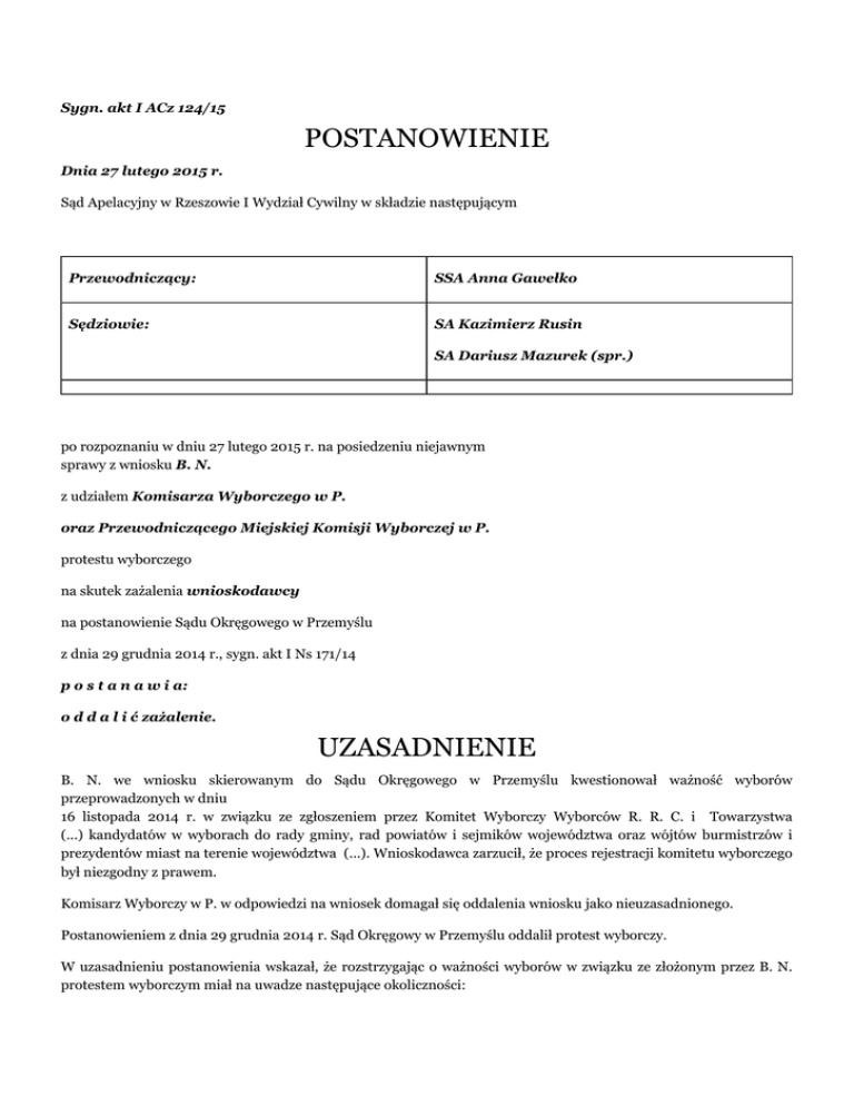 Sygn. akt I ACz 124/15 POSTANOWIENIE Dnia 27 lutego 2015 r. Sąd Apelacyjny w Rzeszowie I Wydział Cywilny w składzie następującym Przewodniczący: SSA Anna Gawełko Sędziowie: SA Kazimierz Rusin SA Dariusz Mazurek (spr.) po rozpoznaniu w dniu 27 lutego 2015 r. na posiedzeniu niejawnym sprawy z wniosku B. N. z udziałem Komisarza Wyborczego w P. oraz Przewodniczącego Miejskiej Komisji Wyborczej w P. protestu wyborczego na skutek zażalenia wnioskodawcy na postanowienie Sądu Okręgowego w Przemyślu z dnia 29 grudnia 2014 r., sygn. akt I Ns 171/14 p o s t a n a w i a: o d d a l i ć zażalenie. UZASADNIENIE B. N. we wniosku skierowanym do Sądu Okręgowego w Przemyślu kwestionował ważność wyborów przeprowadzonych w dniu 16 listopada 2014 r. w związku ze zgłoszeniem przez Komitet Wyborczy Wyborców R. R. C. i Towarzystwa (...) kandydatów w wyborach do rady gminy, rad powiatów i sejmików województwa oraz wójtów burmistrzów i prezydentów miast na terenie województwa (...). Wnioskodawca zarzucił, że proces rejestracji komitetu wyborczego był niezgodny z prawem. Komisarz Wyborczy w P. w odpowiedzi na wniosek domagał się oddalenia wniosku jako nieuzasadnionego. Postanowieniem z dnia 29 grudnia 2014 r. Sąd Okręgowy w Przemyślu oddalił protest wyborczy. W uzasadnieniu postanowienia wskazał, że rozstrzygając o ważności wyborów w związku ze złożonym przez B. N. protestem wyborczym miał na uwadze następujące okoliczności: Wnioskodawca B. N. jest wyborcą i był uprawniony na podstawie art. 82 ustawy Kodeks wyborczy do złożenia wniosku o stwierdzenie nieważności wyborów. Sąd Okręgowy rozważył, że przedmiotem protestu była ważność wyborów, które to pojęcie należało interpretować szeroko, nie tylko jako akt zbiorowej woli wyborców prowadzącej do wyłonienia organów władzy, ale również jako procedurę, która wyrażenie tej woli umożliwia. Sąd ocenił, że pojęcie ważności wyborów należy rozumieć jako odnoszące się do wszystkich elementów składających się na postępowanie wyborcze i decydujące o jego prawomocności. Na tej podstawie ocenił, że przedmiotem protestu może być również procedura zawiadomienia i przyjęcia zawiadomienia o utworzeniu komitetu wyborczego. Sąd Okręgowy wskazał, że będący przedmiotem rozpoznania protest wyborczy oparty był o zarzut naruszenia art. 97 w związku z art. 95 § 3 ustawy Kodeks wyborczy oraz, że nie zachodziły podstawy do pozostawienia protestu bez rozpoznania. Rozważając zasadność żądania wnioskodawcy o stwierdzenie nieważności wyborów Sąd Okręgowy wskazał, że oparł rozstrzygnięcie o następujące ustalenia faktyczne: W dniu 27 sierpnia 2014 r. złożone została zawiadomienie o utworzeniu Komitetu Wyborczego Wyborców R. R. C. i Towarzystwa (...). Do zawiadomienia dołączono oświadczenie o utworzeniu komitetu wyborczego wyborców, wykaz obywateli popierających utworzenie komitetu wyborczego w wymaganej liczbie oraz inne dokumenty wymagane formalnie do przyjęcia zawiadomienia. Postanowieniem z dnia 27 sierpnia 2014 r. Komisarz Wyborczy w P. przyjął zawiadomienie dokonane przez Komitet Wyborczy Wyborców R. R. C. i Towarzystwa (...). Sąd Okręgowy ustalił, że na skutek wszczęcia przez Komisarza Wyborczego w P. stosownej procedury i po mediacji przeprowadzonej z Komitetem Wyborczym Wyborców R. R. C. i Towarzystwa (...) zmieniono nazywają komitetu wyborczego na Komitet Wyborczy Wyborców R. P. dla P.. Postanowieniem z dnia 19 września 2014r. Komisarz Wyborczy w P. zmienił własne postanowienie z dnia 27 sierpnia 2014r. na podstawie art. 95 § 1 ustawy Kodeks wyborczy określając nową nazwę i skrót komitetu jako „Komitet Wyborczy Wyborców R. P. dla P.” i (...). Ponadto poprzednio wydane postanowienie pozostawił w mocy w pozostałym zakresie, jak również pozostawił w mocy czynności podjęte przez komitet wyborczy przed wydaniem postanowienia. W związku z opisaną sytuacją - jak ustalił Sąd Okręgowy - Komisarz Wyborczy w P. udzielał w trybie udostępnienia informacji publicznej informacji wraz z wyjaśnieniami z dotyczącymi okoliczności zmiany nazwy komitetu wyborczego. W oparciu o takie ustalenia Sąd Okręgowy rozważył, że z przepisów dotyczących procedury stwierdzenia nieważności zawartych w ustawie Kodeks wyborczy wynika, że skuteczność złożonego protestu wyborczego uzależnione jest nie od wykazania naruszenia przepisów, ale od naruszenia mającego wpływ na wynik wyborów. Analizując przepisy dotyczące zawiadomienia i przyjmowania zawiadomienia o powstaniu komitetu wyborczego lub Sąd Okręgowy ocenił, że Komitet Wyborczy Wyborców R. C. utworzony został zgodnie z art. 89 § 1 ustawy kodeks wyborczy przez co najmniej piętnastu obywateli. Zawiadomieniu o utworzeniu komitetu zostało dokonane przed upływem ustawowego terminu. Osoby dokonujące zgłoszenia powstania komitetu spełniły wszystkie formalnie wymagane przez ustawę wymogi do rejestracji, za wyjątkiem oznaczenia nazwy komitetu. Bowiem nazwa Komitetu Wyborczego Wyborców R. C. zgłoszonego w wyborch samorządowych 2014 roku częściowo pokrywała się z nazwą zarejestrowanego w sądowym rejestrze stowarzyszeń Stowarzyszenia dla P. (...). Analizując procedurę oceny zgodności nazwy komitetu wyborczego z przepisami ustawy kodeks wyborczy Sąd Okręgowy ocenił, że przyjmując zawiadomienie o powstaniu komitetu - mimo zaistnienia wady w postaci nieprawidłowej nazwy - umożliwiało dokonanie stosownych korekt w ramach procedury zgłoszenia w trybie art. 97 § 1 ustawy Kodeks wyborczy. Czynności te Komisarz Wyborczy podjął po upływie terminu do dokonania zgłoszenia komitetów wyborczych wydając postanowienie w dniu 19 września 2014 r. Jednak w ocenie Sądu Okręgowego upływ tego terminu w nie miał istotnego znaczenia dla przyjęcia wpływu tego uchybienia na ważność wyborów, bowiem również w przypadku zastosowania procedury
