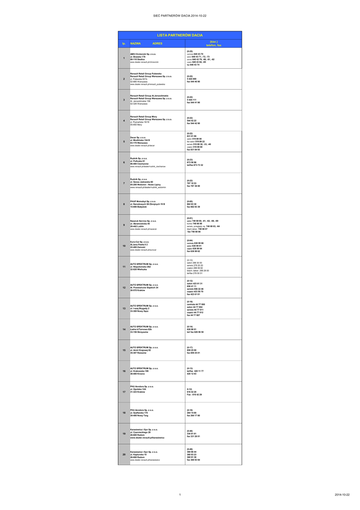 SIEĆ PARTNERÓW DACIA 2014-10-22 LISTA PARTNERÓW DACIA lp. NAZWA (kier.) telefon, fax ADRES (0-25) 1 640 43 70 salon 640 43 71, -72, -73 serwis 640 43 79, -80, -81, -82 części 640 43 84, -85 fax 640 43 74 AMS Chróścicki Sp. z o.o. ul. Brzeska 178 08-110 Siedlce centrala www.dealer.renault.pl/chroscicki 2 Renault Retail Group Puławska Renault Retail Group Warszawa Sp. z o.o. ul. Puławska 621b 02-885 Warszawa (0-22) 5 444 000 fax 544 40 90 www.dealer.renault.pl/renault_pulawska 3 Renault Retail Group Al.Jerozolimskie Renault Retail Group Warszawa Sp. z o.o. Al. Jerozolimskie 156 02-326 Warszawa (0-22) 5 444 111 fax 544 41 90 4 Renault Retail Group Mory Renault Retail Group Warszawa Sp. z o.o. ul. Poznańska 16/18 05-850 Mory (0-22) 544 42 22 fax 544 42 90 5 (0-22) 831 01 99 salon 519 89 00 fax salon 519 89 22 serwis 519 89 30, -33, -40 części 519 89 60 fax 831 64 93 Decar Sp. z o.o. ul. Modlińska 154 B 03-170 Warszawa www.dealer.renault.pl/decar 6 Rudnik Sp. z o.o. ul. Pułtuska 61 06-400 Ciechanów (0-23) 673 56 96 tel/fax 673 73 32 www.renault.pl/dealer/rudnik_ciechanow 7 Rudnik Sp. z o.o. ul. Szosa Jadowska 60 05-200 Wołomin - Nowe Lipiny www.renault.pl/dealer/rudnik_wolomin (0-22) 787 10 53 fax 787 36 00 8 PHUP Motozbyt Sp. z o.o. ul. Narodowych Sił Zbrojnych 19 B 15-690 Białystok (0-85) 662 83 30 fax 662 83 39 9 (0-81) salon 748 68 60, -61, -62, -68, -69 komis 748 66 88 serwis, przeglądy rej. 748 68 63, -64 blach.lakier. 748 68 67 fax 748 68 66 Nazaruk Service Sp. z o.o. ul. Abramowicka 45 20-442 Lublin www.dealer.renault.pl/nazaruk 10 (0-84) Euro-Car Sp. z o.o. Al.Jana Pawła II 2 22-400 Zamość 638 99 66 638 99 61 części 638 99 64 fax 638 99 62 centrala salon www.dealer.renault.pl/eurocar AUTO SPEKTRUM Sp. z o.o. ul. Niepołomska 26d 32-020 Wieliczka (0-12) salon 288 30 00 serwis 278 20 20 części 288 06 82 blach.-lakier. 288 28 00 tel/fax 278 50 51 AUTO SPEKTRUM Sp. z o.o. Al. Powstańców Sląskich 24 30-570 Kraków (0-12) salon 423 61 31 656 41 11 serwis 656 22 46 części 423 50 70 fax 423 61 01 13 AUTO SPEKTRUM Sp. z o.o. ul. I-szej Brygady 2 33-300 Nowy Sącz (0-18) centrala 44 77 000 salon 44 77 004 serwis 44 77 011 części 44 77 012 fax 44 77 007 14 AUTO SPEKTRUM Sp. z o.o. Ładna k/Tarnowa 82b 33-156 Skrzyszów (0-14) 626 96 01 tel/ fax 626 96 50 15 AUTO SPEKTRUM Sp. z o.o. ul. Armii Krajowej 82 35-307 Rzeszów (0-17) 859 25 00 fax 859 25 01 16 AUTO SPEKTRUM Sp. z o.o. ul. Krakowska 199 38-400 Krosno (0-13) tel/fax 420 11 77 420 12 93 11 12 17 PHU Anndora Sp. z o.o. ul. Opolska 12A 31-323 Kraków 0-12) 616 42 20 Fax : 616 42 29 18 PHU Anndora Sp. z o.o. ul. Szaflarska 170 34-400 Nowy Targ (0-18) 264 14 80 fax 264 17 80 19 Karasiewicz i Syn Sp. z o.o. ul. Czarnieckiego 28 26-600 Radom www.dealer.renault.pl/karasiewicz (0-48) 330 81 81 fax 331 28 01 Karasiewicz i Syn Sp. z o.o. ul. Kapturska 10 26-600 Radom (0-48) 360 86 44 360 83 23 360 91 38 fax 369 93 94 20 www.dealer.renault.pl/karasiewicz 1 2014-10-22 SIEĆ PARTNERÓW DACIA 2014-10-22 LISTA PARTNERÓW DACIA lp. NAZWA (kier.) telefon, fax ADRES (0-41) 343 57 00 salon 343 57 57 serwis 343 57 77 części 343 57 67 fax 343 57 11 21 Tandem Sp. z o.o. ul. Transportowców 16 25-672 Kielce www.renault.pl/dealer/tandem_kielce 22 Tandem Sp. z o.o. ul. Czeladzka 67 42-500 Będzin www.dealer.renault.pl/tandem (0-32) 267 27 67 fax 267 27 66 23 Tandem Sp. z o.o. ul. Krótka 16 42-200 Częstochowa (0-34) 366 91 66 fax 366 91 70 24 Łukasik Sp. z o.o. ul. Kilińskiego 32a 19-300 Ełk www.renault.pl/dealer/lukasik (0-87) 621 78 88 fax 621 78 89 25 Alcar Sp. z o.o. ul. Lubelska 39a 10-408 Olsztyn www.renault.pl/dealer/alcar (0-89) 533 53 93 fax 539 90 46 26 PHU Ossowscy Sp. z o.o. Kazimierzowo 7a 82-300 Elbląg www.renault.pl/dealer/ossowscy (0-55) 232 70 75 232 62 37 fax 232 61 76 Adamowscy Sp. z o.o. ul. Szosa Toruńska 29A 86-300 Grudziądz (0-56) 463 57 05 463 57 70 fax 463 58 10 27 recepcja www.renault.pl/dealer/adamowscy_grudziadz 28 (0-58) 563 33 33 serwis wew. 23 części wew. 31 fax 562 77 60 Adamowscy Sp. z o.o. ul. Zblewska 33 83-200 Starogard Gd. www.renault.pl/dealer/adamowscy_starogard (0-52) 29 360 25 60 salon 360 25 51, -52, -53, -54 części 360 25 55, -56 serwis 360 25 40, -41 fax 320 93 95 recepcja P.W.Uni-Car S.A. ul. Modrzewiowa 7 85-631 Bydgoszcz www.dealer.renault.pl/unicar 30 (0-54) 411 09 00 411 09 01 fax 411 09 02 Auto - Serwis Pasikowski Sp. z o.o. ul. Polna 100 87-800 Włocławek www.dealer.renault.pl/pasikowski 31 Auto - Serwis Pasikowski Sp. z o.o. ul. Bielska 70 09-402 Płock (0-24) 267 94 80 fax 267 94 80 www.dealer.renault.pl/pasikowski 32 Opaliński Sp. z o.o. ul. Słupska 5 76-251 Bolesławice k/Słupska (0-59) 841 53 32 tel/fax 841 53 47 www.dealer.renault.pl/opalinski 33 Franciszek Dubnicki Sp. z o.o. ul. Gnieźnieńska 81 75-736 Koszalin www.renault.pl/dealer/dubnicki (0-94) centrala 347 14 20 salon 347 14 21 - 25 fax salon 347 14 30 części 347 14 28 serwis 347 14 27, 347 14 31 34 Auto-Compol S.A. ul. Rivoliego 2b 62-030 Luboń k/Poznania (0-61) 810 21 30 salon 813 08 17 serwis fax 810 22 95 35 (0-61) 858 11 50 sekretariat 858 11 60 salon 858 11 70 serwis 858 11 80 części zam. 858 11 85 serwis karoseria 858 11 71 stacja kontroli poj. fax 852 47 25 Auto-Compol S.A. ul. Kazimierza Wlk. 1 61-863 Poznań www.dealer.renault.pl/auto_compol 36 (0-95) 759 00 39 755 00 40 fax 758 10 58 DA-KO Kozubal Sp. z o.o. ul. Wojska Polskiego 71 69-100 Słubice www.dealer.renault.pl/dako (0-95) 37 centrala 720 20 90 728 43 11 serwis 728 43 14 części 728 43 18 fax 728 43 16 DA-KO Kozubal Sp. z o.o. Al. 11-go Listopada 5 66-400 Gorzów Wlkp. salon www.dealer.renault.pl/dako 38 39 40 www.dealer.renault.pl/pieluszyńska (0-61) salon 847 44 32 serwis 848 49 34 fax 847 76 74 Pieluszyńska Sp. z o.o. ul. Obornicka 137 62-002 Suchy Las k/Poznania (0-61) 811 60 61 fax 811 61 17 Pieluszyńska Sp. z o.o. ul. Kościelna 58 60-539 Poznań "Rosiak i Syn" Sp. z o.o. ul. Poznańska 168/170 62-052 Komorniki k/Poz