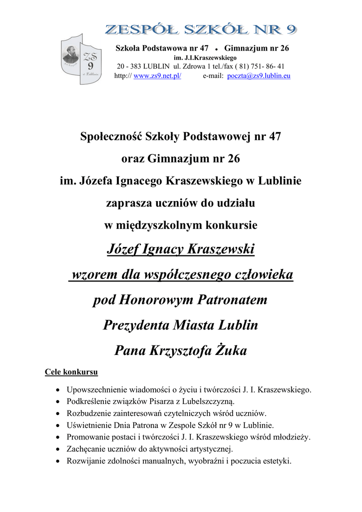 Szkoła Podstawowa nr 47 ● Gimnazjum nr 26 im. J.I.Kraszewskiego 20 - 383 LUBLIN ul. Zdrowa 1 tel./fax ( 81) 751- 86- 41 http:// www.zs9.net.pl/ e-mail: [email protected] Społeczność Szkoły Podstawowej nr 47 oraz Gimnazjum nr 26 im. Józefa Ignacego Kraszewskiego w Lublinie zaprasza uczniów do udziału w międzyszkolnym konkursie Józef Ignacy Kraszewski wzorem dla współczesnego człowieka pod Honorowym Patronatem Prezydenta Miasta Lublin Pana Krzysztofa Żuka Cele konkursu Upowszechnienie wiadomości o życiu i twórczości J. I. Kraszewskiego. Podkreślenie związków Pisarza z Lubelszczyzną. Rozbudzenie zainteresowań czytelniczych wśród uczniów. Uświetnienie Dnia Patrona w Zespole Szkół nr 9 w Lublinie. Promowanie postaci i twórczości J. I. Kraszewskiego wśród młodzieży. Zachęcanie uczniów do aktywności artystycznej. Rozwijanie zdolności manualnych, wyobraźni i poczucia estetyki. Szkoła Podstawowa nr 47 ● Gimnazjum nr 26 im. J.I.Kraszewskiego 20 - 383 LUBLIN ul. Zdrowa 1 tel./fax ( 81) 751- 86- 41 http:// www.zs9.net.pl/ e-mail: [email protected] Promowanie młodych talentów plastycznych poprzez umożliwienie prezentacji twórczości dzieci i młodzieży szerszemu kręgowi odbiorców. Wymiana doświadczeń i rozszerzenie zakresu wiedzy autorów prac na temat różnych technik plastycznych. Kategoria historyczno- literacka Uczestnicy konkursu Konkurs jest adresowany do uczniów klas IV-VI szkół podstawowych. Zasady uczestnictwa w konkursie Konkurs ma charakter drużynowy. Szkołę biorącą udział w konkursie reprezentuje zespół składający się z trzech uczniów. Zespół odpowiada na pytania konkursowe dotyczące życia i twórczości Pisarza przygotowane przez organizatora w zakresie wyznaczonym w bibliografii. Termin zgłaszania drużyn upływa 6 lutego 2017 r. Konkurs odbędzie się 20 marca 2017 r. w budynku Zespołu Szkół nr 9 przy ul. Zdrowej 1 w Lublinie. Laureaci konkursu otrzymają dyplomy i nagrody rzeczowe. Zgłoszenia do konkursu należy przesłać drogą pocztową pod adres: Zespół Szkół nr 9 im. J. I. Kraszewskiego, ul. Zdrowa 1, 20-383 Lublin. Na kopercie należy dopisać „Józef Ignacy Kraszewski wzorem dla współczesnego człowieka”. Formularz można przesłać również drogą elektroniczną na adres: [email protected] . W zgłoszeniu należy podać nazwę i adres szkoły, imiona i nazwiska oraz klasę uczniów wchodzących w skład drużyny, imię i nazwisko nauczyciela przygotowującego uczniów do konkursu, numer telefonu Szkoła Podstawowa nr 47 ● Gimnazjum nr 26 im. J.I.Kraszewskiego 20 - 383 LUBLIN ul. Zdrowa 1 tel./fax ( 81) 751- 86- 41 http:// www.zs9.net.pl/ e-mail: [email protected] kontaktowego oraz adres e-mail. Formularz zgłoszeniowy zamieszczony jest w załączniku nr 1. Biogram „Nasz patron : Józef Ignacy Kraszewski. Biografia pisarza i jej miejsce w epoce” zostanie przesłany drogą elektroniczną szkołom deklarującym udział w konkursie. Bibliografia Biogram: Nasz patron: Józef Ignacy Kraszewski. Biografia pisarza i jej miejsce w epoce. J. I. Kraszewski, Stara baśń, wyd. „GREG”, Kraków 2010 – fragmenty: 1. Obyczaj zakładania grodu. Tom III, rozdział IX, s. 248-249. 2. Obyczaj - wesele. Tom III, rozdział III, s. 197-200. Kontakt w sprawach związanych z organizacją konkursu: Joanna Pielechowska, tel. 605 889 884 – część historyczno- literacka Szkoła Podstawowa nr 47 ● Gimnazjum nr 26 im. J.I.Kraszewskiego 20 - 383 LUBLIN ul. Zdrowa 1 tel./fax ( 81) 751- 86- 41 http:// www.zs9.net.pl/ e-mail: [email protected] Kategoria plastyczna Temat: „Literatura pędzlem malowana- - ilustracje do utworów Józefa Ignacego Kraszewskiego” Uczestnicy konkursu Konkurs przeznaczony jest dla 3 grup wiekowych: uczniowie szkoły podstawowej klas 1 – 3 uczniowie szkoły podstawowej klas 4 – 6 uczniowie gimnazjum. Warunki uczestnictwa Prace należy opatrzyć metryczką umieszczoną na odwrocie: imię i nazwisko ucznia nazwę i adres placówki /pieczątka/ tel.; e-mail imię i nazwisko opiekuna tytuł zilustrowanego motywu, z tekstu Starej baśni Można na odwrocie pracy plastycznej dopiąć tekst, do którego uczeń wykonał ilustrację. Szkoła Podstawowa nr 47 ● Gimnazjum nr 26 im. J.I.Kraszewskiego 20 - 383 LUBLIN ul. Zdrowa 1 tel./fax ( 81) 751- 86- 41 http:// www.zs9.net.pl/ e-mail: [email protected] Prace niezgodne z regulaminem nie będą oceniane. Każdy uczestnik może wykonać tylko jedną pracę, nie przyjmujemy prac grupowych. Koszt przesyłki i jej doręczenia pokrywa nadawca. Prace przestrzenne i zbiorowego autorstwa oraz prace zwinięte w rulon lub zniszczone w wyniku niewłaściwego zapakowania nie będą brane pod uwagę. Technika wykonania Malarstwo (tempera, farba klejowa, kredki, tusz, collage), Rysunek i grafika (linoryt, drzeworyt, monotypia, techniki mieszane), Tkanina artystyczna (tkactwo, batik), Uwagi Nie przyjmujemy prac z materiałów nietrwałych i sypkich, typu: ryż, kasze, cukier, plastelina itp. Liczba nadesłanych prac plastycznych - nieograniczona. Prace plastyczne należy nadesłać w przesyłkach zabezpieczonych przed zniszczeniem. Format Nie mniejszy niż A3, Nie większy niż A2. Termin nadsyłania prac, adres 6 marca 2017 roku, adres: Zespół Szkół nr 9 ul. Zdrowa 1 20-383 Lublin Szkoła Podstawowa nr 47 ● Gimnazjum nr 26 im. J.I.Kraszewskiego 20 - 383 LUBLIN ul. Zdrowa 1 tel./fax ( 81) 751- 86- 41 http:// www.zs9.net.pl/ e-mail: [email protected] Podsumowanie konkursu plastycznego Uroczyste podsumowanie konkursu plastycznego i otwarcie wystawy nagrodzonych i wyróżnionych prac oraz wręczenie upominków. i dyplomów odbędzie się 20 marca 2017 r. w Zespole Szkół nr 9 w Lublinie. Laureaci konkursu zostaną powiadomieni o szczegółach podsumowania. Uczestnicy spoza Lublina pokrywają koszty swojej podróży i pobytu w Lublinie. Prawa organizatora Komisja powołana przez organizatorów przyzna równorzędne nagrody i wyróżnienia w trze