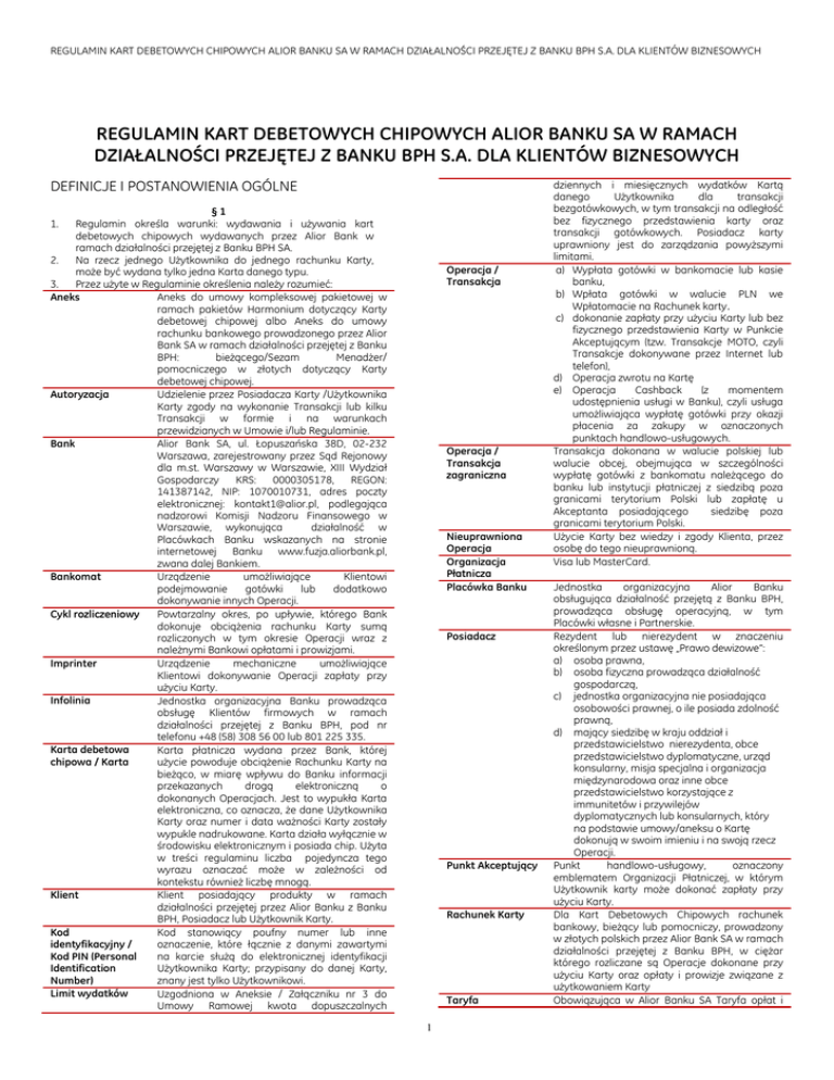 REGULAMIN KART DEBETOWYCH CHIPOWYCH ALIOR BANKU SA W RAMACH DZIAŁALNOŚCI PRZEJĘTEJ Z BANKU BPH S.A. DLA KLIENTÓW BIZNESOWYCH REGULAMIN KART DEBETOWYCH CHIPOWYCH ALIOR BANKU SA W RAMACH DZIAŁALNOŚCI PRZEJĘTEJ Z BANKU BPH S.A. DLA KLIENTÓW BIZNESOWYCH DEFINICJE I POSTANOWIENIA OGÓLNE §1 Regulamin określa warunki: wydawania i używania kart debetowych chipowych wydawanych przez Alior Bank w ramach działalności przejętej z Banku BPH SA. 2. Na rzecz jednego Użytkownika do jednego rachunku Karty, może być wydana tylko jedna Karta danego typu. 3. Przez użyte w Regulaminie określenia należy rozumieć: Aneks Aneks do umowy kompleksowej pakietowej w ramach pakietów Harmonium dotyczący Karty debetowej chipowej albo Aneks do umowy rachunku bankowego prowadzonego przez Alior Bank SA w ramach działalności przejętej z Banku BPH: bieżącego/Sezam Menadżer/ pomocniczego w złotych dotyczący Karty debetowej chipowej. Autoryzacja Udzielenie przez Posiadacza Karty /Użytkownika Karty zgody na wykonanie Transakcji lub kilku Transakcji w formie i na warunkach przewidzianych w Umowie i/lub Regulaminie. Bank Alior Bank SA, ul. Łopuszańska 38D, 02-232 Warszawa, zarejestrowany przez Sąd Rejonowy dla m.st. Warszawy w Warszawie, XIII Wydział Gospodarczy KRS: 0000305178, REGON: 141387142, NIP: 1070010731, adres poczty elektronicznej: [email protected], podlegająca nadzorowi Komisji Nadzoru Finansowego w Warszawie, wykonująca działalność w Placówkach Banku wskazanych na stronie internetowej Banku www.fuzja.aliorbank.pl, zwana dalej Bankiem. Bankomat Urządzenie umożliwiające Klientowi podejmowanie gotówki lub dodatkowo dokonywanie innych Operacji. Cykl rozliczeniowy Powtarzalny okres, po upływie, którego Bank dokonuje obciążenia rachunku Karty sumą rozliczonych w tym okresie Operacji wraz z należnymi Bankowi opłatami i prowizjami. Imprinter Urządzenie mechaniczne umożliwiające Klientowi dokonywanie Operacji zapłaty przy użyciu Karty. Infolinia Jednostka organizacyjna Banku prowadząca obsługę Klientów firmowych w ramach działalności przejętej z Banku BPH, pod nr telefonu +48 (58) 308 56 00 lub 801 225 335. Karta debetowa Karta płatnicza wydana przez Bank, której chipowa / Karta użycie powoduje obciążenie Rachunku Karty na bieżąco, w miarę wpływu do Banku informacji przekazanych drogą elektroniczną o dokonanych Operacjach. Jest to wypukła Karta elektroniczna, co oznacza, że dane Użytkownika Karty oraz numer i data ważności Karty zostały wypukle nadrukowane. Karta działa wyłącznie w środowisku elektronicznym i posiada chip. Użyta w treści regulaminu liczba pojedyncza tego wyrazu oznaczać może w zależności od kontekstu również liczbę mnogą. Klient Klient posiadający produkty w ramach działalności przejętej przez Alior Banku z Banku BPH, Posiadacz lub Użytkownik Karty. Kod Kod stanowiący poufny numer lub inne identyfikacyjny / oznaczenie, które łącznie z danymi zawartymi Kod PIN (Personal na karcie służą do elektronicznej identyfikacji Identification Użytkownika Karty; przypisany do danej Karty, Number) znany jest tylko Użytkownikowi. Limit wydatków Uzgodniona w Aneksie / Załączniku nr 3 do Umowy Ramowej kwota dopuszczalnych 1. Operacja / Transakcja Operacja / Transakcja zagraniczna Nieuprawniona Operacja Organizacja Płatnicza Placówka Banku Posiadacz Punkt Akceptujący Rachunek Karty Taryfa 1 dziennych i miesięcznych wydatków Kartą danego Użytkownika dla transakcji bezgotówkowych, w tym transakcji na odległość bez fizycznego przedstawienia karty oraz transakcji gotówkowych. Posiadacz karty uprawniony jest do zarządzania powyższymi limitami. a) Wypłata gotówki w bankomacie lub kasie banku, b) Wpłata gotówki w walucie PLN we Wpłatomacie na Rachunek karty. c) dokonanie zapłaty przy użyciu Karty lub bez fizycznego przedstawienia Karty w Punkcie Akceptującym (tzw. Transakcje MOTO, czyli Transakcje dokonywane przez Internet lub telefon), d) Operacja zwrotu na Kartę e) Operacja Cashback (z momentem udostępnienia usługi w Banku), czyli usługa umożliwiająca wypłatę gotówki przy okazji płacenia za zakupy w oznaczonych punktach handlowo-usługowych. Transakcja dokonana w walucie polskiej lub walucie obcej, obejmująca w szczególności wypłatę gotówki z bankomatu należącego do banku lub instytucji płatniczej z siedzibą poza granicami terytorium Polski lub zapłatę u Akceptanta posiadającego siedzibę poza granicami terytorium Polski. Użycie Karty bez wiedzy i zgody Klienta, przez osobę do tego nieuprawnioną. Visa lub MasterCard. Jednostka organizacyjna Alior Banku obsługująca działalność przejętą z Banku BPH, prowadząca obsługę operacyjną, w tym Placówki własne i Partnerskie. Rezydent lub nierezydent w znaczeniu określonym przez ustawę „Prawo dewizowe”: a) osoba prawna, b) osoba fizyczna prowadząca działalność gospodarczą, c) jednostka organizacyjna nie posiadająca osobowości prawnej, o ile posiada zdolność prawną, d) mający siedzibę w kraju oddział i przedstawicielstwo nierezydenta, obce przedstawicielstwo dyplomatyczne, urząd konsularny, misja specjalna i organizacja międzynarodowa oraz inne obce przedstawicielstwo korzystające z immunitetów i przywilejów dyplomatycznych lub konsularnych, który na podstawie umowy/aneksu o Kartę dokonują w swoim imieniu i na swoją rzecz Operacji. Punkt handlowo-usługowy, oznaczony emblematem Organizacji Płatniczej, w którym Użytkownik karty może dokonać zapłaty przy użyciu Karty. Dla Kart Debetowych Chipowych rachunek bankowy, bieżący lub pomocniczy, prowadzony w złotych polskich przez Alior Bank SA w ramach działalności przejętej z Banku BPH, w ciężar którego rozliczane są Operacje dokonane przy użyciu Karty oraz opłaty i prowizje związane z użytkowaniem Karty Obowiązująca w Alior Banku SA Taryfa opłat i REGULAMIN KART DEBETOWYCH CHIPOWYCH ALIOR BANKU SA W RAMACH DZIAŁALNOŚCI PRZEJ