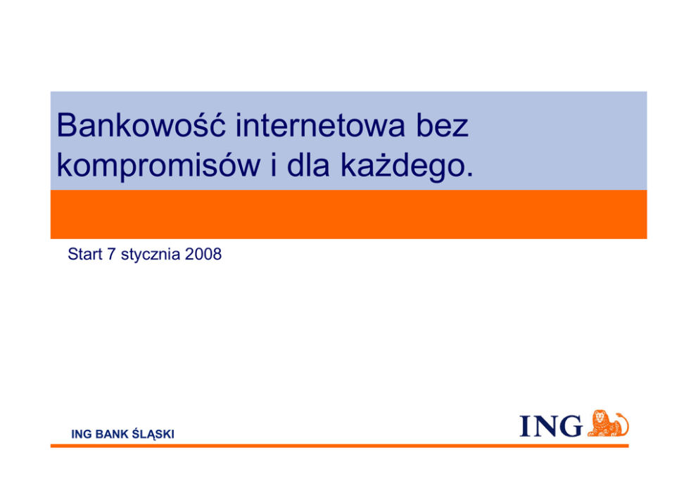 Bankowość internetowa bez kompromisów i dla kaŜdego. Start 7 stycznia 2008 ING BANK ŚLĄSKI Ciągle jesteśmy mało internetowym narodem, ale… • Penetracja internetu dochodzi 40% • Ceny dostępu zaczynają powoli spadać • Internet przestał być miejscem wyłącznie dla młodych ludzi ING 2 Klient nowoczesny ułatwia sobie Ŝycie i nie przepłaca. ING 3 Dlaczego wprowadzamy Konto Direct? • Chcemy być prekursorem trendów (vide konto oszczędnościowe) • ING to najbardziej internetowy bank na świecie • ponad 25 mln klientów online (ING Direct, Postbank, pozostałe) • Chcemy być najbardziej directowym bankiem w Polsce • Na konkurencyjnym rynku wolimy atakować niŜ się bronić. ING 4 Potencjał dla bankowości elektronicznej jest nadal ogromny. 0% Ponad 2,5 mln internautów posiadających rachunek nie korzysta z bankowości elektronicznej. 10% 20% 30% 60% 70% 80% Karta płatnicza 73% Bankow ość internetow a 64% 39% 23% Lokata 20% Kredyt ratalny 19% PoŜyczka gotów kow a 17% Fundusz inw estycyjny 16% Bankow ość telefoniczna 16% 14% Linia kredytow a w rachunku bieŜ. 11% Kredyt hipoteczny / m ieszkaniow y 5% Kredyt na sam ochód Oferta dla m ałych przedsiębiorstw Nie w iem , nie pam iętam 90% 88% Rachunek oszczędnościow y ING 50% Konto osobiste, ROR Karta kredytow a 27% internautów planuje w ciągu pół roku otworzyć konto z dostępem przez internet. 40% 3% 0% N = 950 respondentów Źródło: Badanie „Idealne konto internetowe”. Zrealizowane przez MB SMG/KRC w grudniu 2007, metodą CAWI. 5 Wyniki reprezentatywne dla uŜytkowników internetu. 100% Klienci powszechnie oczekują konta bez kompromisów. Procent internautów wskazujących cechy idealnego konta internetowego Dostęp do duŜej sieci bezpłatnych bankomatów Bank prowadzący konto internetowe jest dobrze znany, duŜy, obecny na rynku od wielu lat Bezpłatne bankomaty ING + Euronet (co piąty bankomat w Polsce) 83% Bank rozpoznawany przez 90% Polaków Blisko 20 lat na rynku Dostęp do duŜej liczby placówek na terenie całego kraju 89% 416 placówek Brak prowizji za prowadzenie konta internetowego 88% 0 zł za prowadzenie konta Bezpłatne przelewy przez Internet ING 91% konto Direct 82% 0 zł za przelewy internetowe Źródło: Badanie „Idealne konto internetowe”. Zrealizowane przez MB SMG/KRC w grudniu 2007, metodą CAWI. 6 Wyniki reprezentatywne dla uŜytkowników internetu. Idea konta Direct Jeśli jesteś nowoczesny… uŜywasz internetu, bankomatu, wpłatomatu, płacisz kartą …konto jest za darmo. Sieć placówek jest zawsze dostępna, ale czynności, które moŜna załatwić przez internet kosztują w placówce 9 złotych. ING 7 Konto jest darmowe, jeśli jestem nowoczesny. Stały dostęp do rachunku Prowadzenie konta Przelewy internetowe 0zł ZłoŜenie stałego zlecenia UŜytkowanie karty debetowej Serwis SMS Wpłatomat ING Bankomat ING i Euronet > 100 PLN płatności /m-c ING 8 Za proste operacje w placówce muszę zapłacić. Ale po co je robić w placówce? Wyciąg papierowy Przelew 9zł Wypłata Wpłata ING 9 Dla kogo jest Konto Direct? • Dla kaŜdego klienta, który uŜywa internetu • Dla klientów, którzy chcą mieć konto bez kompromisów: • bez zbędnych opłat • funkcjonalne (duŜa ilość operacji online) • nowoczesne (m.in. serwis SMS, wybór wizerunku karty) • O wysokim poziomie zabezpieczeń (m.in. autoryzacja SMS) • dostęp do pełnej „funkcjonalność” banku (sieć bankomatów i oddziałów, produkty) • wiarygodna, duŜa instytucja finansowa ING 10 „Gdzieś musi być haczyk” Opłata za wypłatę gotówkową w placówce – 9 PLN, ale nowoczesnemu klientowi proponujemy: • Co piąty bankomat w Polsce bez prowizji (Euronet + ING) • Limit dzienny dla karty debetowej 10 000 PLN, moŜna mieć dwie karty • Pierwsza wypłata z OKO bezpłatna Opłata za wpłatę gotówkowa w placówce 9 PLN, ale nowoczesnemu klientowi proponujemy: • Wpłatomat za darmo • (w połowie 2008 r. 250 maszyn) • Wpłata na OKO w placówce za darmo (konto oszczędnościowe to lepszy sposób oszczędzania niŜ konto osobiste, przelewy OKO-konto są bezpłatne i online) Jak często nowoczesny klient korzysta z ww. operacji? ING 11 Idziemy na całość, bez kompromisów, bez barier dla obecnych klientów. Tak jak z OKO. • KaŜdy dotychczasowy klient, bez Ŝadnych opłat moŜe zmienić pakiet konta na Direct • bez opłat • numer rachunku pozostaje bez zmian • jedyny warunek - wyłącznie poprzez INGBankOnline • Wierzymy, Ŝe bezkompromisowość, przejrzystość i otwarta komunikacja przyniosą sukces. Tak jak z OKO. • Bo „prawie robi wielką róŜnicę”. ING 12 Bankowość internetowa bez kompromisów i dla kaŜdego. ING 13