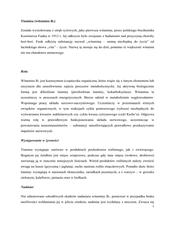 Tiamina (witamina B1) Została wyizolowana z otrąb ryżowych, jako pierwsza witamina, przez polskiego biochemika Kazimierza Funka w 1912 r. Jej odkrycie było związane z badaniami nad przyczyną choroby beri-beri. Funk odkrytą substancję nazwał „witaminą – aminą niezbędną do życia” od łacińskiego słowa „vita” – życie. Nazwę tę stosuje się do dziś, pomimo iż większość witamin nie ma charakteru aminowego. Rola Witamina B1 jest koenzymem (cząsteczka organiczna, która wiąże się z innym elementem lub enzymem dla umożliwienia zajścia procesów metabolicznych). Jej aktywną biologicznie formą jest difosforan tiaminy (pirofosforan tiaminy, kokarboksylaza). Witamina ta uczestniczy w procesach energetycznych. Bierze udział w metabolizmie węglowodanów. Wspomaga pracę układu sercowo-naczyniowego. Uczestniczy w przemianach różnych związków organicznych, w tym reakcjach cyklu pentozowego (ryboza) niezbędnych do wytwarzania kwasów nukleinowych czy cyklu kwasu cytrynowego (cykl Krebs’a). Odgrywa ważną rolę w prawidłowym funkcjonowaniu układu nerwowego, uczestnicząc w powstawaniu neurotransmiterów – substancji umożliwiających prawidłowe przekazywanie impulsów nerwowych. Występowanie w żywności Tiamina występuje zarówno w produktach pochodzenia roślinnego, jak i zwierzęcego. Bogatym jej źródłem jest mięso wieprzowe, podczas gdy inne mięsa (wołowe, drobiowe) zawierają ją w znacznie mniejszych ilościach. Wśród produktów roślinnych należy zwrócić uwagę na kasze (gryczaną i jaglaną), suche nasiona roślin strączkowych. Ponadto duże ilości tiaminy występują w nasionach słonecznika, zarodkach pszennych, a z warzyw – w groszku zielonym, kalafiorze, jarmużu oraz w kiełkach. Nadmiar Nie odnotowano szkodliwych skutków nadmiaru witaminy B1, ponieważ w przypadku braku możliwości wchłaniania jej w jelicie cienkim, nadmiar jest wydalany z moczem. Zwraca się 1 uwagę, że przy dużej i długotrwałej podaży tiaminy z suplementów może ona działać toksycznie. Jednakże takie działanie odnotowano tylko po jej podaniu dożylnym. Niedobór  Wczesnymi objawami niedoboru witaminy B1 są wyczerpanie i brak apetytu. Zaobserwować można także niekorzystne zmiany w układach sercowo-naczyniowym i nerwowym, przykładowo: zaburzenia rytmu serca, wzrost ciśnienia tętniczego, zaburzenie koncentracji.  Niedobór tej witaminy może prowadzić do poważnych zaburzeń mózgowych, np. neuropatii.  Przewlekłe niedobory tiaminy mogą wywołać chorobę beri-beri. Objawia się ona zaburzeniami układu sercowo-naczyniowego, nadciśnieniem tętniczym, brakiem apetytu, utratą masy ciała oraz zanikiem mięśni (odmiana „sucha”) lub obrzękami (odmiana „mokra”). Po raz pierwszy została rozpoznana w Azji, gdzie powszechnie stosuje się oczyszczanie ryżu, pozbawiając go łuski. Ryż obłuskany jest deficytowy w tę witaminę.  Niedobory witaminy B1 mogą wystąpić u osób spożywających duże ilości alkoholu, u osób z chorobą Crohna, anoreksją, palących papierosy czy też pijących znaczne ilości kawy i herbaty.  Stosowanie diuretyków (środków moczopędnych) może spowodować niedobór witaminy B1 w organizmie.  Osoby z niedoborem witaminy B1 mają również problemy z trawieniem węglowodanów, ponieważ zapotrzebowanie na tę witaminę jest proporcjonalne do masy spożywanych węglowodanów. 2