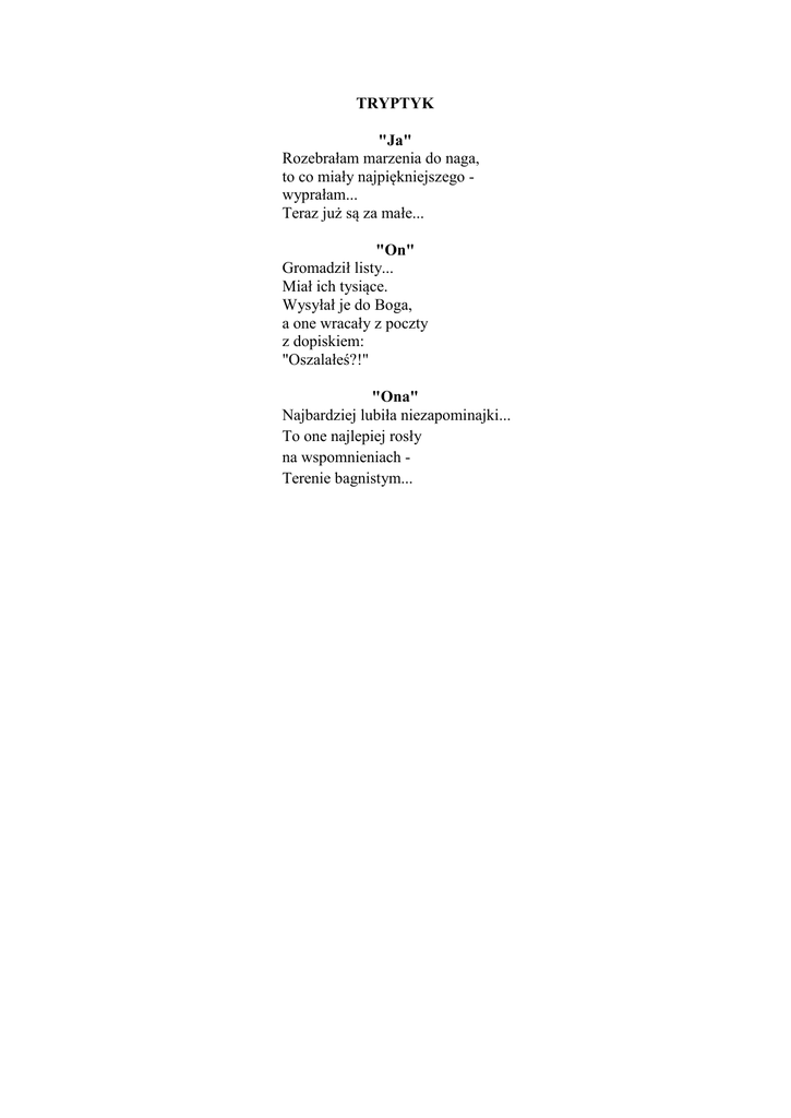 TRYPTYK "Ja" Rozebrałam marzenia do naga, to co miały najpiękniejszego wyprałam... Teraz już są za małe... "On" Gromadził listy... Miał ich tysiące. Wysyłał je do Boga, a one wracały z poczty z dopiskiem: "Oszalałeś?!" "Ona" Najbardziej lubiła niezapominajki... To one najlepiej rosły na wspomnieniach Terenie bagnistym...