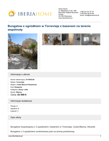 Iberia Home ul. Migdałowa 4 lok. 24B (+48) 22 101 07 47 Biurowiec Natpoll Business (+48) 604 99 44 66 Center email: [email protected] 02-796 Warszawa www.iberiahome.pl Bungalow z ogródkiem w Torrevieja z basenem na terenie wspólnoty Informacje o ofercie Numer referencyjny: 511/05/C/III Miasto: Torrevieja Region: Costa Blanca Południowa Kraj: Hiszpania Kategoria: Domy i wille Rynek: Wtórny Cena: 83 000 € Informacje dodatkowe Pokoje: 3 Sypialnie: 2 Łazienki: 1 Opis oferty Bungalow trzypokojowy z 3 sypialniami i basenem w Torrevieja, Costa Blanca, Alicante Bungalow z 3 sypialniami zorientowany jest na stronę południową. www.iberiahome.pl 1 Nieruchomość ma 80 m2 powierzchni mieszkalnej, trzy sypialnie, łazienkę, kuchnię, salon i werandę o wielkości 25 m2. Na terenie rezydencji znajduje się basen. Udogodnienia ● Ogródek ● Basen wspólnoty ● Taras ● Umeblowany www.iberiahome.pl 2