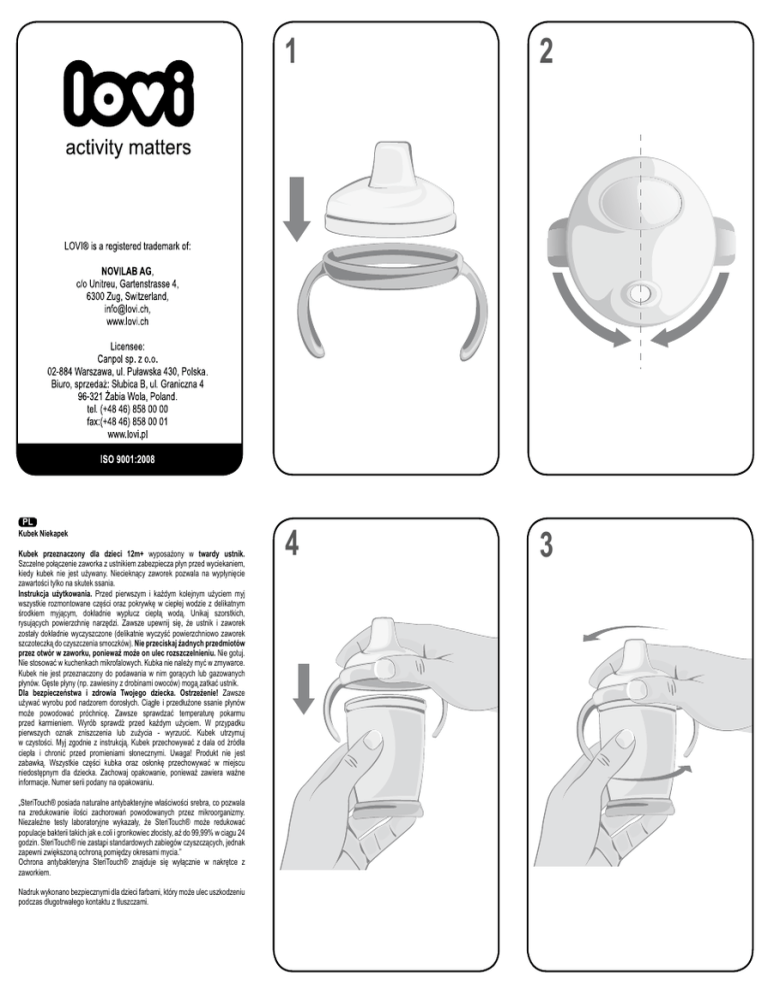 PL Kubek Niekapek Kubek przeznaczony dla dzieci 12m+ wyposażony w twardy ustnik. Szczelne połączenie zaworka z ustnikiem zabezpiecza płyn przed wyciekaniem, kiedy kubek nie jest używany. Niecieknący zaworek pozwala na wypłynięcie zawartości tylko na skutek ssania. Instrukcja użytkowania. Przed pierwszym i każdym kolejnym użyciem myj wszystkie rozmontowane części oraz pokrywkę w ciepłej wodzie z delikatnym środkiem myjącym, dokładnie wypłucz ciepłą wodą. Unikaj szorstkich, rysujących powierzchnię narzędzi. Zawsze upewnij się, że ustnik i zaworek zostały dokładnie wyczyszczone (delikatnie wyczyść powierzchniowo zaworek szczoteczką do czyszczenia smoczków). Nie przeciskaj żadnych przedmiotów przez otwór w zaworku, ponieważ może on ulec rozszczelnieniu. Nie gotuj. Nie stosować w kuchenkach mikrofalowych. Kubka nie należy myć w zmywarce. Kubek nie jest przeznaczony do podawania w nim gorących lub gazowanych płynów. Gęste płyny (np. zawiesiny z drobinami owoców) mogą zatkać ustnik. Dla bezpieczeństwa i zdrowia Twojego dziecka. Ostrzeżenie! Zawsze używać wyrobu pod nadzorem dorosłych. Ciągłe i przedłużone ssanie płynów może powodować próchnicę. Zawsze sprawdzać temperaturę pokarmu przed karmieniem. Wyrób sprawdź przed każdym użyciem. W przypadku pierwszych oznak zniszczenia lub zużycia - wyrzucić. Kubek utrzymuj w czystości. Myj zgodnie z instrukcją. Kubek przechowywać z dala od źródła ciepła i chronić przed promieniami słonecznymi. Uwaga! Produkt nie jest zabawką. Wszystkie części kubka oraz osłonkę przechowywać w miejscu niedostępnym dla dziecka. Zachowaj opakowanie, ponieważ zawiera ważne informacje. Numer serii podany na opakowaniu. „SteriTouch® posiada naturalne antybakteryjne właściwości srebra, co pozwala na zredukowanie ilości zachorowań powodowanych przez mikroorganizmy. Niezależne testy laboratoryjne wykazały, że SteriTouch® może redukować populacje bakterii takich jak e.coli i gronkowiec złocisty, aż do 99,99% w ciągu 24 godzin. SteriTouch® nie zastąpi standardowych zabiegów czyszczących, jednak zapewni zwiększoną ochroną pomiędzy okresami mycia.” Ochrona antybakteryjna SteriTouch® znajduje się wyłącznie w nakrętce z zaworkiem. Nadruk wykonano bezpiecznymi dla dzieci farbami, który może ulec uszkodzeniu podczas długotrwałego kontaktu z tłuszczami. 1 2 4 3