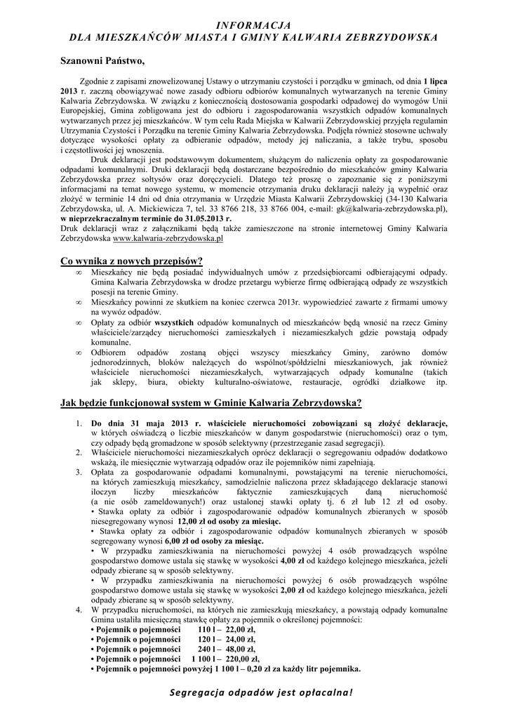 INFORMACJA DLA MIESZKAŃCÓW MIASTA I GMINY KALWARIA ZEBRZYDOWSKA Szanowni Państwo, Zgodnie z zapisami znowelizowanej Ustawy o utrzymaniu czystości i porządku w gminach, od dnia 1 lipca 2013 r. zaczną obowiązywać nowe zasady odbioru odbiorów komunalnych wytwarzanych na terenie Gminy Kalwaria Zebrzydowska. W związku z koniecznością dostosowania gospodarki odpadowej do wymogów Unii Europejskiej, Gmina zobligowana jest do odbioru i zagospodarowania wszystkich odpadów komunalnych wytwarzanych przez jej mieszkańców. W tym celu Rada Miejska w Kalwarii Zebrzydowskiej przyjęła regulamin Utrzymania Czystości i Porządku na terenie Gminy Kalwaria Zebrzydowska. Podjęła również stosowne uchwały dotyczące wysokości opłaty za odbieranie odpadów, metody jej naliczania, a także trybu, sposobu i częstotliwości jej wnoszenia. Druk deklaracji jest podstawowym dokumentem, służącym do naliczenia opłaty za gospodarowanie odpadami komunalnymi. Druki deklaracji będą dostarczane bezpośrednio do mieszkańców gminy Kalwaria Zebrzydowska przez sołtysów oraz doręczycieli. Dlatego też proszę o zapoznanie się z poniższymi informacjami na temat nowego systemu, w momencie otrzymania druku deklaracji należy ją wypełnić oraz złożyć w terminie 14 dni od dnia otrzymania w Urzędzie Miasta Kalwarii Zebrzydowskiej (34-130 Kalwaria Zebrzydowska, ul. A. Mickiewicza 7, tel. 33 8766 218, 33 8766 004, e-mail: [email protected]), w nieprzekraczalnym terminie do 31.05.2013 r. Druk deklaracji wraz z załącznikami będą także zamieszczone na stronie internetowej Gminy Kalwaria Zebrzydowska www.kalwaria-zebrzydowska.pl Co wynika z nowych przepisów? • • • • Mieszkańcy nie będą posiadać indywidualnych umów z przedsiębiorcami odbierającymi odpady. Gmina Kalwaria Zebrzydowska w drodze przetargu wybierze firmę odbierającą odpady ze wszystkich posesji na terenie Gminy. Mieszkańcy powinni ze skutkiem na koniec czerwca 2013r. wypowiedzieć zawarte z firmami umowy na wywóz odpadów. Opłaty za odbiór wszystkich odpadów komunalnych od mieszkańców będą wnosić na rzecz Gminy właściciele/zarządcy nieruchomości zamieszkałych i niezamieszkałych gdzie powstają odpady komunalne. Odbiorem odpadów zostaną objęci wszyscy mieszkańcy Gminy, zarówno domów jednorodzinnych, bloków należących do wspólnot/spółdzielni mieszkaniowych, jak również właściciele nieruchomości niezamieszkałych, wytwarzających odpady komunalne (takich jak sklepy, biura, obiekty kulturalno-oświatowe, restauracje, ogródki działkowe itp. Jak będzie funkcjonował system w Gminie Kalwaria Zebrzydowska? 1. 2. 3. 4. Do dnia 31 maja 2013 r. właściciele nieruchomości zobowiązani są złożyć deklaracje, w których oświadczą o liczbie mieszkańców w danym gospodarstwie (nieruchomości) oraz o tym, czy odpady będą gromadzone w sposób selektywny (przestrzeganie zasad segregacji). Właściciele nieruchomości niezamieszkałych oprócz deklaracji o segregowaniu odpadów dodatkowo wskażą, ile miesięcznie wytwarzają odpadów oraz ile pojemników nimi zapełniają. Opłata za gospodarowanie odpadami komunalnymi, powstającymi na terenie nieruchomości, na których zamieszkują mieszkańcy, samodzielnie naliczona przez składającego deklaracje stanowi iloczyn liczby mieszkańców faktycznie zamieszkujących daną nieruchomość (a nie osób zameldowanych!) oraz ustalonej stawki opłaty tj. 6 zł lub 12 zł od osoby. • Stawka opłaty za odbiór i zagospodarowanie odpadów komunalnych zbieranych w sposób niesegregowany wynosi 12,00 zł od osoby za miesiąc. • Stawka opłaty za odbiór i zagospodarowanie odpadów komunalnych zbieranych w sposób segregowany wynosi 6,00 zł od osoby za miesiąc. • W przypadku zamieszkiwania na nieruchomości powyżej 4 osób prowadzących wspólne gospodarstwo domowe ustala się stawkę w wysokości 4,00 zł od każdego kolejnego mieszkańca, jeżeli odpady zbierane są w sposób selektywny. • W przypadku zamieszkiwania na nieruchomości powyżej 6 osób prowadzących wspólne gospodarstwo domowe ustala się stawkę w wysokości 2,00 zł od każdego kolejnego mieszkańca, jeżeli odpady zbierane są w sposób selektywny. W przypadku nieruchomości, na których nie zamieszkują mieszkańcy, a powstają odpady komunalne Gmina ustaliła miesięczną stawkę opłaty za pojemnik o określonej pojemności: • Pojemnik o pojemności 110 l – 22,00 zł, • Pojemnik o pojemności 120 l – 24,00 zł, • Pojemnik o pojemności 240 l – 48,00 zł, • Pojemnik o pojemności 1 100 l – 220,00 zł, • Pojemnik o pojemności powyżej 1 100 l – 0,20 zł za każdy litr pojemnika. Segregacja odpadów jest opłacalna! 5. 6. 7. W przypadku nieruchomości, na których nie zamieszkują mieszkańcy, a powstają odpady komunalne, na których odpady są zbierane i odbierane w sposób selektywny Gmina ustaliła niższą miesięczną stawkę za zestaw pojemników do segregacji: • Pojemnik o pojemności 110 l – 11,00 zł, • Pojemnik o pojemności 120 l – 12,00 zł, • Pojemnik o pojemności 240 l – 24,00 zł, • Pojemnik o pojemności 1 100 l – 110,00 zł, • Pojemnik o pojemności powyżej 1 100 l – 0,10 zł za każdy litr pojemnika. W przypadku nieruchomości o charakterze mieszanym (np. sklep + mieszkanie) opłata stanowi sumę opłat obliczonych jak wyżej. W przypadku nie złożenia deklaracji (lub złożenia deklaracji niezgodnej ze stanem faktycznym) o wysokości opłaty zdecyduje Burmistrz w drodze decyzji administracyjnej. Opłaty należy wnosić w okresach kwartalnych. Płatności można dokonywać przelewem na konto: Urząd Miasta Kalwarii Zebrzydowskiej „Opłata śmieciowa” 49 8119 0001 0000 0387 2000 0010 w punkcie kasowym Banku Spółdzielczego w Urzędzie Miasta Kalwarii Zebrzydowskiej, ul. Mickiewicza 7 - bez dodatkowych prowizji. W następujących terminach: do 15 stycznia (opłata za I kwartał), do 15 kwietnia (opłata