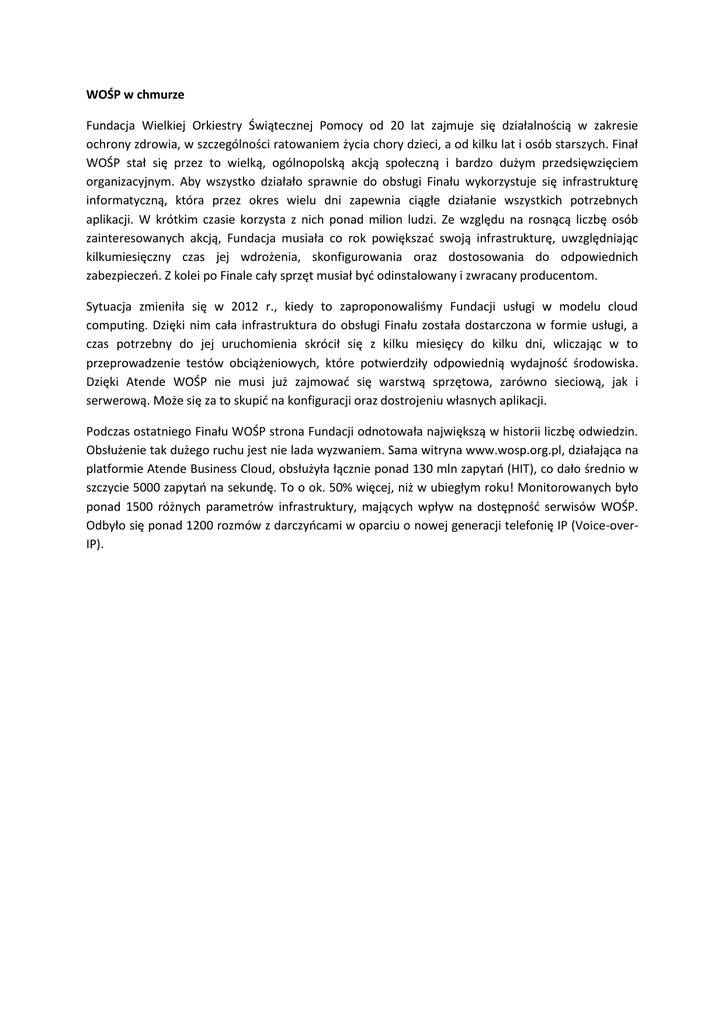 WOŚP w chmurze Fundacja Wielkiej Orkiestry Świątecznej Pomocy od 20 lat zajmuje się działalnością w zakresie ochrony zdrowia, w szczególności ratowaniem życia chory dzieci, a od kilku lat i osób starszych. Finał WOŚP stał się przez to wielką, ogólnopolską akcją społeczną i bardzo dużym przedsięwzięciem organizacyjnym. Aby wszystko działało sprawnie do obsługi Finału wykorzystuje się infrastrukturę informatyczną, która przez okres wielu dni zapewnia ciągłe działanie wszystkich potrzebnych aplikacji. W krótkim czasie korzysta z nich ponad milion ludzi. Ze względu na rosnącą liczbę osób zainteresowanych akcją, Fundacja musiała co rok powiększać swoją infrastrukturę, uwzględniając kilkumiesięczny czas jej wdrożenia, skonfigurowania oraz dostosowania do odpowiednich zabezpieczeń. Z kolei po Finale cały sprzęt musiał być odinstalowany i zwracany producentom. Sytuacja zmieniła się w 2012 r., kiedy to zaproponowaliśmy Fundacji usługi w modelu cloud computing. Dzięki nim cała infrastruktura do obsługi Finału została dostarczona w formie usługi, a czas potrzebny do jej uruchomienia skrócił się z kilku miesięcy do kilku dni, wliczając w to przeprowadzenie testów obciążeniowych, które potwierdziły odpowiednią wydajność środowiska. Dzięki Atende WOŚP nie musi już zajmować się warstwą sprzętowa, zarówno sieciową, jak i serwerową. Może się za to skupić na konfiguracji oraz dostrojeniu własnych aplikacji. Podczas ostatniego Finału WOŚP strona Fundacji odnotowała największą w historii liczbę odwiedzin. Obsłużenie tak dużego ruchu jest nie lada wyzwaniem. Sama witryna www.wosp.org.pl, działająca na platformie Atende Business Cloud, obsłużyła łącznie ponad 130 mln zapytań (HIT), co dało średnio w szczycie 5000 zapytań na sekundę. To o ok. 50% więcej, niż w ubiegłym roku! Monitorowanych było ponad 1500 różnych parametrów infrastruktury, mających wpływ na dostępność serwisów WOŚP. Odbyło się ponad 1200 rozmów z darczyńcami w oparciu o nowej generacji telefonię IP (Voice-overIP).