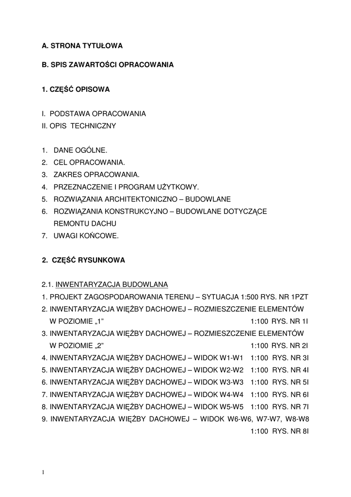 A. STRONA TYTUŁOWA B. SPIS ZAWARTOŚCI OPRACOWANIA 1. CZĘŚĆ OPISOWA I. PODSTAWA OPRACOWANIA II. OPIS TECHNICZNY 1. DANE OGÓLNE. 2. CEL OPRACOWANIA. 3. ZAKRES OPRACOWANIA. 4. PRZEZNACZENIE I PROGRAM UŻYTKOWY. 5. ROZWIĄZANIA ARCHITEKTONICZNO – BUDOWLANE 6. ROZWIĄZANIA KONSTRUKCYJNO – BUDOWLANE DOTYCZĄCE REMONTU DACHU 7. UWAGI KOŃCOWE. 2. CZĘŚĆ RYSUNKOWA 2.1. INWENTARYZACJA BUDOWLANA 1. PROJEKT ZAGOSPODAROWANIA TERENU – SYTUACJA 1:500 RYS. NR 1PZT 2. INWENTARYZACJA WIĘŹBY DACHOWEJ – ROZMIESZCZENIE ELEMENTÓW W POZIOMIE „1” 1:100 RYS. NR 1I 3. INWENTARYZACJA WIĘŹBY DACHOWEJ – ROZMIESZCZENIE ELEMENTÓW W POZIOMIE „2” 1:100 RYS. NR 2I 4. INWENTARYZACJA WIĘŹBY DACHOWEJ – WIDOK W1-W1 1:100 RYS. NR 3I 5. INWENTARYZACJA WIĘŹBY DACHOWEJ – WIDOK W2-W2 1:100 RYS. NR 4I 6. INWENTARYZACJA WIĘŹBY DACHOWEJ – WIDOK W3-W3 1:100 RYS. NR 5I 7. INWENTARYZACJA WIĘŹBY DACHOWEJ – WIDOK W4-W4 1:100 RYS. NR 6I 8. INWENTARYZACJA WIĘŹBY DACHOWEJ – WIDOK W5-W5 1:100 RYS. NR 7I 9. INWENTARYZACJA WIĘŹBY DACHOWEJ – WIDOK W6-W6, W7-W7, W8-W8 1:100 RYS. NR 8I 1 10. INWENTARYZACJA WIĘŹBY DACHOWEJ – KONSTRUKCJA LUKARN TYPU „WOLE OCZKO” 1:100 RYS. NR 9I 11. INWENTARYZACJA PODBITKI DREWNIANEJ ORAZ GZYMSU OKAPOWEGO ŚCIANKI SZCZYTOWEJ – TYMPANONU RYS. FOT. NR 10I 2.2. INWENTARYZACJA USZKODZEŃ 1. INWENTARYZACJA WIĘŹBY DACHOWEJ W POZIOMIE „1” 1:100 RYS. NR 1IU 2. INWENTARYZACJA WIĘŹBY DACHOWEJ W POZIOMIE „2” 1:100 RYS. NR 2IU 3. ZESTAWIENIE ELEMENTÓW WIĘŹBY DACHOWEJ Z CHARAKTERYSTYKĄ STANU TECHNICZNEGO/ZABIEGI NAPRAWCZO – WZMACNIAJĄCE 2.3. PROJEKT BUDOWLANY REMONTU WIĘŹBY I POKRYCIA DACHU BUDYNKU 1. RZUT WIĘŹBY DACHOWEJ POZIOM „1” 1:100 RYS. NR 1 2. RZUT WIĘŹBY DACHOWEJ POZIOM „2” 1:100 RYS. NR 2 3. ZESTAWIENIE DREWNA DLA REMONTU WIĘŹBY DREWNIANEJ 4. RZUT DACHU 1:100 RYS. NR 3 5. SPOSOBY NAPRAWY USZKODZONYCH ELEMENTÓW WIĘŹBY DACHOWEJ RYS. NR 4 6. PRZEKRÓJ TYPOWY WZMACNIANYCH LUKARN TYPU „WOLE OCZKA” I OKAPÓW DACHU 7. ZESTAWIENIE STOLASRKI OKIENNEJ „WOLICH OCZEK” RYS. NR 5 1:100 RYS. NR 6 2.4. PROJEKT BUDOWLANY ZABEZPIECZENIA TRZONÓW KOMINOWYCH WYPROWADZONYCH W PRZESTRZEŃ STRYCHU NIEUŻYTKOWEGO. 1. INWENTARYZACJA TRZONÓW KOMINOWYCH ZLOKALIZOWANYCH NA PODDASZU BUDYNKU 1:100 RYS. NR 7 2. ZABEZPIECZENIE TRZONÓW KOMINOWYCH – WZMOCNIENIE ODPORNOŚCI OGNIOWEJ TRZONÓW 1:100 RYS. NR 8 3. ZABEZPIECZENIE TRZONÓW KOMINOWYCH – ROZMIESZCZENIE KLAP PRZECIWPOŻAROWYCH WZMOCNIENIE 1:100 RYS. NR 9 4. DOKUMENTACJA TECHNICZNO – RUCHOWA, KARTA KATALOGOWA KLAPY PRZECIWPOŻAROWEJ V 370 2 C. ZAŁĄCZNIKI 1. Wytyczne konserwatorskie do przebudowy dachu w Zespole Szkół Ogólnokształcących przy ul. Mickiewicza 6-8 w Mysłowicach – pismo Wojewódzkiego Urzędu Ochrony Zabytków w Katowicach znak: K-NR.5183.181.2014.JB, RPW/11089/2014 z dnia 5 sierpień 2014 r. 2. Protokół z narady koordynacyjnej odbytej w Zespole Szkół Ogólnokształcących przy ul. Mickiewicza 6-8 w Mysłowicach odbytej w dniu 29.10.2014 r. 3. Postanowienie Wojewódzkiego Urzędu Ochrony Zabytków w Katowicach …………………………………………………………………………………….. 4. Opinia kominiarska nr 319/2014 w sprawie przewodów kominowych budynku Zespołu Szkół Ogólnokształcących przy ul. Mickiewicza 6-8 w Mysłowicach 5. Materiały techniczne D. OŚWIADCZENIA I UPRAWNIENIA PROJEKTANTÓW. 3 I. PODSTAWA OPRACOWANIA 1. Umowa zawarta pomiędzy Biurem Projektów MAT – Machlowski, Then sp.j. z siedzibą w Bielsku-Białej przy ul. Piekarskiej 50, a Gminą Miasta Mysłowice (nr GM.272.2.107.2014). 2. Zaktualizowana mapa zasadnicza w skali 1 : 500 obręb Mysłowice KERG : GK 6640.859.2014. 3. Wypis ze Studium Uwarunkowań i Kierunków Zagospodarowania Przestrzennego Miasta Mysłowice, AB-I.6727.389.2014.BK z dnia 30.10.2014r, Mysłowice 4. Decyzja Śląskiego Wojewódzkiego Konserwatora Zabytków w Katowicach w sprawie wpisania dobra kultury do rejestru zabytków „A” z 7 listopada 2003 L.dz. SOZ-KL/4160/6950/38/02 ( Nr rejestru A/107/03 ) 5. „Ekspertyza techniczna konstrukcji dachu i pokrycia w świetle obowiązujących norm i warunków technicznych w Zespole Szkół Ogólnokształcących przy ul. Mickiewicza 6-8 w Mysłowicach” – autorstwa MAT- sp. j. Bielsko-Biała ul. Piekarska 50 – 9.06.2014 r. 6. „Inwentaryzacja budowlana konstrukcji dachu i pokrycia” – autorstwa MAT- sp. j. Bielsko-Biała ul. Piekarska 50 – 3.06.2014 7. Wytyczne konserwatorskie do przebudowy dachu w Zespole Szkół Ogólnokształcących przy ul. Mickiewicza 6-8 w Mysłowicach wydane przez Wojewódzki Urząd Ochrony Zabytków w Katowicach znak K-NR.5183.181.2014.JB RPW/11089/2014 z 5.08.2014 8. Protokół z narady koordynacyjnej w Zespole Szkół Ogólnokształcących przy ul. Mickiewicza 6-8 w Mysłowicach w dniu 29.10.2014 przy udziale Inspektora Wojewódzkiego Urzędu Ochrony Zabytków w Katowicach 9. Uzgodnienia i konsultacje z Inspektorem Wojewódzkiego Urzędu Ochrony Zabytków w Katowicach. 10. Ustawa „Prawo budowlane” z dnia 07.07.1994 r. ( z późniejszymi zmianami), 11. Rozporządzenie Ministra Infrastruktury z dnia 12 kwietnia 2002 r. w sprawie warunków technicznych, jakim powinny odpowiadać budynki i ich usytuowanie (Dz.U. Nr 75/02 poz. 690, Nr 33/03 poz.270) z późniejszymi zmianami, 12. Rozporządzenie Ministra Transportu, Budownictwa i Gospodarki Morskiej z dnia 25 kwietnia 2012 r w sprawie szczegółowego zakresu i formy projektu budowlanego (Dz. U. z 2012 poz. 462 z późniejszymi zmianami), 4 13. Opracowanie: “Połączenia klejowe i inżynierskie w naprawie, konserwacji i wzmacnianiu zabytkowych konstrukcji drewnianych” - Jerzy Jasieńko, (Dolnośląskie Wydawnictwo Edukacyjne – Wrocław 2003). 14. Opracowanie: “Naprawy i wzmocnienia konstrukcji budowlanych - Warsztat Pracy Projektanta Konstrukcji”, (PZITB); 15. Opracowania: “Materiały techniczne producentów”, 16. Inne obowiązujące prz