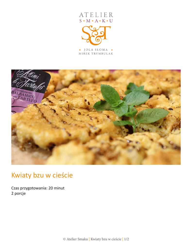 Kwiaty bzu w cieście Czas przygotowania: 20 minut 2 porcje © Atelier Smaku | Kwiaty bzu w cieście | 1/2 Składniki ok. 10 kwiatostanów czarnego bzu 1 szklanka mąki kukurydzianej 2 łyżki mąki ziemniaczanej 1 łyżka zmielonego siemienia lnianego 2-3 łyżki cukru pudru 1 szczypta soli woda liście świeżej mięty do dekoracji truflowy krem balsamiczny do dekoracji Wykonanie Mieszamy ze sobą suche składniki. Następnie dodajemy wody w takiej ilości, aby po zmieszaniu wyszło nam ciasto o takiej konsystencji, z jakiej smaży się naleśniki. Prawdopodobnie po jakimś czasie będziemy musieli dodać wody, ponieważ mielone siemię lniane absorbuje wilgoć z ciasta. Chwytamy kwiatostany bzu za gałązkę, zanurzamy w cieście, usuwamy nadmiar ciasta i kładziemy na patelnię, po czym obcinamy nożyczkami gałązkę tak, by udało nam się obrócić placek na drugą stronę. Smażymy na głębokim oleju na patelni, aż ciasto się zarumieni. Wykładamy na talerz, dekorujemy miętą i skrapiamy truflowym kremem balsamicznym. W tej wersji jest to przepyszne i wysublimowane i pachnące bzem, i białą truflą danie, ale możemy też podawać z konfiturą, cukrem pudrem itd. © Atelier Smaku | Kwiaty bzu w cieście | 2/2