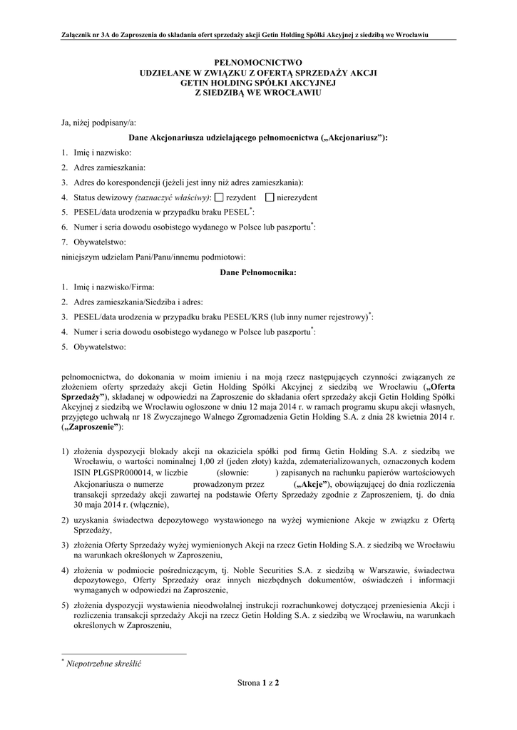 Załącznik nr 3A do Zaproszenia do składania ofert sprzedaży akcji Getin Holding Spółki Akcyjnej z siedzibą we Wrocławiu PEŁNOMOCNICTWO UDZIELANE W ZWIĄZKU Z OFERTĄ SPRZEDAŻY AKCJI GETIN HOLDING SPÓŁKI AKCYJNEJ Z SIEDZIBĄ WE WROCŁAWIU Ja, niżej podpisany/a: Dane Akcjonariusza udzielającego pełnomocnictwa („Akcjonariusz”): 1. Imię i nazwisko: 2. Adres zamieszkania: 3. Adres do korespondencji (jeżeli jest inny niż adres zamieszkania): 4. Status dewizowy (zaznaczyć właściwy): rezydent nierezydent * 5. PESEL/data urodzenia w przypadku braku PESEL : 6. Numer i seria dowodu osobistego wydanego w Polsce lub paszportu*: 7. Obywatelstwo: niniejszym udzielam Pani/Panu/innemu podmiotowi: Dane Pełnomocnika: 1. Imię i nazwisko/Firma: 2. Adres zamieszkania/Siedziba i adres: 3. PESEL/data urodzenia w przypadku braku PESEL/KRS (lub inny numer rejestrowy) *: 4. Numer i seria dowodu osobistego wydanego w Polsce lub paszportu*: 5. Obywatelstwo: pełnomocnictwa, do dokonania w moim imieniu i na moją rzecz następujących czynności związanych ze złożeniem oferty sprzedaży akcji Getin Holding Spółki Akcyjnej z siedzibą we Wrocławiu („Oferta Sprzedaży”), składanej w odpowiedzi na Zaproszenie do składania ofert sprzedaży akcji Getin Holding Spółki Akcyjnej z siedzibą we Wrocławiu ogłoszone w dniu 12 maja 2014 r. w ramach programu skupu akcji własnych, przyjętego uchwałą nr 18 Zwyczajnego Walnego Zgromadzenia Getin Holding S.A. z dnia 28 kwietnia 2014 r. („Zaproszenie”): 1) złożenia dyspozycji blokady akcji na okaziciela spółki pod firmą Getin Holding S.A. z siedzibą we Wrocławiu, o wartości nominalnej 1,00 zł (jeden złoty) każda, zdematerializowanych, oznaczonych kodem ISIN PLGSPR000014, w liczbie (słownie: ) zapisanych na rachunku papierów wartościowych Akcjonariusza o numerze prowadzonym przez („Akcje”), obowiązującej do dnia rozliczenia transakcji sprzedaży akcji zawartej na podstawie Oferty Sprzedaży zgodnie z Zaproszeniem, tj. do dnia 30 maja 2014 r. (włącznie), 2) uzyskania świadectwa depozytowego wystawionego na wyżej wymienione Akcje w związku z Ofertą Sprzedaży, 3) złożenia Oferty Sprzedaży wyżej wymienionych Akcji na rzecz Getin Holding S.A. z siedzibą we Wrocławiu na warunkach określonych w Zaproszeniu, 4) złożenia w podmiocie pośredniczącym, tj. Noble Securities S.A. z siedzibą w Warszawie, świadectwa depozytowego, Oferty Sprzedaży oraz innych niezbędnych dokumentów, oświadczeń i informacji wymaganych w odpowiedzi na Zaproszenie, 5) złożenia dyspozycji wystawienia nieodwołalnej instrukcji rozrachunkowej dotyczącej przeniesienia Akcji i rozliczenia transakcji sprzedaży Akcji na rzecz Getin Holding S.A. z siedzibą we Wrocławiu, na warunkach określonych w Zaproszeniu, * Niepotrzebne skreślić Strona 1 z 2 Załącznik nr 3A do Zaproszenia do składania ofert sprzedaży akcji Getin Holding Spółki Akcyjnej z siedzibą we Wrocławiu 6) udzielenia podmiotowi pośredniczącemu, tj. Noble Securities S.A. z siedzibą w Warszawie, nieodwołalnego i niewygasającego na wypadek śmierci Akcjonariusza pełnomocnictwa do przyjęcia w imieniu Akcjonariusza oświadczenia Getin Holding S.A. z siedzibą we Wrocławiu o przyjęciu Oferty Sprzedaży, w całości lub z uwzględnieniem ewentualnej redukcji przeprowadzonej proporcjonalnie na zasadach określonych w Zaproszeniu, na skutek czego dojdzie do zawarcia umowy sprzedaży Akcji pomiędzy Akcjonariuszem a Getin Holding S.A. z siedzibą we Wrocławiu poza rynkiem zorganizowanym. Pełnomocnik, z przyczyn uzasadnionych treścią stosunku prawnego będącego podstawą pełnomocnictwa i w celu zapewnienia realizacji Oferty Sprzedaży, powinien zrzec się prawa do odwołania pełnomocnictwa udzielanego Noble Securities S.A. Ponadto Noble Securities S.A. ma prawo reprezentować drugą stronę umowy sprzedaży Akcji, tj. Getin Holding S.A. z siedzibą we Wrocławiu. Noble Securities S.A. ma prawo udzielenia, na podstawie niniejszego pełnomocnictwa i w jego zakresie, dalszego pełnomocnictwa dla swoich pracowników. Noble Securities S.A. nie ma obowiązku zwrotu dokumentu pełnomocnictwa. Ponadto oświadczam, iż akceptuję treść formularza Oferty Sprzedaży i zawartych w nim oświadczeń składanych w moim imieniu przez Pełnomocnika, jak również pozostałych dokumentów sporządzanych w moim imieniu przez Pełnomocnika w związku z Ofertą Sprzedaży. ___________________________________________________________ miejscowość, data własnoręczny podpis Akcjonariusza Oświadczenie pracownika Noble Securities S.A. z siedzibą w Warszawie Poświadczam, iż niniejsze Pełnomocnictwo zostało złożone i podpisane przez wskazaną wyżej osobę w mojej obecności. ……………………………………………………………………………………………………………………………………………………. (data, pieczęć firmowa, pieczątka imienna i podpis pracownika Noble Securities S.A. z siedzibą w Warszawie) Strona 2 z 2
