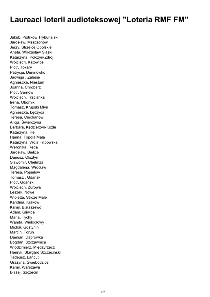 Laureaci loterii audioteksowej "Loteria RMF FM" Jakub, Piotrków Trybunalski Jarosław, Mszczonów Jerzy, Strzelce Opolskie Aneta, Wodzisław Śląski Katarzyna, Połczyn-Zdrój Wojciech, Katowice Piotr, Tokary Patrycja, Duninówko Jadwiga , Zalesie Agnieszka, Niestum Joanna, Chroberz Piotr, Sarnów Wojciech, Trzcianka Irena, Oborniki Tomasz, Krupski Młyn Agnieszka, Łęczyca Teresa, Ciechanów Alicja, Świerczyna Barbara, Kędzierzyn-Koźle Katarzyna, Hel Hanna, Topola Mała Katarzyna, Wola Filipowska Weronika, Reda Jarosław, Bielice Dariusz, Olsztyn Sławomir, Chełmża Magdalena, Wrocław Teresa, Popielów Tomasz , Gdańsk Piotr, Gdańsk Wojciech, Żurowa Leszek, Nowe Wioletta, Stróże Małe Karolina, Kraków Kamil, Białaszewo Adam, Gliwice Maria, Tychy Wanda, Wielogłowy Michał, Gostynin Marcin, Toruń Damian, Dąbrówka Bogdan, Szczawnica Włodzimierz, Międzyrzecz Henryk, Stargard Szczeciński Tadeusz, Łańcut Grażyna, Świebodzice Kamil, Warszawa Błażej, Szczecin 1/7 Karol, Kalisz Tomasz, Klewno Jarosław, Małaszewicze Mirosław, Dębowiec Teresa, Nowy Sącz Katarzyna, Radom Jacek, Morawica Dorota, Świdnik Tomasz , Budki Andrzej, Raciborsko Elżbieta , Łosino Michał, Złotów Aneta, Ożarów Mazowiecki Jarosław, Toczyska Nikola, Wałbrzych Paweł, Zielona Góra Sara, Władków Radosław, Solec Maciej, Parłowice Tadeusz, Kobyle Agata, Mysłowice Waldemar, Radomierzyce Bożena, Wiechlice Halina, Tychy Mariusz, Skierniewice Kamil, Grochowe Grzegorz, Olsztyn Janusz, Kunowo Przemysław, Trzcianka Anna, Białystok Kazimierz, Katowice Agnieszka, Częstochowa Maciej, Gdańsk Agnieszka, Święciechowa Mateusz, Wierzbno Honorata, Lubomin Iwona, Szczecin Anna, Białe Błota Stanisława, Trzcińsko-Zdrój Adam, Nowy Tomyśl Przemysław, Staniątki Urszula, Łęknica Marcin, Raszyn Jan, Łaniewo Leśnictwo Katarzyna, Krzywe Koło Beata, Strzegom Elżbieta, Grudziądz Zenobiusz, Hrebenne Adam, Kielce Mirosław, Mościce Grzegorz, Katowice Izabela, Góra Kalwaria Karolina, Olpuch 2/7 Aleksandra, Szczecin Agnieszka, Police Andrzej , Sądów Mateusz, Jaksice Ewa, Kąclowa Alina, Częstochowa Liza, Młotkówko Beata, Blachownia Wanda, Andrychów Róża, Pszczyna Karol, Florczaki Józef, Międzychód Zbigniew, Łódź Grzegorz, Końskie Dorota, Węgrzyce Agnieszka, Marszowice Kazimierz, Leszno Górne Bernard, Siedlec Joanna, Chabsko Adrian, Ostrowiec Świętokrzyski Michał, Pisz Natalia, Kamień Śląski Joanna, Kraków Piotr, Chorzów Mirosław, Syców Piotr, Raciąż Arkadiusz, Oględów Katarzyna, Radonie Iwona , Słupsk Natalia, Opoczno Piotr, Borek Wlkp. Małgorzata, Ligota Oleska Jarosław, Międzyrzecz Mariusz, Zielona Góra Damian, Śmigiel Paweł, Gdańsk Henryk, Zamość Aleksandra, Bytom Jan, Jeżewice Agnieszka, Czechowice-Dziedzice Artur, Brzeziny Marzena, Police Bogdan, Leopoldów Arkadiusz, Pikulice Mieczysława, Mszczonów Łukasz, Czarnków Ilona, Nowy Targ Jolanta, Chełmno Agnieszka, Modliszewko Wojciech, Ustka Rafał, Rawa Mazowiecka Grażyna, Szczawin Kościelny Ilona, Rusinowo 3/7 Mirosław, Ryn Agnieszka, Kraków Monika, Brzeźce Marcin, Bębnów Ryszard, Kazimierza Wielka Rafał, Inwałd Damian, Knurów Krystian, Dobieszowice Piotr, Wadowice Mariusz, Ostrów Robert, Strobów Kamil, Giebułtów Bogdan, Rakszawa Barbara , Kępno Maria, Gryfów Śląski Jarosław, Chojnów Mirosław, Wola Rzędzińska Marcin, Matyldzin Tomasz , Kębłowo Urszula, Pabianice Mirosława, Koło Jarosław, Kraków Elżbieta , Choszczówka Stojecka Rafał, Kwidzyn Magdalena, Pilica Dorota, Skawina Albert, Szówsko Marek, Liwa Aldona, Walewice Tomasz, Robakowo Dorota, Nowa Sól Michał, Radom Piotr, Bydgoszcz Marzena, Radlin Piotr, Bełchatów Sebastian, Leszno Władysław, Ostrowiec Świętokrzyski Adam, Gliwice Sławomir, Borówno Dominika, Mińsk Mazowiecki Agnieszka, Warszawa Marcin, Biedrusko Małgorzata, Filipowice Małgorzata, Ostrów Wielkopolski Andrzej , Dąbrowa Adam, Jastrząb Tomasz, Krościenko nad Dunajcem Mateusz, Gorzów Wielkopolski Roman, Konin Danuta, Kraków Karina, Zabrze Grzegorz, Brzezia Łąka Stanisław, Zabrze 4/7 Grzegorz, Radom Elżbieta , Olsztyn Lucyna, Gołdap Katarzyna, Rokietnica Tadeusz, Nowe Miasto Lubawskie Przemysław, Przydwórz Krzysztof, Strzegowa Marcin, Miłoszyce Tomasz , Gniezno Zbigniew, Łubianki Beata, Police Dariusz, Nowa Sól Joanna, Rusko Halina, Jaworzno Ewa, Iwanowice Małe Konrad, Częstochowa Kazimiera, Smolnica Agata, Warszawa Jarosław, Żabno Monika, Końskie Daria, Ścinawka Średnia Marcelina, Pabianice Andrzej , Drzewce Mirosław, Bytów Janusz, Wołów Jerzy, Żarnowiec Ola, Świdnik Jerzy, Pudliszki Maciej, Mierzów Marcin, Sopot Jakub, Gałów Tomasz, Ełk Ewa, Kraków Marcin, Krzepice Józef, Kietlin Grażyna, Kraków Kamil, Czułczyce Klaudia, Ruda Śląska Joanna, Kamień Duzy Krzysztof, Aleksandrów Pierwszy Artur, Kraków Jacek, Kolbuszowa Andrzej, Sandomierz Ewelina, Buszewko Tomasz, Ostrołęka Małgorzata, Kalwaria Zebrzydowska Teresa, Trzebinia Dorota, Rybna Jacek, Polska Nowa Wieś Magdalena, Warka Elżbieta , Opoczno Łukasz, Kolonia Chruszczów Anna, Mszana Górna 5/7 Ewa, Lubliniec Daniel, Świnoujście Sylwia, Zacharzew Maria, Zabrzeż Mirosława, Leśna Tadeusz, Ostróda Aleksy, Boguszyce Małgorzata, Mielec Sebastian, Ustrzyki Dolne Jarosław, Poznań Jadwiga , Lipno Małgorzata, Modryń Grażyna, Raszyn Sandra, Warszawa Andrzej , Nowa Wieś Wielka Nina, Dębica Iwona, Brodnica Piotr, Wałbrzych Katarzyna, Warszawa Maria, Rucewko Tomasz, Krotoszyn Katarzyna, Piekary Śląskie Tomasz , Gogolin Wiesława, Kraków Helena , Gorzów Wielkopolski Józef, Białystok Dorota, Gościcino Krzysztof, Kościan Magdalena, Łańcut Izabela, Paszyn Jerzy, Chociw Sławomir, Kolonia Rogowo Dawid, Bydgoszcz Andrzej, Kozy Katarzyna, Warszawa Justyna, Jaworzno Barbara , Gdańsk Anna, Skarżysko Kamienna Agnieszka, Władków Leszek, Sosnowiec Maciej, Kanabród Bartłomiej, Nowogard Wawrzyn, Łubnica Janusz, Blachownia Wojciech, 