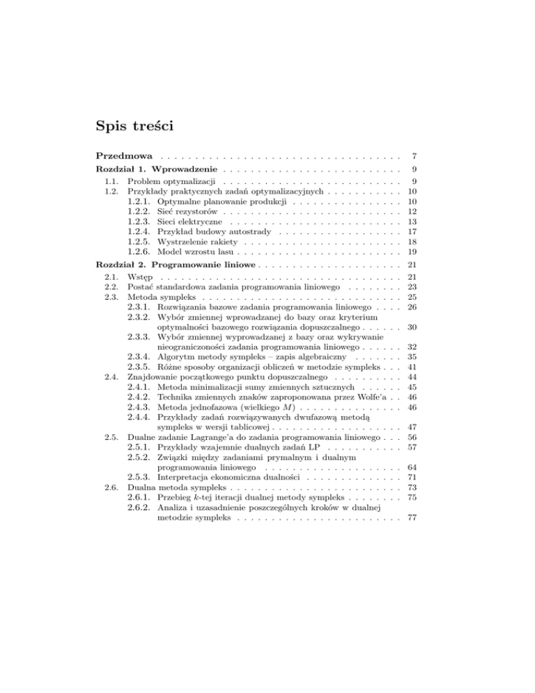 Spis treści Przedmowa . . . . . . . . . . . . . . . . . . . . . . . . . . . . . . . . . . . Rozdział 1. Wprowadzenie . . . . . . . . . . . . . . . 1.1. Problem optymalizacji . . . . . . . . . . . . . . . 1.2. Przykłady praktycznych zadań optymalizacyjnych 1.2.1. Optymalne planowanie produkcji . . . . . 1.2.2. Sieć rezystorów . . . . . . . . . . . . . . . 1.2.3. Sieci elektryczne . . . . . . . . . . . . . . 1.2.4. Przykład budowy autostrady . . . . . . . 1.2.5. Wystrzelenie rakiety . . . . . . . . . . . . 1.2.6. Model wzrostu lasu . . . . . . . . . . . . . . . . . . . . . . . . . . . . . . . . . . . . . . . . . . . . . . . . . . . . . . . . . . . . . . . . . . . . . . . . . . . . . . . . . . . . . 7 . . . . . . . . . . . . . . . . . . . . . . . . . . . 9 9 10 10 12 13 17 18 19 Rozdział 2. Programowanie liniowe . . . . . . . . . . . . . . . . . . . 2.1. Wstęp . . . . . . . . . . . . . . . . . . . . . . . . . . . . . . . . . 2.2. Postać standardowa zadania programowania liniowego . . . . . . 2.3. Metoda sympleks . . . . . . . . . . . . . . . . . . . . . . . . . . . 2.3.1. Rozwiązania bazowe zadania programowania liniowego . . 2.3.2. Wybór zmiennej wprowadzanej do bazy oraz kryterium optymalności bazowego rozwiązania dopuszczalnego . . . . 2.3.3. Wybór zmiennej wyprowadzanej z bazy oraz wykrywanie nieograniczoności zadania programowania liniowego . . . . 2.3.4. Algorytm metody sympleks – zapis algebraiczny . . . . . 2.3.5. Różne sposoby organizacji obliczeń w metodzie sympleks . 2.4. Znajdowanie początkowego punktu dopuszczalnego . . . . . . . . 2.4.1. Metoda minimalizacji sumy zmiennych sztucznych . . . . 2.4.2. Technika zmiennych znaków zaproponowana przez Wolfe’a 2.4.3. Metoda jednofazowa (wielkiego M ) . . . . . . . . . . . . . 2.4.4. Przykłady zadań rozwiązywanych dwufazową metodą sympleks w wersji tablicowej . . . . . . . . . . . . . . . . . 2.5. Dualne zadanie Lagrange’a do zadania programowania liniowego . 2.5.1. Przykłady wzajemnie dualnych zadań LP . . . . . . . . . 2.5.2. Związki między zadaniami prymalnym i dualnym programowania liniowego . . . . . . . . . . . . . . . . . . 2.5.3. Interpretacja ekonomiczna dualności . . . . . . . . . . . . 2.6. Dualna metoda sympleks . . . . . . . . . . . . . . . . . . . . . . . 2.6.1. Przebieg k-tej iteracji dualnej metody sympleks . . . . . . 2.6.2. Analiza i uzasadnienie poszczególnych kroków w dualnej metodzie sympleks . . . . . . . . . . . . . . . . . . . . . . . . . . . . . . . . 21 21 23 25 26 . . 30 . . . . . . . . . . . . . . 32 35 41 44 45 46 46 . . 47 . . 56 . . 57 . . . . . . . . 64 71 73 75 . . 77 4 Spis treści 2.6.3. Przykłady znajdowania rozwiązań za pomocą dualnej metody sympleks . . . . . . . . . . . . . . . . . . . . . . . . Zadanie transportowe . . . . . . . . . . . . . . . . . . . . . . . . . . Programowanie liniowe – algorytmy o wielomianowym nakładzie obliczeń . . . . . . . . . . . . . . . . . . . . . . . . . . . . . . . . . 2.9. Oprogramowanie do rozwiązywania zadań programowania liniowego 2.9.1. Pakiety powszechnie dostępne . . . . . . . . . . . . . . . . . 2.9.2. Pakiety komercyjne i systemy modelowania . . . . . . . . . 2.10. Zadania z programowania liniowego . . . . . . . . . . . . . . . . . . Rozwiązania . . . . . . . . . . . . . . . . . . . . . . . . . . . . . . . 2.7. 2.8. . 79 . 81 . . . . . . 84 87 88 94 100 110 Rozdział 3. Optymalizacja nieliniowa bez ograniczeń . . . . . . . . . 111 3.1. Zastosowania optymalizacji nieliniowej bez ograniczeń . . . . . . . . . 111 3.1.1. Zadania identyfikacji . . . . . . . . . . . . . . . . . . . . . . . 111 3.1.2. Układy równań nieliniowych . . . . . . . . . . . . . . . . . . . 112 3.1.3. Ciągi pomocniczych zadań bez ograniczeń w metodach 3.2. 3.3. 3.4. 3.5. 3.6. 3.7. optymalizacji z ograniczeniami . . . . . . . . . . . . . Pojęcie rozwiązania optymalnego . . . . . . . . . . . . . . . . Zadania optymalizacji wypukłej . . . . . . . . . . . . . . . . . 3.3.1. Zbiór wypukły . . . . . . . . . . . . . . . . . . . . . . 3.3.2. Funkcje wypukłe . . . . . . . . . . . . . . . . . . . . . 3.3.3. Własności zadań optymalizacji wypukłej . . . . . . . . Warunki optymalności dla zadań optymalizacji bez ograniczeń 3.4.1. Warunki konieczne dla funkcji różniczkowalnych . . . . 3.4.2. Warunki dostateczne . . . . . . . . . . . . . . . . . . . 3.4.3. Pojęcie ścisłej dodatniej określoności . . . . . . . . . . 3.4.4. Punkty stacjonarne . . . . . . . . . . . . . . . . . . . . Gradientowe metody kierunków poprawy . . . . . . . . . . . . 3.5.1. Kierunki poprawy . . . . . . . . . . . . . . . . . . . . 3.5.2. Metoda najszybszego spadku . . . . . . . . . . . . . . 3.5.3. Metoda Newtona . . . . . . . . . . . . . . . . . . . . . 3.5.4. Metody newtonowskie z aproksymacją różnicową . . . 3.5.5. Metody quasi-newtonowskie . . . . . . . . . . . . . . . 3.5.6. Metody kierunków sprzężonych . . . . . . . . . . . . . 3.5.7. Analiza zbieżności . . . . . . . . . . . . . . . . . . . . 3.5.8. Testy zatrzymania algorytmu . . . . . . . . . . . . . . 3.5.9. Modele kwadratowe . . . . . . . . . . . . . . . . . . . 3.5.10. Lokalna szybkość zbieżności . . . . . . . . . . . . . . . Minimalizacja w kierunku . . . . . . . . . . . . . . . . . . . . 3.6.1. Metody korzystające z pochodnych . . . . . . . . . . . 3.6.2. Algorytm kolejnych redukcji kroku . . . . . . . . . . . 3.6.3. Algorytm kwadratowych interpolacji i ekstrapolacji . . 3.6.4. Bezgradientowe metody minimalizacji w kierunku . . . Metoda sympleksu Neldera-Meada jako przykład metody poszukiwań prostych . . . . . . . . . . . . . . . . . . . . . . . . . . . . . . . . . . . . . . . . . . . . . . . . . . . . . . . . . . . . . . . . . . . . . . . . . . . . . . . . . . . . . . . . . . . . . . . . . . . . . . . . . . . . . . . . . . . . . . . . . . . . . . . . . . . 113 113 115 115 115 118 119 120 121 123 124 129 129 132 133 137 138 142 147 148 149 149 152 152 153 153 155 . . . . 160 5 S