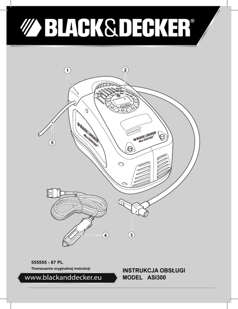 Powerful Solutions 555555 - 87 PL Tłumaczenie oryginalnej instrukcji www.blackanddecker.eu INSTRUKCJA OBSŁUGI MODEL ASI300 TM 1 6 3 A B 8 2 7 D C 6 E 2 9 POLSKI Zastosowanie zgodne z przeznaczeniem Bezpieczeństwo innych osób Zabrania się używania tego elektronarzędzia przez dzieci i osoby o ograniczonej sprawności fizycznej, czuciowej lub umysłowej. To samo dotyczy osób niedoświadczonych, chyba że znajdują się pod nadzorem odpowiedzialnego za bezpieczeństwo fachowca. Pilnuj dzieci, by nie bawiły się tym urządzeniem. Sprężarka Black & Decker jest przeznaczona do użytku domowego. Można nią pompować opony samochodowe i rowerowe, piłki itp. W tym celu sprężarkę przyłącza się albo do sieci prądu przemiennego 230 V, albo do 12 V gniazda zapalniczki samochodowej przy użyciu samochodowego kabla zasilającego. Urządzenie to nie nadaje się do celów przemysłowych. Po użyciu Nieużywaną sprężarkę przechowuj w suchym, dobrze wentylowanym miejscu poza zasięgiem dzieci. Uniemożliw dzieciom dostęp do przechowywanych urządzeń. Przy transportowaniu sprężarki w samochodzie umieść ją w bagażniku lub odpowiednim schowku, by nie mogła się przemieścić w razie nagłej zmiany prędkości lub kierunku ruchu. Wskazówki dotyczące bezpieczeństwa Uwaga! Przy korzystaniu z urządzeń sieciowych dokładnie przestrzegaj wskazówek zawartych w tej instrukcji i podstawowych przepisów bhp, by zminimalizować ryzyko pożaru, czy też doznania urazu ciała i szkód rzeczowych. Przed pierwszym użyciem sprężarki dokładnie przeczytaj niniejszą instrukcję. W instrukcji tej opisano zastosowanie sprężarki zgodne z przeznaczeniem. Używanie akcesoriów lub przystawek innych, niż zalecane w tej instrukcji, lub obsługiwanie sprężarki w sposób niezgodny z opisem grozi doznaniem urazu. Przechowuj niniejszą instrukcję, by w razie potrzeby móc z niej ponownie skorzystać. Kontrola i naprawy Przed użyciem sprężarki sprawdź, czy nie zawiera jakichś uszkodzonych elementów lub czy nie wystąpiły jakieś inne okoliczności, które mogą negatywnie wpłynąć na działanie urządzenia. Nie używaj sprężarki, gdy jakaś jej część jest niesprawna. W razie uszkodzenia jakiejś części zleć naprawę lub wymianę jednemu z naszych autoryzowanych warsztatów serwisowych. Nie wymieniaj ani nie usuwaj żadnych części nieopisanych w tej instrukcji. Zastosowanie sprężarki Z urządzeniem tym zawsze obchodź się ostrożnie. Zabrania się używania sprężarki przez dzieci lub osoby niepełnosprawne bez należytego nadzoru. Sprężarka nie jest zabawką. Nie dopuszczaj dzieci ani zwierząt do obszaru pracy. Pilnuj, aby dzieci nie dotykały sprężarki ani kabla sieciowego. Zachowaj szczególną ostrożność przy korzystaniu z sprężarki w pobliżu dzieci. Używaj sprężarki tylko w suchym otoczeniu. Uważaj, by jej nie zamoczyć. Nie zanurzaj sprężarki w wodzie. Nie próbuj otwierać obudowy. W jej wnętrzu nie ma żadnych elementów podlegających konserwacji. Nie używaj sprężarki w otoczeniu zagrożonym wybuchem, w którym znajdują się palne ciecze, gazy lub pyły. Nigdy nie ciągnij za kabel, by wyjąć wtyczkę z gniazda sieciowego. Grozi to uszkodzeniem kabla i wtyczki. Dodatkowe wskazówki bezpieczeństwa pracy sprężarek Tylko do użytku domowego i do samochodów. Do pompowania opon samochodowych i rowerowych, piłek, sprzętu do nauki pływania itd. Nie wdychaj sprężonego powietrza ze sprężarki. Nigdy nie wydychaj powietrza ze sprężarki ani aparatu powietrznego przyłączonego do sprężarki. Przy pompowaniu przedmiotów zawsze stosuj się do zaleceń producenta. Przekroczenie dopuszczalnej wartości ciśnienia powietrza może spowodować pęknięcie przedmiotu i doznanie urazu. Nigdy nie pozostawiaj załączonej sprężarki bez nadzoru. Opony bądź inne nadmuchiwane nią przedmioty mogą pęknąć 3 Na sprężarce umieszczono następujące symbole ostrzegawcze: Podczas pracy sprężarka wibruje i może się przemieszczać. Dlatego nigdy nie kładź jej na podwyższeniu. Ustawiaj ją wyłącznie na podłodze lub na stole roboczym, ale tak by nie mogła spaść. Nie naprawiaj sprężarki we własnym zakresie ani w inny sposób jej nie przerabiaj. Nie wierć w niej otworów, nie spawaj ani nie przerabiaj samego urządzenia lub końcówek. Nie korzystaj ze sprężarki przy pracującym silniku pojazdu. Używaj sprężarki tylko przy użyciu dostarczonych akcesoriów, przystosowanych do ciśnienia przynajmniej 11,03 bar/160 psi. Stosowanie akcesoriów niezalecanych do tego urządzenia może być niebezpieczne. Nie baw się sprężarką. Wysokie ciśnienie sprężonego powietrza jest niebezpieczne. Nigdy nie kieruj strumienia powietrza na siebie ani na inne osoby. Podczas pracy sprężarka może się nagrzewać. Po użyciu pozostaw ją na 30 minut w celu ochłodzenia przed schowaniem. Nigdy nie przenoś sprężarki za wężyk. Nigdy nie kieruj końcówki na osoby lub zwierzęta. Przechowuj sprężarkę poza zasięgiem dzieci. Ciśnieniomierz pokazuje tylko przybliżona wartość. Regularnie sprawdzaj ciśnienie powietrza w oponach przy użyciu specjalnego ciśnieniomierza. Przed uruchomieniem sprawdź kabel sieciowy, czy nie jest uszkodzony lub zużyty. Nigdy nie uruchamiaj sprężarki z uszkodzonym kablem sieciowym lub wtyczką. Przed użyciem sprężarki przeczytaj instrukcję obsługi. Chroń sprężarkę przed wilgocią i deszczem. Przed rozpoczęciem konserwacji lub czyszczenia wyjmij wtyczkę kabla z gniazda sieciowego. Nigdy nie pozostawiaj sprężarki bez nadzoru. Elementy sprężarki 1. Pokrywa schowka 2. Ciśnieniomierz 3. Wężyk z uniwersalną obsadą końcówek do pompowania 4. Kabel z wtyczką do zapalniczki samochodowej 12 V 5. Kabel z wtyczką sieciową 230 V Zastosowanie Schowek na wężyk i kabel (rys. A) Wężyk (3) i kabel sieciowy (5) przechowuj w schowku (1) na górze sprężarki (rys. A). Można je wyciągnąć przez ot
