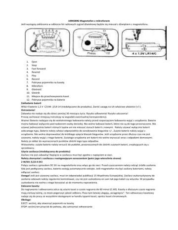 10903896 Magnetofon z mikrofonem Jeśli wystąpią zakłócenia w odbiorze fal radiowych sygnał dźwiekowy będzie się mieszał z dźwiękiem z magnetofonu. 1. Eject 2. Stop 3. Fast forward 4. Rewind 5. Play 6. Record 7. Pokrywa pojemnika na kasetę 8. Mikroforn 9. Głośność 10. Głośnik 11. Miejsce do przechowywania kaset 12. Pokrywa pojemnika na baterie Zakładanie baterii Włóż 4 baterie 1,5 V C/UM- 2/LR 14 (niedołączone do produktu). Zwróć uwagę na ich właściwe ułożenie (+/-). Ostrzeżenie! Zabawka nie nadaje się dla dzieci poniżej 36 miesiąca życia. Ryzyko udławienia! Ryzyko uduszenia! Proszę zachować niniejszą instrukcję na wypadek ewentualnej korespondencji. Ważne! Baterie nadające się do wielokrotnego ładowania należy przed rozpoczęciem ładowania wyjąć z urządzenia. Baterie można ładować wyłącznie pod nadzorem osoby dorosłej. Nie wolno ładować baterii, które nie są do tego przeznaczone. Nie używać jednocześnie baterii różnych typów ani nie mieszać starych baterii z nowymi. Należy używać wyłącznie baterii zalecanego typu. Baterie należy włożyć odpowiednio do oznakowania biegunów +/-. Zużyte baterie należy wyjąć z urządzenia. Nie wolno doprowadzać do krótkiego spięcia blaszek biegunów. Jeśli urządzenie przez dłuższy czas nie jest używane, należy wyjąć z niego baterie. Zużytego urządzenia ani baterii nie wolno wyrzucać wraz z odpadami domowymi. Należy je oddać do wyznaczonych punktów zbiórki tego typu odpadów. Wskazówka: zużyte baterie należy wrzucić do pudełek, przeznaczonych do zbiórki zużytych baterii, znajdujących się u sprzedawcy. Użycie zasilacza (niedołączony do produktu) Zasilacz nie jest zabawką! Napięcie w zasilaczu musi być zgodne z napięciem w sieci. Należy skorzystać z zasilacza z następoującym oznaczeniem (patrz jego wierzchnia strona) 2 W/6V; 0,33 A DCI Połącz zasilacz z gniazdem DC 6V na magnetofonie oraz włącz go do sieci. Przed czyszczeniem należy odciąć źródło zasilania. Gdy jest podłączony zasilacz, baterie zostają automatycznie odcięte. Jeśli magnetofon ma być zasilany bateriami, należy odłączyć zasilacz. Uwaga! Jeśli jest używany zasilacz, musi on odpowiadać publikacji 15 Wspólnoty Europejskiej. Zasilacz wykorzystywany do zasilania zabewek należy regularnie kontrolować, czy nie jest uszkodzony on sam lub jego kabel czy wtyczka. W przypadku uszkodzenia nie wolno z niego korzystać aż do momentu naprawienia. Zalecane kasety: Do nagrywania i odtwarzania zelca się użycie kaset o czasie nagrania do 60 minut (C-60). Kasety o dłuższym czasie nagrania mają cieńszą taśmę, co może pogorszyć jakość odbioru. Poza tym łatwiej ulegają „wciągnięciu”. Ten odtwarzacz kasetowy nadaje się do pracy ze wszystkimi dostępnymi w handlu typami kaset, oprócz kaset chromowych. Obsługa: EJECT: wciśnij, aby otworzyć pojemnik na kasetę STOP: wciśnij ten przycisk do połowy, aby zatrzymać odtwarzanie FAST FORWARD (F.FWD): szybkie przewijanie. Trzymaj przycisk wcisnięty aż do pożądanego miejsca na kasecie. REWIND (REW): szybkie cofanie taśmy. Trzymaj przycisk wciśnięty aż do pożądanego miejsca na kasecie. PLAY: wciśnij przycisk. Na końcu taśmy przycisk wyskoczy automatycznie. RECORD (REC):Aby rozpocząć nagrywanie wciśnij jednocześnie przyciski REC I PLAY. Na końcu taśmy przyciski wyskoczą automatycznie. Wkładanie kasety: Aby otworzyć pojemnik na kasety wciśnij przycisk EJECT. Włóż kasetę do pojemnika, otworem do góry. Ręcznie zamknij klapę. Jeśli klapa nie daje się zamknąć, sprawdź, czy kaseta została dobrze włożona. Przed odtwarzaniem i nagrywaniem: Uważaj na to, aby taśma kasety została w całości nawinięta na prawą szpulkę. Dopiero teraz można rozpocząć odtwarzanie lub nagrywanie. Korzystanie z mikrofonu: Odtwarzacz kasetowy jest wyposażony w mikrofon, z włącznikiem ON/OFF. Do mikrofonu należy mówić lub śpiewać z normalną głośnością, trzymając mikrofon oddalony od ust na ok. 3 cm. Należy unikać sytuacji, w której mikrofon znajdzie się zbyt blisko głośnika. Gdy mokrofon nie jest używany, należy go wyłączyć. Odtwarzanie: Wciśnij przycisk PLAY aż całkowicie zaskoczy. Przy pomocy „VOLUME” ustaw pożądaną głośność. Nagrywanie: Wciśnij na raz przyciski PLAY i REC, aż wskoczą na swoje miejsce. Do mikrofon należy mówić lub śpiewać z normalną głośnością, trzymając mikrofon oddalony od ust na ok. 3 cm. Śpiewanie razem z odtwarzanym utworem: Włóż kasetę do odtwarzacza. Włącz mikrofon. Wciśnij przycisk PLAY. Przy pomocy „VOLUME” ustaw pożądaną głośność. Wskazówka: jeśli przycisk nie wskoczy na swoje miejsce ani podczas odtwarzania ani podczas nagrywania, proszę sprawdzić, czy kaseta nie jest pełna. Nagrywanie i odtwarzanie można w każdej chwili przerwać wciskając przycisk STOP. Pojemnik do przechowywania kaset: Dodatkową kasete można przechowac w pojemniku, znajdującym się z tyłu urządzenia. Konserwacja: Aby zachować odpowiednią jakość odtwarzania, głowica i szpula dociskająca muszą być regularnie czyszczone. To na nich osadza się kurz i brud. Czyszczenie po ok. 10 godzinach użytkowania zminimalizuje ryzyko pogorszenia się jakości odtwarzania. Otwórz pojemnik na kasetę. Usuń zanieczyszczenia z głowicy i szpuli dociskającej przy pomocy patyczka do czyszczenia uszu, zwilżonego alkoholem. Ponadto w handlu są dostepne specjalne kasety czyszczące. Jeśli korzystasz z takiej kasety włóż ją do pojemnika, wciśnij przycisk REC. Należy pozwolić aby taśma przewinęła się do końca. Po zakończeniu sprawdź, czy głowica i szpula zostały odpowiednio wyczyszczone. Jeśli jest taka potrzeba, cały proces należy powtórzyć.