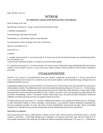 Sygn. akt III C 1612/14 WYROK W IMIENIU RZECZYPOSPOLITEJ POLSKIEJ Dnia 18 lutego 2016 roku Sąd Okręgowy Warszawa - Praga w Warszawie III Wydział Cywilny w składzie następującym: Przewodniczący: SSO Maria Furmanik Protokolant: p.o. protokolant sądowy Anna Banasiak po rozpoznaniu w dniu 04 lutego 2016 roku w Warszawie sprawy z powództwa G. B. przeciwko K. C. o zapłatę I. zasądza od pozwanej K. C. na rzecz powoda G. B. kwotę 109.167,82 (sto dziewięć tysięcy sto sześćdziesiąt siedem, 82/100) złotych wraz z ustawowymi odsetkami od dnia 11 września 2014 roku do dnia zapłaty; II. zasądza od pozwanej K. C. na rzecz powoda G. B. kwotę 9.059,00 (dziewięć tysięcy pięćdziesiąt dziewięć) złotych tytułem zwrotu kosztów procesu, w tym 3.600 (trzy tysiące sześćset) złotych tytułem zwrotu kosztów zastępstwa prawnego. UZASADNIENIE Powód G. B. w pozwie z 20 października 2014 roku wniósł o zasądzenie od pozwanej K. C. kwoty 109.167,82 zł wraz z odsetkami ustawowymi od 11 września 2014 roku do dnia zapłaty z tytułu bezpodstawnego wzbogacenia oraz zasądzenie kosztów procesu. Uzasadniając żądanie pozwu powód wskazał, że od stycznia 2007 roku do lipca 2013 roku pozostawał z pozwaną w nieformalnym związku. W październiku 2007 roku strony kupiły mieszkanie położone w W. przy ul. (...). Pomimo tego, że nieruchomość została zakupiona na własność pozwanej, powód wniósł cały wkład finansowy w jego zakup. Zakup nieruchomości na pozwaną tłumaczył faktem, że był w trakcie rozwodu z żoną i bez jej zgody nie mógł nabyć prawa do lokalu mieszkalnego. Wobec rozwiązania związku faktycznego stron, powstała potrzeba dokonania rozliczenia nakładów poniesionych przez powoda na majątek osobisty pozwanej. W odpowiedzi na pozew pozwana K. C. wnosiła o oddalenie powództwa oraz zasądzenie kosztów procesu, wskazując, że lokal mieszkalny kupiła za własne pieniądze, zaoszczędzone z prowadzenia własnej działalności gospodarczej. Pozwana podniosła ponadto, że przez cały okres trwania konkubinatu utrzymywała powoda. Strony prowadziły wygodne życie, którego koszty znacznie przekraczały wartość zakupionego przez strony mieszkania. Sąd ustalił, co następuje: Strony pozostawały ze sobą w nieformalnym związku od 2007 roku. Wówczas jeszcze powód był żonaty, a rozwód uzyskał w 2008 roku – wyrok Sądu Okręgowego w Gdańsku z 21 kwietnia 2008 roku, sygn. akt III C 1659/07 k. 8. Na początku znajomości stron pojawiła się możliwość zakupu mieszkania położonego w W. przy ul. (...). Mieszkanie sprzedawał znajomy pozwanej – T. L., który z uwagi na długoletnią znajomość z pozwaną zgodził się sprzedać lokal mieszalny po okazyjnej cenie. W tym czasie powód prowadził własną działalność gospodarczą – produkcję urządzeń okrętowych dla stoczni, osiągając dochody w wysokości 100.000 – 150.000 zł rocznie, pozwana otrzymywała rentę po zmarłym mężu w wysokości 2.600 zł miesięcznie (od 2000 roku). W latach 1979 – 1990 pozwana prowadziła własną działalność gospodarczą, następnie pomagała mężowi w prowadzeniu firmy transportowej. Po jego śmierci, z pieniędzy uzyskanych z likwidacji firmy, kupiła jednej z córek mieszkanie przy ul. (...) w W. oraz wykupiła mieszkanie służbowe męża przy ul. (...) w W.. Zgodnie z ustaleniami stron, pieniądze na zakup mieszkania przy ul. (...) w W. miał wyłożyć powód i to on miał figurować w akcie notarialnym jako nabywca lokalu. Powód załatwiał u notariusza wszystkie formalności związane z kupnem mieszkania, natomiast pozwana prowadziła negocjacje ze sprzedającym T. L., z uwagi na to, że go bardzo dobrze znała. Jeszcze na dzień 21 września 2007 roku podając notariuszowi dane do aktu notarialnego strony wskazywały powoda jako kupującego lokal mieszkalny – korespondencja elektroniczna dot. zawarcia umowy sprzedaży k. 84 – 86. Z uwagi jednak na to, że przed zawarciem umowy sprzedaży powód nie uzyskał prawomocnego wyroku rozwodowego, strony postanowiły, że w akcie notarialnym umowy sprzedaży jako kupujący będzie figurowała pozwana, która po uzyskaniu przez powoda rozwodu miała nieodpłatnie przenieść na niego prawa własności mieszkania. Całą uzgodnioną ze sprzedającym T. L. cenę mieszkania, tj. 105.000 zł zapłacił powód, dokonując na rzecz sprzedającego następujących wpłat: 10.000 zł w dniu 21 sierpnia 2007 roku (przelew – wyciąg z rachunku bankowego k. 9), 60.000 zł w dniu 21 sierpnia 2007 roku (wpłata gotówkowa – pokwitowanie k. 10), 15.000 zł w dniu 3 października 2007 roku (przelew – wyciąg z rachunku bankowego k. 11), 5.000 zł w dniu 4 października 2007 roku (przelew – wyciąg z rachunku bankowego k. 11), 5.000 zł w dniu 4 października 2007 roku (wpłata gotówkowa przy podpisaniu aktu notarialnego), 5.000 zł w dniu 11 grudnia 2007 roku (przelew – historia rachunku k. 12), 5.000 zł w dniu 28 grudnia 2007 roku (przelew – historia rachunku k. 12); ponadto powód pokrył koszty notarialne w wysokości 4.167,82 zł. Jako rozliczenie ceny kupna mieszkania powód zaproponował sprzedającemu swój samochód osobowy marki M. (...), ale T. L. nie był tym zainteresowany. W dniu 21 sierpnia 2007 roku powód sprzedał samochód innej osobie za kwotę 48.000 zł, którą następnie w tym samym dniu przekazał sprzedającemu jako zaliczkę na zakup mieszkania – umowa kupna-sprzedaży samochodu k. 13. W dniu 4 października 2007 roku w Kancelarii Notarialnej w M., T. L. i K. C. zawarli umowę sprzedaży, Repertorium (...), na podstawie której pozwana nabyła lokal mieszkalny nr (...) położony w W. przy ul. (...) o powierzchni użytkowej 21,38 m( 2), składający się z jednego pokoju, kuchni i łazienki, za cenę 105.000,00 zł; na poczet ceny sprzedający otrzymał kwotę 95.000 zł, pozostałą część ceny sprzedaży, tj. kwotę 10.000 zł pozwana zobowiązała