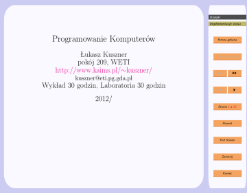 Kolejki Implementacje stosu Programowanie Komputerów Łukasz Kuszner pokój 209, WETI http://www.kaims.pl/∼kuszner/ Strona główna Strona tytułowa JJ II J I [email protected] Wykład 30 godzin, Laboratoria 30 godzin 2012/ Strona 1 z 12 Powrót Full Screen Zamknij Koniec Kolejki Implementacje stosu Strona główna Strona tytułowa 1. JJ II J I Kolejki • Kolejka FIFO (ang. first in first out) • Kolejka LIFO (ang. last in first out) - stos. Strona 2 z 12 Powrót Full Screen Zamknij Koniec Kolejki Implementacje stosu Strona główna Strona tytułowa Interfejs stosu (przykład) JJ II J I Operacje wykonywane na stosie • push(element) - odłóż element na stos • pop() - pobierz element ze stosu • isEmpty() - sprawdź, czy stos jest pusty Strona 3 z 12 Powrót Full Screen Zamknij Koniec Kolejki Implementacje stosu Strona główna Strona tytułowa 2. Możliwe implementacje stosu • tablica - ograniczona liczba przechowywanych elementów • rozszerzalna tablica JJ II J I Strona 4 z 12 • lista łączona Powrót Full Screen Zamknij Koniec Stos w tablicy Kolejki Implementacje stosu Rozpatrzmy klasę Klient: Strona główna class K l i e n t { public string i m i e ; public string nazwisko ; public string imieNazwisko { g e t { return i m i e + ” ” + nazwisko ; } } public override string ToString ( ) { return imieNazwisko ; } public K l i e n t ( string imie , string nazwisko ) { i f ( i m i e == ”” ) throw new Exception ( ) ; this . i m i e = i m i e ; i f ( nazwisko == ”” ) throw new Exception ( ) ; this . nazwisko = nazwisko ; } Strona tytułowa JJ II J I Strona 5 z 12 Powrót Full Screen Zamknij } Koniec Kolejki Implementacje stosu Strona główna Stos w tablicy c.d. Pierwsza próba implementacji stosu dla konkretnej klasy. Przykład 1. Strona tytułowa JJ II J I class S t o s { private K l i e n t [ ] k l i e n c i ; private int SP = 0 ; public S t o s ( ) { k l i e n c i = new K l i e n t [ 1 0 ] ; } public void push ( K l i e n t k ) { k l i e n c i [ SP++] = k ; } public K l i e n t pop ( ) { return k l i e n c i [−−SP ] ; } public bool isEmpty ( ) { return SP == 0 ; } } Strona 6 z 12 Powrót Full Screen Zamknij Koniec Kolejki Implementacje stosu Stos w tablicy c.d. Próba wykorzystania takiego stosu: class Program { static void Main ( ) { Klient x ; S t o s s = new S t o s ( ) ; x = new K l i e n t ( ”Jan” , ” Kowalski ” ) ; s . push ( x ) ; x = new K l i e n t ( ” Marian ” , ”Nowak” ) ; s . push ( x ) ; while ( ! s . isEmpty ( ) ) { Console . WriteLine ( s . pop ( ) ) ; } Strona główna Strona tytułowa JJ II J I Strona 7 z 12 Powrót Full Screen } } Zamknij Koniec Kolejki Implementacje stosu Strona główna Strona tytułowa Stos w tablicy c.d. JJ II J I Co się stanie, gdy? • pobieramy element z pustego stosu? • odłożymy element na stos, który jest już pełny? • dlaczego akurat 10 elementów jest ograniczeniem? Strona 8 z 12 Powrót Full Screen Zamknij Koniec Kolejki Implementacje stosu Strona główna Strona tytułowa Stos w tablicy c.d. JJ II public K l i e n t pop ( ) { J I i f (SP == 0) throw new Exception ( ” S t o s c l a s s e r r o r : ” + ” Stack i s empty w h i l e the element i s f e t c h e d ” ) ; Strona 9 z 12 return k l i e n c i [−−SP ] ; } Powrót Full Screen Zamknij Koniec Kolejki Implementacje stosu Strona główna Stos w tablicy c.d. public void push ( K l i e n t k ) { i f (SP == c a p a c i t y ) { K l i e n t [ ] temp = new K l i e n t [ c a p a c i t y ∗ 2 ] ; for ( int i = 0 ; i < k l i e n c i . Length ; ++i ) { temp [ i ] = k l i e n c i [ i ] ; } k l i e n c i = temp ; c a p a c i t y ∗= 2 ; } Strona tytułowa JJ II J I Strona 10 z 12 Powrót k l i e n c i [ SP++] = k ; } Full Screen Zamknij Koniec Kolejki Implementacje stosu Strona główna Stos w tablicy c.d. public void push ( K l i e n t k ) { i f (SP == c a p a c i t y ) { K l i e n t [ ] temp = new K l i e n t [ c a p a c i t y ∗ 2 ] ; for ( int i = 0 ; i < k l i e n c i . Length ; ++i ) { temp [ i ] = k l i e n c i [ i ] ; } k l i e n c i = temp ; c a p a c i t y ∗= 2 ; } Strona tytułowa JJ II J I Strona 11 z 12 Powrót k l i e n c i [ SP++] = k ; } Full Screen Zamknij Koniec Kolejki Implementacje stosu Strona główna Strona tytułowa JJ II J I Strona 12 z 12 Powrót Full Screen Zamknij Koniec