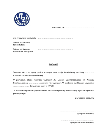 Warszawa, dn. …………………………………….. Imię i nazwisko kandydata: ………………………………..…………… Telefon kontaktowy do kandydata ………………………………..…………… Telefon kontaktowy do rodziców kandydata ………………………………..…………… PODANIE Zwracam się z uprzejmą prośbą o rozpatrzenie mojej kandydatury do klasy ………….. w ramach rekrutacji uzupełniającej. W pierwszym etapie rekrutacji wybrałem XV Liceum Ogólnokształcące im. Narcyzy Żmichowskiej na …………….. pozycji / nie wybrałem. W systemie punktowym uzyskałem ……………………. do wybranej klasy w XV LO. Do podania załączam kopię świadectwa ukończenia gimnazjum oraz kopię wyników egzaminu gimnazjalnego. Z wyrazami szacunku ……...……………………………………. (podpis kandydata) …………………………………………… (podpis rodzica kandydata)