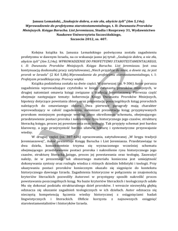 Janusz Lemański, „Szukajcie dobra, a nie zła, abyście żyli” (Am 5,14a). Wprowadzenie do profetyzmu starotestamentalnego, t. II: Dwunastu Proroków Mniejszych. Księga Barucha. List Jeremiasza, Studia i Rozprawy 31, Wydawnictwo Naukowe Uniwersytetu Szczecińskiego, Szczecin 2012, ss. 407. Kolejna książka ks. Janusza Lemańskiego poświęcona została zagadnieniu profetyzmu w dawnym Izraelu, na co wskazuje jasno jej tytuł: „Szukajcie dobra, a nie zła, abyście żyli” (Am 5,14a). WPROWADZENIE DO PROFETYZMU STAROTESTAMENTALNEGO, t. II: Dwunastu Proroków Mniejszych. Księga Barucha. List Jeremiasza. Jest ona kontynuacją doskonałej pracy zatytułowanej „Niech przyjdzie do mnie, a dowie się, że jest prorok w Izraelu” (2 Krl 5,8b).Wprowadzenie do profetyzmu starotestamentalnego, t. I: Profetyzm przedklasyczny. Prorocy więksi. Książka podzielona została na dwie części. W pierwszej (ss. 9-‐306) Autor porusza zagadnienia wprowadzające czytelnika w księgi dwunastu proroków mniejszych, w drugiej natomiast omawia księgi związane z tradycją Jeremiaszową. Pierwsza część obejmuje następujące tematy: koherencja Księgi Dwunastu Proroków Mniejszych, hipotezy dotyczące powstania zbioru oraz prezentację poszczególnych ksiąg prorockich należących do omawianego zbioru. Dwa pierwsze paragrafy mają charakter wprowadzający w całość zagadnienia, natomiast prezentacja ksiąg przypisywanych prorokom mniejszym postępuje według jasno określonego schematu, obejmującego: przedstawienie postaci proroka i nakreślenie rysu historycznego jego czasów, strukturę literacką księgo, proces jej powstawania oraz teologię. Tak przyjęty schemat jest bardzo klarowny, a jego przejrzystość bardzo ułatwia lekturę i systematyczne przyswajanie wiedzy. W drugiej części (ss. 307-‐426) opracowania, zatytułowanej „W kręgu tradycji Jeremiaszowej”, Autor prezentuje Księgę Barucha i List Jeremiasza. Przedstawiając te dwa dzieła, konsekwentnie trzyma się wyznaczonego wcześniej schematu obejmującego: przedstawienie postaci proroka i nakreślenie rysu historycznego jego czasów, strukturę literacką księgo, proces jej powstawania oraz teologię. Zauważyć należy, że w prezentacji tak obszernego materiału konieczna jest umiejętność dokonywania syntezy oraz rozległa wiedza z różnych dziedzin biblistyki i teologii. Przy ukazywaniu postaci proroków koniecznym okazało się sięgnięcie do kontekstu historycznego dawnego Izraela. Zagadnienia historyczne w połączeniu ze znajomością kryteriów literackich pozwoliły Autorowi w przystępny sposób nakreślić proces powstawania poszczególnych ksiąg. Na bazie kryteriów literackich i teologicznych udało Mu się dokonać podziału strukturalnego dzieł proroków. I wreszcie niezwykłą głębią odznacza się ukazanie zagadnień teologicznych w ich dziełach. Autor odznacza się nieczęstą kompetencją łączenia wiedzy historycznej z osiągnięciami badań lingwistycznych i literackich. Obficie korzysta z najnowszych osiągnięć starotestamentalistów i historyków Izraela. Ks. J. Lemański operuje poprawnym i bogatym słownictwem, język książki jest naukowy, aczkolwiek zrozumiały. Wnioski są formułowane w sposób zrozumiały i kompetentny; są dobrze uargumentowane i uzasadnione w treści pracy. Odznaczają się logicznością wywodu i wynikają bezpośrednio z przeprowadzonych analiz. Trzeba także zauważyć dużą kompetencję Autora w posługiwaniu się językami biblijnymi. Walorem w tym względzie jest poprawna i jednolita w całej książce transkrypcja wyrazów hebrajskich. Książka zawiera także wykaz skrótów i bibliografię. Ta ostatnia podzielona została na kilka części: teksty źródłowe, słowniki, bibliografia ogólna dotycząca profetyzmu oraz bibliografia dotycząca poszczególnych proroków (komentarze i literatura pomocnicza), a także „pozostała literatura”. Taki podział jest niezwykle klarowny. Zebrana literatura jest bardzo obfita. Autor dotarł do wielu pozycji trudno dostępnych. Należy podkreślić, że bazuje przede wszystkim na literaturze obcojęzycznej, przez co udostępnia polskiemu czytelnikowi wyniki badań nad profetyzmem w zagranicznych ośrodkach. Praca zawiera dużo przypisów, niekiedy bardzo obszernych, które wskazują na umiejętne posługiwanie się literaturą. Redakcja przypisów jest jednolita, poprawna. Fakt, że niekiedy przypisy są obszerne stanowi o walorze książki – przypisy te bowiem zawierają dyskusję na tematy, które są ważne dla omawianych zagadnień, jednak nie obciążają one zasadniczego tekstu. Nie ulega wątpliwości, że książka ks. Lemańskiego znacznie ubogaciła polski rynek teologiczny w zakresie teologii biblijnej. Jest to opracowanie niezwykle rzetelne i pod każdym względem naukowe; uwzględnia najnowsze badania i światową literaturę dotyczącą profetyzmu. Książka stanowić może charakter podręcznika dla studentów kierunków teologicznych, aczkolwiek przeznaczona jest nie tylko dla studentów. Jej odbiorcami z powodzeniem mogą być zawodowi teologowie, którzy w nauce zajmują się zagadnieniem profetyzmu. ks. Mariusz Rosik