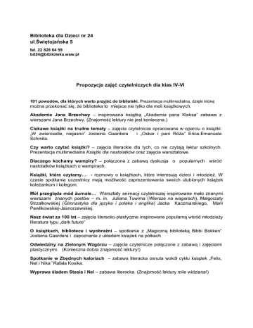 Biblioteka dla Dzieci nr 24 ul.Świętojańska 5 tel. 22 828 64 59 [email protected] Propozycje zajęć czytelniczych dla klas IV-VI 101 powodów, dla których warto przyjść do biblioteki. Prezentacja multimedialna, dzięki której można przekonać się, że biblioteka to miejsce nie tylko dla moli książkowych. Akademia Jana Brzechwy – inspirowana książką „Akademia pana Kleksa” zabawa z wierszami Jana Brzechwy. (Znajomość lektury nie jest konieczna.) Ciekawe książki na trudne tematy – zajęcia czytelnicze opracowane w oparciu o książki: „W zwierciadle, niejasno” Josteina Gaardera i „Oskar i pani Róża” Erica-Emanuela Schmita. Czy warto czytać książki? – zajęcia literackie dla tych, co nie czytają lektur szkolnych. Prezentacja multimedialna Książki dla nastolatków oraz zajęcia warsztatowe. Dlaczego kochamy wampiry? – połączona z zabawą dyskusja o popularnych wśród nastolatków książkach o wampirach. Książki, które czytamy… - rozmowy o książkach, które interesują dzieci i młodzież. W czasie spotkania uczestnicy mają możliwość zaprezentowania swoich ulubionych książek koleżankom i kolegom. Mól przegląda mód żurnale… Warsztaty animacji czytelniczej inspirowane mało znanymi wierszami znanych poetów – m. in. Juliana Tuwima (Wiersze na wagarach), Małgorzaty Strzałkowskiej (Gimnastyka dla języka i polaka i anglika) Jacka Kaczmarskiego, Marii Pawlikowskiej-Jasnorzewskiej. Nasz świat za 100 lat – zajęcia literacko-plastyczne inspirowane popularną wśród młodzieży literatura typu „dark future” O książkach, bibliotece i wyobraźni – spotkanie z „Magiczną biblioteką Bibbi Bokken” Josteina Gaardera i zapoznanie z układem książek na półkach Odwiedziny na Zielonym Wzgórzu – zajęcia czytelnicze połączone z zabawą i zajęciami plastycznymi. (Konieczna dobra znajomość lektury!) Spotkanie w Zbędnych kaloriach – zabawa literacka osnuta wokół cyklu książek „Felix, Net i Nika” Rafała Kosika. Wyprawa śladem Stasia i Nel – zabawa literacka. (Znajomość lektury mile widziana!)