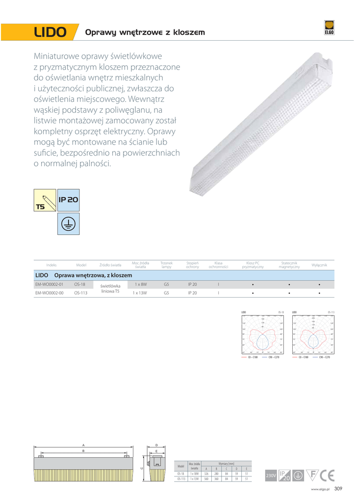 LIDO Oprawy wnętrzowe z kloszem Miniaturowe oprawy świetlówkowe z pryzmatycznym kloszem przeznaczone do oświetlania wnętrz mieszkalnych i użyteczności publicznej, zwłaszcza do oświetlenia miejscowego. Wewnątrz wąskiej podstawy z poliwęglanu, na listwie montażowej zamocowany został kompletny osprzęt elektryczny. Oprawy mogą być montowane na ścianie lub suficie, bezpośrednio na powierzchniach o normalnej palności. IP 20 Indeks Źródło światła Moc źródła światła Trzonek lampy Stopień ochrony Klasa ochronności Klosz PC pryzmatyczny Statecznik magnetyczny Wyłącznik 1 x 8W G5 IP 20 I • • • 1 x 13W G5 IP 20 I • • • Oprawa wnętrzowa, z kloszem EM-WO0002-01 OS-18 EM-WO0002-00 OS-113 świetlówka liniowa T5 LIDO OS-18 LIDO 135° 135° 120° 120° 105° 105° 105° 90° 90° 90° 90° 75° 75° 75° 75° 60° 60° 60° 45° 45° 135° 150° 165° 180° 165° 150° OS-113 150° 165° 160 30° 15° C0 – C180 A D B E Model Moc źródła światła OS-18 OS-113 1 x 18W 1 x 13W A 326 560 B 280 360 Wymiary [mm] C D 84 59 84 59 E 51 51 0° 165° 150° 135° 15° 30° C90 – C270 230V 120° 120 80 45° 180° 200 160 120 120° C LIDO Model 80 105° 60° 30° 15° C0 – C180 0° 15° 30° 45° C90 – C270 IP 20 www.elgo.pl 309