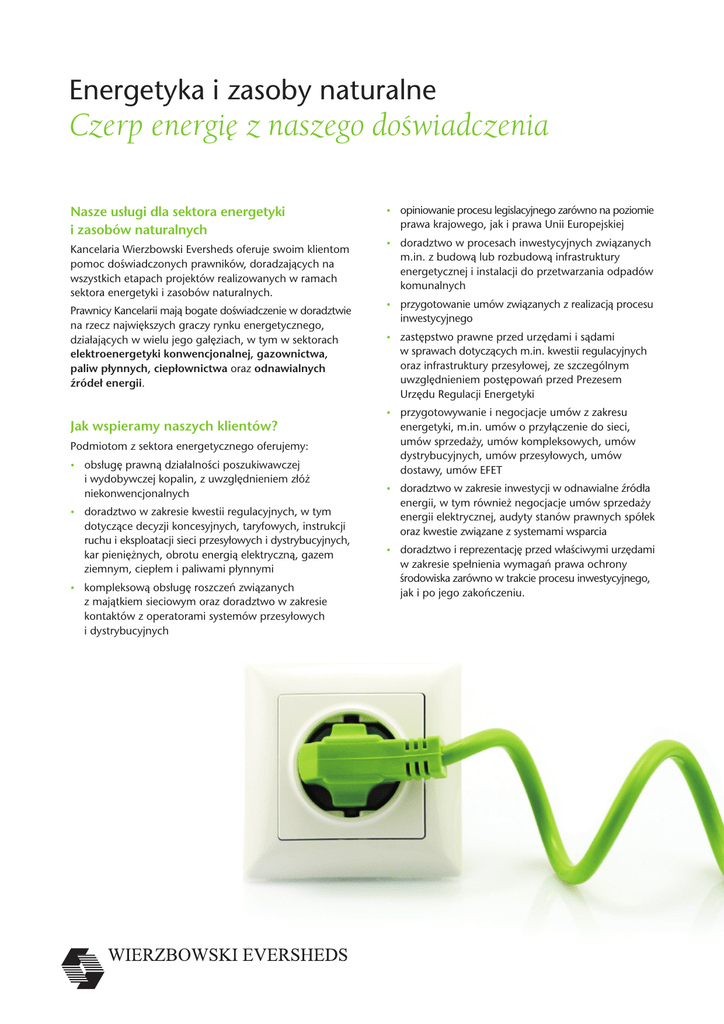 Energetyka i zasoby naturalne Czerp energiê z naszego doœwiadczenia Nasze us³ugi dla sektora energetyki i zasobów naturalnych Kancelaria Wierzbowski Eversheds oferuje swoim klientom pomoc doœwiadczonych prawników, doradzaj¹cych na wszystkich etapach projektów realizowanych w ramach sektora energetyki i zasobów naturalnych. Prawnicy Kancelarii maj¹ bogate doœwiadczenie w doradztwie na rzecz najwiêkszych graczy rynku energetycznego, dzia³aj¹cych w wielu jego ga³êziach, w tym w sektorach elektroenergetyki konwencjonalnej, gazownictwa, paliw p³ynnych, ciep³ownictwa oraz odnawialnych Ÿróde³ energii. opiniowanie procesu legislacyjnego zarówno na poziomie ? prawa krajowego, jak i prawa Unii Europejskiej doradztwo w procesach inwestycyjnych zwi¹zanych ? m.in. z budow¹ lub rozbudow¹ infrastruktury energetycznej i instalacji do przetwarzania odpadów komunalnych przygotowanie umów zwi¹zanych z realizacj¹ procesu ? inwestycyjnego zastêpstwo prawne przed urzêdami i s¹dami ? w sprawach dotycz¹cych m.in. kwestii regulacyjnych oraz infrastruktury przesy³owej, ze szczególnym uwzglêdnieniem postêpowañ przed Prezesem Urzêdu Regulacji Energetyki przygotowywanie i negocjacje umów z zakresu ? Jak wspieramy naszych klientów? Podmiotom z sektora energetycznego oferujemy: obs³ugê prawn¹ dzia³alnoœci poszukiwawczej ? i wydobywczej kopalin, z uwzglêdnieniem z³ó¿ niekonwencjonalnych doradztwo w zakresie kwestii regulacyjnych, w tym ? dotycz¹ce decyzji koncesyjnych, taryfowych, instrukcji ruchu i eksploatacji sieci przesy³owych i dystrybucyjnych, kar pieniê¿nych, obrotu energi¹ elektryczn¹, gazem ziemnym, ciep³em i paliwami p³ynnymi kompleksow¹ obs³ugê roszczeñ zwi¹zanych ? z maj¹tkiem sieciowym oraz doradztwo w zakresie kontaktów z operatorami systemów przesy³owych i dystrybucyjnych energetyki, m.in. umów o przy³¹czenie do sieci, umów sprzeda¿y, umów kompleksowych, umów dystrybucyjnych, umów przesy³owych, umów dostawy, umów EFET doradztwo w zakresie inwestycji w odnawialne Ÿród³a ? energii, w tym równie¿ negocjacje umów sprzeda¿y energii elektrycznej, audyty stanów prawnych spó³ek oraz kwestie zwi¹zane z systemami wsparcia doradztwo i reprezentacjê przed w³aœciwymi urzêdami ? w zakresie spe³nienia wymagañ prawa ochrony œrodowiska zarówno w trakcie procesu inwestycyjnego, jak i po jego zakoñczeniu. Energetyka i zasoby naturalne Czy wiesz, ¿e... 1 Eversheds aktywnie dzia³a w sektorze energii od wielu lat. W sk³ad naszego wszechstronnego zespo³u wchodzi kilkudziesiêciu prawników pracuj¹cych w naszych biurach na terenie Europy, Azji i Bliskiego Wschodu, w tym tak¿e w warszawskim biurze Wierzbowski Eversheds. 2 Prawnicy Eversheds wykazuj¹ siê nieprzeciêtn¹ znajomoœci¹ struktur regulacyjnych i umownych sektora energetycznego, a tak¿e zagadnieñ gospodarczych i kwestii biznesowych, z jakimi borykaj¹ siê najwiêksi gracze tego rynku - spó³ki obrotu, dystrybutorzy, wytwórcy, spó³ki deweloperskie, inwestorzy czy operatorzy systemów przesy³owych. 3 Informator Legal 500 EMEA 2013 rekomenduje nasz¹ kancelariê i prawników w 11 dziedzinach prawa: prawo konkurencji i antymonopolowe, bankowoœæ i finanse, rynki kapita³owe, doradztwo korporacyjne i M&A, rozstrzyganie sporów, prawo pracy, energia i zasoby naturalne, w³asnoœæ intelektualna, prawo nieruchomoœci, TMT i doradztwo podatkowe. 4 Nasi prawnicy czêsto komentuj¹ zagadnienia zwi¹zane ze zmianami w sektorze energetycznym w takich mediach, jak m.in. Centrum Informacji o Rynku Energii (cire.pl) czy Wirtualny Nowy Przemys³ (wnp.pl). Opinie naszych ekspertów w zakresie prawa energetycznego s¹ równie¿ cytowane przez opiniotwórcze dzienniki, m.in. Gazetê Prawn¹ oraz czasopisma specjalistyczne, takie jak „Energia Elektryczna”. 5 6 Dzielimy siê wiedz¹ – naszym klientom oferujemy szereg szkoleñ i warsztatów, dziêki którym mog¹ efektywniej prowadziæ swoj¹ dzia³alnoœæ. Œledzimy na bie¿¹co zmiany w prawie polskim i europejskim, dziêki czemu dopasowujemy strategie dzia³añ do dynamicznie zmieniaj¹cego siê otoczenia prawnego na rynku energetycznym. Dysponujemy wachlarzem nowatorskich narzêdzi biznesowych, takich jak RAPID (umo¿liwiaj¹cy zarz¹dzanie sporami s¹dowymi) czy DealTrack (u³atwiaj¹cy zarz¹dzanie projektami niespornymi), gwarantuj¹cych przejrzystoœæ i przewidywalnoœæ w zakresie zarz¹dzania czasem i kosztami. Na bie¿¹co informujemy naszych klientów o wszystkich etapach transakcji i spraw, w które s¹ zaanga¿owani. Kontakt W celu uzyskania dalszych informacji prosimy o kontakt: Krzysztof Wierzbowski Partner Zarz¹dzaj¹cy +48 22 50 50 722 [email protected] £ukasz Jankowski Mened¿er praktyki prawa energetycznego +48 22 50 50 760 [email protected] www.eversheds.pl ©Wierzbowski Eversheds 2013 Wierzbowski Eversheds jest cz³onkiem Eversheds International Limited