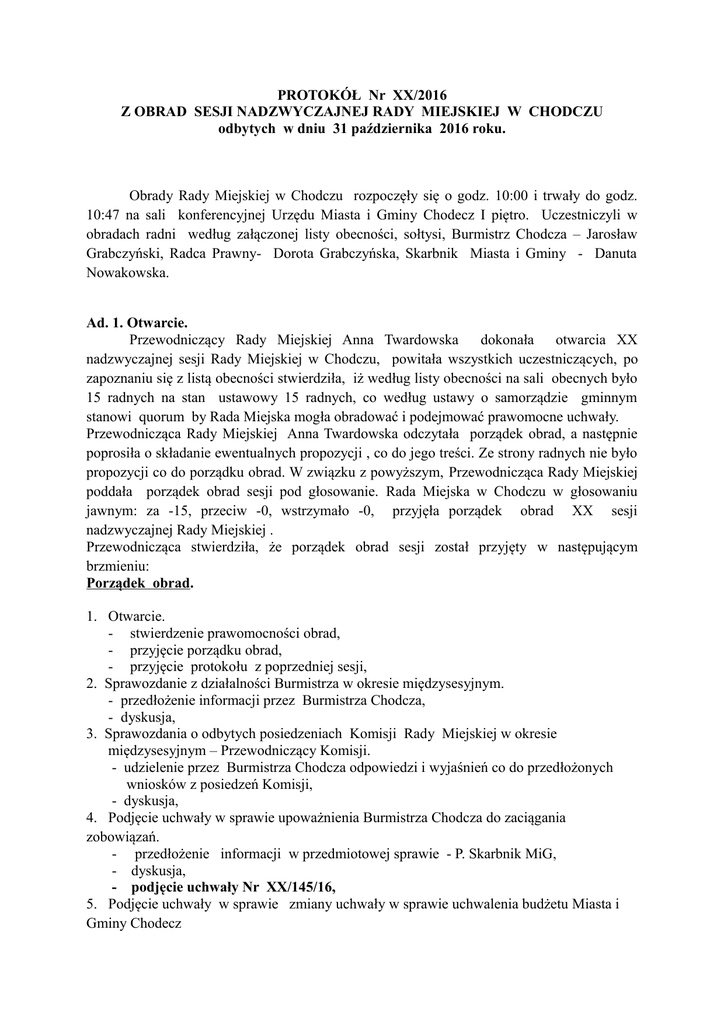 PROTOKÓŁ Nr XX/2016 Z OBRAD SESJI NADZWYCZAJNEJ RADY MIEJSKIEJ W CHODCZU odbytych w dniu 31 października 2016 roku. Obrady Rady Miejskiej w Chodczu rozpoczęły się o godz. 10:00 i trwały do godz. 10:47 na sali konferencyjnej Urzędu Miasta i Gminy Chodecz I piętro. Uczestniczyli w obradach radni według załączonej listy obecności, sołtysi, Burmistrz Chodcza – Jarosław Grabczyński, Radca Prawny- Dorota Grabczyńska, Skarbnik Miasta i Gminy - Danuta Nowakowska. Ad. 1. Otwarcie. Przewodniczący Rady Miejskiej Anna Twardowska dokonała otwarcia XX nadzwyczajnej sesji Rady Miejskiej w Chodczu, powitała wszystkich uczestniczących, po zapoznaniu się z listą obecności stwierdziła, iż według listy obecności na sali obecnych było 15 radnych na stan ustawowy 15 radnych, co według ustawy o samorządzie gminnym stanowi quorum by Rada Miejska mogła obradować i podejmować prawomocne uchwały. Przewodnicząca Rady Miejskiej Anna Twardowska odczytała porządek obrad, a następnie poprosiła o składanie ewentualnych propozycji , co do jego treści. Ze strony radnych nie było propozycji co do porządku obrad. W związku z powyższym, Przewodnicząca Rady Miejskiej poddała porządek obrad sesji pod głosowanie. Rada Miejska w Chodczu w głosowaniu jawnym: za -15, przeciw -0, wstrzymało -0, przyjęła porządek obrad XX sesji nadzwyczajnej Rady Miejskiej . Przewodnicząca stwierdziła, że porządek obrad sesji został przyjęty w następującym brzmieniu: Porządek obrad. 1. Otwarcie. - stwierdzenie prawomocności obrad, - przyjęcie porządku obrad, - przyjęcie protokołu z poprzedniej sesji, 2. Sprawozdanie z działalności Burmistrza w okresie międzysesyjnym. - przedłożenie informacji przez Burmistrza Chodcza, - dyskusja, 3. Sprawozdania o odbytych posiedzeniach Komisji Rady Miejskiej w okresie międzysesyjnym – Przewodniczący Komisji. - udzielenie przez Burmistrza Chodcza odpowiedzi i wyjaśnień co do przedłożonych wniosków z posiedzeń Komisji, - dyskusja, 4. Podjęcie uchwały w sprawie upoważnienia Burmistrza Chodcza do zaciągania zobowiązań. - przedłożenie informacji w przedmiotowej sprawie - P. Skarbnik MiG, - dyskusja, - podjęcie uchwały Nr XX/145/16, 5. Podjęcie uchwały w sprawie zmiany uchwały w sprawie uchwalenia budżetu Miasta i Gminy Chodecz - przedłożenie informacji w przedmiotowej sprawie - P. Skarbnik MiG, - opinia Komisji Budżetu i Finansów – P. Grzegorz Makowiecki - dyskusja, - podjęcie uchwały Nr XX/146/16, 6. Podjęcie uchwały w sprawie zmiany uchwały w sprawie Wieloletniej Prognozy Finansowej Miasta i Gminy Chodecz na lata 2016-2031 - przedłożenie informacji w przedmiotowej sprawie - P. Skarbnik MiG - opinia Komisji Budżetu i Finansów – P. Grzegorz Makowiecki, - dyskusja, - podjęcie uchwały Nr XX/147/2016 7. Podjęcie uchwały w sprawie uchylenia uchwały w sprawie przystąpienia do opracowania Lokalnego Programu Rewitalizacji Miasta i Gminy Chodecz na lata 2016-2022 - przedłożenie informacji w przedmiotowej sprawie - P. Drzewiecki - opinia Komisji Obywatelskiej i Ochrony Środowiska - dyskusja, - podjęcie uchwały Nr XX/148/2016 8. Podjęcie uchwały w sprawie przystąpienia do opracowania Lokalnego Programu Rewitalizacji dla Miasta i Gminy Chodecz. - przedłożenie informacji w przedmiotowej sprawie - P. Drzewiecki - opinia Komisji Obywatelskiej i Ochrony Środowiska - dyskusja, - podjęcie uchwały Nr XX/149/2016 9. Podjęcie uchwały w sprawie wyrażenia zgody na nabycie nieruchomości - przedłożenie informacji w przedmiotowej sprawie - P. J. Bontal - opinia Komisji Budżetu i Finansów, - dyskusja, - podjęcie uchwały Nr XX/150/2016 10. Podjęcie uchwały w sprawie uchylenia uchwały Nr XIX/137/16 Rady Miejskiej w Chodczu z dnia 11 października 2016r. w sprawie zaciągnięcia kredytu długoterminowego - przedłożenie informacji w przedmiotowej sprawie - P. Skarbnik MiG - opinia Komisji Budżetu i Finansów – P. Grzegorz Makowiecki, - dyskusja, - podjęcie uchwały Nr XX/151/2016 11. Interpelacje i zapytania radnych . 12. Sprawy bieżące i wolne wnioski . 13. Zakończenie obrad sesji. Przewodnicząca Rady Miejskiej poprosiła o przyjęcie protokołu z poprzednich obrad w głosowaniu jawnym, za przyjęciem głosowało 15 radnych, przeciw -0, wstrzymało -0. Przewodnicząca stwierdziła, że protokół z obrad XIX sesji nadzwyczajnej został przyjęty. Ad. 2. Sprawozdanie z działalności Burmistrza w okresie międzysesyjnym. Burmistrz Chodcza Pan Jarosław Grabczyński przedłożył informacje, iż w okresie międzysesyjnym głównym zadaniem jakim się zajmował były spotkania z instytucjami finansowymi odnośnie sfinansowania deficytu na rok 2016 i między innymi dzisiejsza sesja jest temu poświęcona. Kolejna sprawa to zakup nieruchomości przez Urząd Miasta i Gminy w Chodczu, w ostatnim czasie w okresie międzysesyjnym trwały negocjacje co do zakupu, ceny oraz warunków umowy . - spotkanie w Urzędzie Marszałkowskim w biurze PROW-u z Panią Dyrektor Elżbietą Siemiątkowską dotyczyło pozyskiwania środków w kolejnych konkursach sprawa się toczy o stację uzdatniania wody i targowisko jeżeli chodzi o PROW. Trwają uzgodnienia co do targowiska, nie ma zmiany co do miejsca targowiska będzie w tym samym miejscu. Należy teraz dostosować projekt na potrzeby konkursu żeby uzyskać jak największą ilość punktów aby dostać dofinansowanie żebyśmy nie zostali odrzuceni wartość dofinansowania to 1 000 000 (słownie: milion złotych). Odnośnie stacji uzdatniania wody są już przygotowania w pełni. -odbyło się również spotkanie 27.10.2016 r. w Kuratorium Oświaty w Bydgoszczy odnośnie skarg skierowanych do Burmistrza jako organu prowadzącego na działalność Dyrektora Szkoły w Chodczu. Kolejne spotkanie w tej sprawie przewidziane jest na czwartek 03.11.2016r. Komisja Oświatowa powołana jest między innymi w tym celu na środę 02.11.2016r. na godzinę 14:00 więc sprawa 