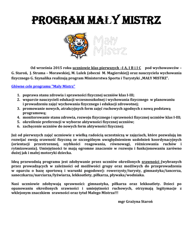 program maŁY MISTRZ Od września 2015 roku uczniowie klas pierwszych –I A, I B i I C pod wychowawców – G. Staroń, J. Strama – Morawskiej, M. Lulek (obecni M. Magierskiej) oraz nauczyciela wychowania fizycznego G. Szynalika realizują program Ministerstwa Sportu i Turystyki „MAŁY MISTRZ”. Główne cele programu "Mały Mistrz" 1. poprawa stanu zdrowia i sprawności fizycznej uczniów klas I-III; 2. wsparcie nauczycieli edukacji wczesnoszkolnej i wychowania fizycznego w planowaniu i prowadzeniu zajęć wychowania fizycznego i edukacji zdrowotnej; 3. promowanie nowych, atrakcyjnych form zajęć ruchowych zgodnych z nową podstawą programową; 4. monitorowanie stanu zdrowia, rozwoju fizycznego i sprawności fizycznej uczniów klas I-III; 5. określenie preferencji w wyborze aktywności fizycznej uczniów; 6. zachęcenie uczniów do nowych form aktywności fizycznej; Już od pierwszych zajęć uczniowie z wielką radością uczestniczą w zajęciach, które pozwalają im rozwijać swoją srawność fizyczną ze szczególnym uwzględnieniem uzdolnień koordynacyjnych (orientacji przestrzennej, szybkości reagowania, równowagi, różnicowania ruchów i rytmizowania). Umiejętności te mają ogromne znaczenie w rozwoju i funkcjonowaniu zarówno dużej jak i małej motoryki dziecka. Ideą przewodnią programu jest zdobywanie przez uczniów określonych srawności (wybranych przez prowadzących w zależności od możliwości grupy oraz możliwych do przeprowadzenia w oparciu o bazę sportową i warunki pogodowe): rowerzysty/turysty, gimnastyka/tancerza, saneczkarza/narciarza/łyżwiarza, lekkoatlety, piłkarza, pływaka/wodniaka. Nasi uczniowie zdobywają sprawności: gimnastyka, piłkarza oraz lekkoatlety. Dzieci po opanowaniu określonych srawności i umiejętności ruchowych, otrzymają legitymacje z wklejonym znaczkiem srawności oraz tytuł Małego Mistrza!!! mgr Grażyna Staroń PIŁKARZ LEKKOATLETA GIMNASTYK