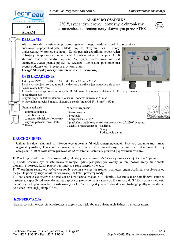 http://www.techneau.com.pl e-mail : [email protected] ALARM DO OSADNIKA AB 230 V, sygnał dźwiękowy i optyczny, elektroniczny, z samozabezpieczeniem certyfikowanym przez ATEX ALARM DZIAŁANIE Alarm pozwala na ustalenie poziomu zgromadzonego osadu w osadniku separatora substancji ropopochodnych. Składa się ze skrzynki PVC i sondy umieszczonej w komorze separacji. Sonda posiada czujnik na podczerwień pulsującą. WyposaŜona jest w nadajnik podczerwieni, i receptor. JeŜeli stęŜenie osadu w wodzie wynosi 0%, sygnał podczeriwni nie jest zaburzony. JeŜeli jednak pojawi się większa ilość osadu, pochłonie ona sygnał podczerwieni, i receptor uruchomi alarm. Uwaga! Skrzynkę naleŜy umieścić w strefie bezpiecznej. OPIS URZĄDZENIA 1 skrzynka PVC EEx ia IIC IP 67 180 x 130 x 60 mm - 230 V. 1 uchwyt mocujący sondę, ze stali nierdzewnej, moŜliwe jest zamocowanie sondy na nadstawce betonowej. 1 sonda substancji ropopochodnych Ø 24 mm + czujnik zbliŜenia + 10 m przewodu zabezpieczonego. ZuŜycie prądu: w trakcie alarmu: 2 W maxi – podczas czuwania: 20 mW. Maksymalna odległość między skrzynką a sondą (przewód 2*1.5 mm²) = 50 m. Front urządzenia Wnętrze urządzenia 1 kontrolka zasilania 1 kontrolka alarmu 1 komutator dźwiękowy/ optyczny 1 przycisk potwierdzenia i testu 2 dławiki 1 transformator 1 brzęczyk 1 bezpiecznik 250 mA 1 przekaźnik wyjściowy o wolnym potencjale - 5A 230V dopuszcz. 3 zaciski przezanczone do: Zasilania Sondy Podłączenie dalsze URUCHOMIENIE Unikać instalacji skrzynki w miejscu występowania fal elektromagnetycznych. Przewód czujnika musi mieć oryginalną izolację. Przestrzeń w promieniu 30 cm musi być wolna od innych przewodów i fal radiowych. Przy odległości > 50 m zastosować przewód 2*1,5 w osłonie - osłonięty przewód poprowadzić w ziemi. 1) PrzełoŜyć sonde przez plastikową rurkę, tak aby przezroczysta końcówka wystawała z niej. Zacisnąć opaskę. 2) Sonda powinna być zainstalowana w miejscu gdzie jest przepływ wodny, w ten sposów aŜeby nie obrosła glonami. Przekręcić kanał przepływu sondy w stronę przepływu wody. 3) W osadniku separatora końcówka sondy powinna wisieć na środku, pomiędzy dnem osadnika a odpływem od niego. Do pomocy, uŜyć opaski umocowanej na kablu powyŜej sondy. 4) Podłączenie elektryczne: do zacisku nr.1 podłączyć zasilanie. +, ziemia,-. Do zacisku nr.2 podłączyć sondę w następujący sposób: od lewej do prawej : splot i brązowy do masy / szary do K / zielony do S / Ŝółty do A / niebieski na SV. Łącznik powinien być zainstalowany na J1. Zacisk 3 jest przewidziany do ewentualnego podłączenia alarmu do dalszej instalacji, jak np. GSM. KONSERWACJA : Raz na pół roku wyczyścić przeŜroczyste części sondy tak aby nie było na nich Ŝadnych zanieczyszczeń. Techneau Polska Sp. z o.o.,Jedlicze A, ul.Długa 61 Tél. : 42 717 93 93 - Fax : 42 717 93 94 AL - 001G Edycja 06/08. Wszystkie prawa zastrzeŜone. http://www.techneau.com.pl e-mail : [email protected] ALARM DO OSADNIKA AB 230 V, sygnał dźwiękowy i optyczny, elektroniczny, z samozabezpieczeniem certyfikowanym przez ATEX ALARM Techneau Polska Sp. z o.o.,Jedlicze A, ul.Długa 61 Tél. : 42 717 93 93 - Fax : 42 717 93 94 AL - 001G Edycja 06/08. Wszystkie prawa zastrzeŜone.