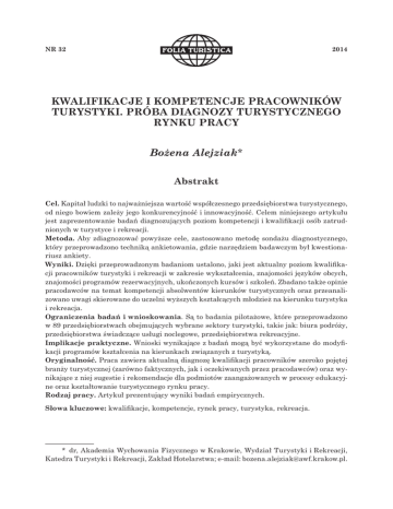 NR 32 2014 Kwalifikacje i kompetencje pracowników turystyki. Próba diagnozy turystycznego rynku pracy Bożena Alejziak* Abstrakt Cel. Kapitał ludzki to najważniejsza wartość współczesnego przedsiębiorstwa turystycznego, od niego bowiem zależy jego konkurencyjność i innowacyjność. Celem niniejszego artykułu jest zaprezentowanie badań diagnozujących poziom kompetencji i kwalifikacji osób zatrudnionych w turystyce i rekreacji. Metoda. Aby zdiagnozować powyższe cele, zastosowano metodę sondażu diagnostycznego, który przeprowadzono techniką ankietowania, gdzie narzędziem badawczym był kwestionariusz ankiety. Wyniki. Dzięki przeprowadzonym badaniom ustalono, jaki jest aktualny poziom kwalifikacji pracowników turystyki i rekreacji w zakresie wykształcenia, znajomości języków obcych, znajomości programów rezerwacyjnych, ukończonych kursów i szkoleń. Zbadano także opinie pracodawców na temat kompetencji absolwentów kierunków turystycznych oraz przeanalizowano uwagi skierowane do uczelni wyższych kształcących młodzież na kierunku turystyka i rekreacja. Ograniczenia badań i wnioskowania. Są to badania pilotażowe, które przeprowadzono w 89 przedsiębiorstwach obejmujących wybrane sektory turystyki, takie jak: biura podróży, przedsiębiorstwa świadczące usługi noclegowe, przedsiębiorstwa rekreacyjne. Implikacje praktyczne. Wnioski wynikające z badań mogą być wykorzystane do modyfikacji programów kształcenia na kierunkach związanych z turystyką. Oryginalność. Praca zawiera aktualną diagnozę kwalifikacji pracowników szeroko pojętej branży turystycznej (zarówno faktycznych, jak i oczekiwanych przez pracodawców) oraz wynikające z niej sugestie i rekomendacje dla podmiotów zaangażowanych w procesy edukacyjne oraz kształtowanie turystycznego rynku pracy. Rodzaj pracy. Artykuł prezentujący wyniki badań empirycznych. Słowa kluczowe: kwalifikacje, kompetencje, rynek pracy, turystyka, rekreacja. * dr, Akademia Wychowania Fizycznego w Krakowie, Wydział Turystyki i Rekreacji, Katedra Turystyki i Rekreacji, Zakład Hotelarstwa; e-mail: [email protected]. 118 Bożena Alejziak Wprowadzenie Konkurencyjność przedsiębiorstw oraz tempo rozwoju gospodarczego związane są z jakością kapitału ludzkiego: wiedzą, postawami i umie jętnościami ludzi. W XXI wieku, w cywilizacji wiedzy, to powiązanie staje się coraz bardziej aktualne, dlatego kształcenie kadr dla potrzeb turystyki jest jednym z warunków dostosowania polskich usług turystycznych do standardów UE. Zdefiniowano to jako cel strategiczny drugiego obszaru priorytetowego w dokumecie Kierunki rozwoju turystyki do 2015 roku [MSiT 2008], pisząc, że „kwalifikacje i umiejętności zawodowe są kluczową determinantą osiągania wysokiej jakości usług turystycznych i wdrażania wysokiej jakości produktów turystycznych” [MSiT 2008, s. 73]. W tej sytuacji ważna jest realizacja koncepcji uczenia się przez całe życie i mobilności, poprawa jakości i skuteczności kształcenia i szkolenia, promowanie równości, spójności społecznej i aktywności obywatelskiej, zwiększenie kreatywności i innowacyjności, w tym przedsiębiorczości, na wszystkich poziomach kształcenia i szkolenia [Zarzycki, Borne-Januła i in. 2010, s. 8; Stachowiak 2009, s. 111]. W kontekście rozwoju turystyki należy wziąć pod uwagę dwie grupy zasobów ludzkich, które można określić mianem kreatora oferty turystycznej lub odbiorcy oferty turystycznej. W przypadku pierwszej grupy chodzi o kształtowanie kompetencji pozwalających na tworzenie innowacyjnych i konkurencyjnych produktów turystycznych oraz właściwą obsługę klientów. Kreatorzy oferty turystycznej muszą posiadać – oparte na przedsiębiorczości i elastyczności działania – zdolności do sprostania wymaganiom rynku. W przypadku drugiej grupy ważne jest z kolei kształtowanie odpowiednich postaw i nawyków związanych ze spędzaniem wolnego czasu, tworzeniem popytu na wartościową ofertę turystyczną, sprzyjającą regeneracji fizycznej i psychicznej, rozwijającą horyzonty myślowe. Niezbędnym elementem osiągnięcia tych celów jest [MSiT 2008, s. 73]: • wsparcie kadr społecznych, które przyczyniają się do kształtowania odpowiednich postaw konsumentów, rozwijają zainteresowanie wartościami krajoznawczymi, kulturowymi i przyrodniczymi, co ma szczególne znaczenie w przypadku turystyki i wypoczynku dzieci i młodzieży, spełniając także ważną funkcję w zapobieganiu patologiom społecznym, kształtowanie świadomości przyszłych i obecnych kadr w obszarze eko• logii, co dotyczy zarówno osób kreujących podaż, jak i popyt na usługi turystyczne, zgodnie z regułami zrównoważonego rozwoju, • przygotowanie i skoordynowanie kadr do obsługi wielkich wydarzeń kulturalnych i sportowych. Zgodnie z Kierunkami rozwoju turystyki do 2015 roku [MSiT 2008, s. 75] przygotowanie profesjonalnych kadr turystyki i ich doskonalenie powinno Kwalifikacje i kompetencje pracownikówturystyki... 119 koncentrować się m.in. na wdrażaniu umiejętności praktycznych oraz systemie szkoleń dla pracowników sektora turystycznego, sektora usług okołoturystycznych, opracowania i wdrożenia systemu staży zawodowych. Kierunki… [MSiT 2008, s. 82] zakładają stworzenie systemu monitorowania zmian w zakresie potrzeb kadrowych w obrębie turystyki, w szczególności: diagnozowanie potrzeb zgłaszanych przez pracodawców, kreowanie prognoz zapotrzebowania na kwalifikacje uwzględniających trendy krajowe i międzynarodowe. Analizując literaturę naukową dotyczącą turystycznego rynku pracy na przestrzeni dwóch dekad, można zauważyć, że nie jest ona zbyt obszerna. Jedną z pierwszych publikacji na ten temat (obecnie o znaczeniu już historycznym), była praca zbiorowa Kadry w turystyce [1990] – będąca efektem Centralnego Programu Badań Podstawowych: CPBP 0806, którego kierownikiem był K. Przecławsk