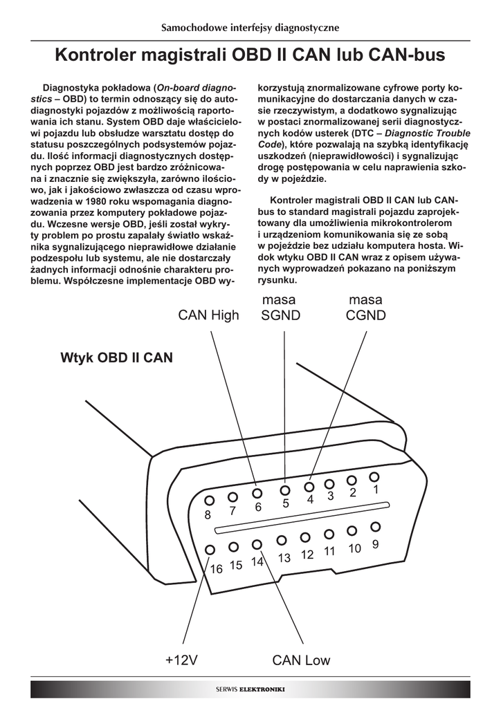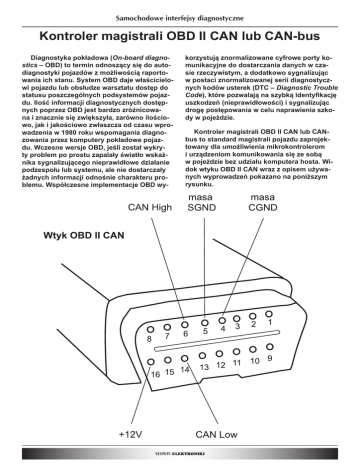 Samochodowe interfejsy diagnostyczne Kontroler magistrali OBD II CAN lub CAN-bus Diagnostyka pokładowa (On-board diagnostics – OBD) to termin odnoszący się do autodiagnostyki pojazdów z możliwością raportowania ich stanu. System OBD daje właścicielowi pojazdu lub obsłudze warsztatu dostęp do statusu poszczególnych podsystemów pojazdu. Ilość informacji diagnostycznych dostępnych poprzez OBD jest bardzo zróżnicowana i znacznie się zwiększyła, zarówno ilościowo, jak i jakościowo zwłaszcza od czasu wprowadzenia w 1980 roku wspomagania diagnozowania przez komputery pokładowe pojazdu. Wczesne wersje OBD, jeśli został wykryty problem po prostu zapalały światło wskaźnika sygnalizującego nieprawidłowe działanie podzespołu lub systemu, ale nie dostarczały żadnych informacji odnośnie charakteru problemu. Współczesne implementacje OBD wy- korzystują znormalizowane cyfrowe porty komunikacyjne do dostarczania danych w czasie rzeczywistym, a dodatkowo sygnalizując w postaci znormalizowanej serii diagnostycznych kodów usterek (DTC – Diagnostic Trouble Code), które pozwalają na szybką identyfikację uszkodzeń (nieprawidłowości) i sygnalizując drogę postępowania w celu naprawienia szkody w pojeździe. Kontroler magistrali OBD II CAN lub CANbus to standard magistrali pojazdu zaprojektowany dla umożliwienia mikrokontrolerom i urządzeniom komunikowania się ze sobą w pojeździe bez udziału komputera hosta. Widok wtyku OBD II CAN wraz z opisem używanych wyprowadzeń pokazano na poniższym rysunku. SERWIS ELEKTRONIKI