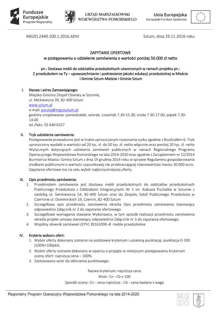 MGZO.2440.100.1.2016.ADIV Sztum, dnia 29.11.2016 roku ZAPYTANIE OFERTOWE w postępowaniu o udzielenie zamówienia o wartości poniżej 50.000 zł netto pn.: Dostawa mebli do oddziałów przedszkolnych utworzonych w ramach projektu pn.: Z przedszkolem na Ty – upowszechnianie i podniesienie jakości edukacji przedszkolnej w Mieście i Gminie Sztum Mieście i Gminie Sztum I. Nazwa i adres Zamawiającego: Miejsko-Gminny Zespół Oświaty w Sztumie, ul. Mickiewicza 39, 82-400 Sztum www.sztum.pl e-mail: [email protected] godziny urzędowania: poniedziałek, wtorek, czwartek 7.30-15.30, środa 7.30-17.00, piątek 7.3014.00 tel./faks: 55 640 6327 II. Tryb udzielenia zamówienia: Postępowanie prowadzone jest w trybie uproszczonym rozeznania rynku zgodnie z Rozdziałem 6. Tryb uproszczony wydatki o wartości od 20 tys. zł. do 50 tys. zł. netto włącznie oraz poniżej 20 tys. zł. netto Wytycznych dotyczących udzielania zamówień publicznych w ramach Regionalnego Programu Operacyjnego Województwa Pomorskiego na lata 2014-2020 oraz zgodnie z Zarządzeniem nr 12/2014 Burmistrza Miasta i Gminy Sztum z dnia 19 grudnia 2014 roku w sprawie Regulaminu gospodarowania środkami publicznymi o wartości szacunkowej nie przekraczającej równowartości kwoty 30 000 euro. Zapytanie ofertowe ma na celu wybór najkorzystniejszej oferty. III. Opis przedmiotu zamówienia: 1. Przedmiotem zamówienia jest dostawa mebli przedszkolnych do oddziałów przedszkolnych Publicznego Przedszkola z Oddziałami Integracyjnymi Nr 1 im. Kubusia Puchatka w Sztumie z siedzibą ul. Sienkiewicza 54, 82-400 Sztum oraz do Zespołu Szkół Publicznego Przedszkola w Czerninie ul. Donimirskich 19, Czernin, 82-400 Sztum 2. Szczegółowy opis przedmiotu zamówienia określa Opis przedmiotu zamówienia stanowiący odpowiednio Załącznik nr 2 do zapytania ofertowego. 3. Szczegółowe wymagania stawiane Wykonawcy, w tym sposób realizacji przedmiotu zamówienia określa projekt umowy stanowiący odpowiednio Załącznik nr 3 do zapytania ofertowego. 4. Wspólny słownik zamówień (CPV) 39161000–8 meble przedszkolne IV. Kryteria wyboru ofert: 1. Wybór oferty dokonany zostanie na podstawie kryterium i ustaloną punktację: punktacja 0-100 (100%=100pkt). 2. Wybór oferty zostanie dokonany w oparciu o przyjęte w niniejszym postępowaniu kryterium oceny ofert: najniższa cena – 100%. 3. Zastosowany wzór do obliczenia punktowego: Nazwa kryterium: najniższa cena Wzór: Cn : Cb x 100 Sposób oceny: Cn - cena najniższa : Cb - cena badana x waga 4. Wynik - oferta, która otrzyma maksymalną liczbę punktów w oparciu o ustalone kryterium zostanie uznana za najkorzystniejszą, pozostałe oferty zostaną sklasyfikowane zgodnie z ilością uzyskanych punktów. 5. Realizacja zamówienia zostanie powierzona Wykonawcy, którego oferta uzyska najwyższą ilość punktów. V. Opis sposobu obliczenia ceny: 1. Wykonawca uwzględniając wszystkie wymogi, o których mowa w niniejszym zapytaniu ofertowym, powinien w cenie brutto ująć wszelkie koszty niezbędne dla prawidłowego i pełnego wykonania przedmiotu zamówienia. 2. Cena oferty brutto winna być podana w złotych polskich liczbowo i słownie. 3. Każdy z wykonawców może zaproponować tylko jedną cenę. VI. Termin realizacji zamówienia: 14 dni od dnia podpisania umowy VII. Opis sposobu przygotowania oferty: 1. Ofertę należy sporządzić w języku polskim, w formie pisemnej i dostarczyć na adres: MiejskoGminnego Zespołu Oświaty w Sztumie, ul. Mickiewicza 39 82-400 Sztum (sekretariat pok. 46) lub przesłać za pośrednictwem poczty elektronicznej na adres:[email protected] do 05.12.2016r do godz. 11.00. 2. Ofertę należy sporządzić na formularzu ofertowym, zgodnym z załącznikiem nr 1 do niniejszego zapytania ofertowego. 3. Oferty złożone po terminie, oferty niekompletne lub niespełniające stawianych wymagań nie będą rozpatrywane. 4. Wykonawca może przed upływem terminu składania ofert zmienić lub wycofać swoją ofertę. VIII. Informacje o formalnościach: 1. Niezwłocznie po wyborze najkorzystniejszej oferty, zamawiający zawiadomi Wykonawców, którzy ubiegali się ̨ o udzielenie zamówienia, o wynikach postepowania, poprzez umieszczenie informacji na stronie internetowej Zamawiającego bip.sztum.pl. 2. Zamawiający zawrze umowę z wybranym Wykonawcą w miejscu i terminie określonym przez Zamawiającego. 3. Umowa w sprawie realizacji niniejszego zamówienia zawarta zostanie z uwzględnieniem postanowień wynikających z treści niniejszego zapytania oraz danych zawartych w ofercie. 4. Zamawiający zastrzega sobie prawo odstąpienia bądź wycofania niniejszego zapytania ofertowego bez podania przyczyn. IX. Załączniki: 1. Formularz ofertowy Wykonawcy. 2. Opis przedmiotu zamówienia. 3. Projekt umowy. Zatwierdzam: Katarzyna Krzyżykowska Dyrektor Miejsko-Gminnego Zespołu Oświaty w Sztumie