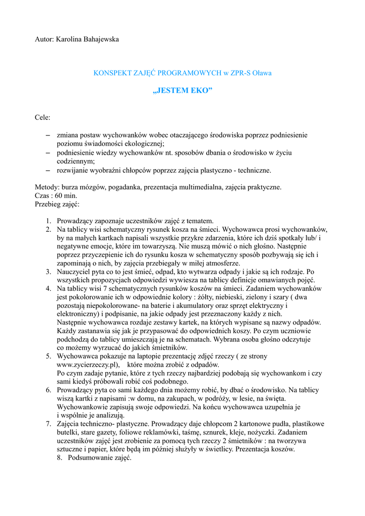 Autor: Karolina Bahajewska KONSPEKT ZAJĘĆ PROGRAMOWYCH w ZPR-S Oława „JESTEM EKO” Cele: – zmiana postaw wychowanków wobec otaczającego środowiska poprzez podniesienie poziomu świadomości ekologicznej; – podniesienie wiedzy wychowanków nt. sposobów dbania o środowisko w życiu codziennym; – rozwijanie wyobraźni chłopców poprzez zajęcia plastyczno - techniczne. Metody: burza mózgów, pogadanka, prezentacja multimedialna, zajęcia praktyczne. Czas : 60 min. Przebieg zajęć: 1. Prowadzący zapoznaje uczestników zajęć z tematem. 2. Na tablicy wisi schematyczny rysunek kosza na śmieci. Wychowawca prosi wychowanków, by na małych kartkach napisali wszystkie przykre zdarzenia, które ich dziś spotkały lub/ i negatywne emocje, które im towarzyszą. Nie muszą mówić o nich głośno. Następnie poprzez przyczepienie ich do rysunku kosza w schematyczny sposób pozbywają się ich i zapominają o nich, by zajęcia przebiegały w miłej atmosferze. 3. Nauczyciel pyta co to jest śmieć, odpad, kto wytwarza odpady i jakie są ich rodzaje. Po wszystkich propozycjach odpowiedzi wywiesza na tablicy definicje omawianych pojęć. 4. Na tablicy wisi 7 schematycznych rysunków koszów na śmieci. Zadaniem wychowanków jest pokolorowanie ich w odpowiednie kolory : żółty, niebieski, zielony i szary ( dwa pozostają niepokolorowane- na baterie i akumulatory oraz sprzęt elektryczny i elektroniczny) i podpisanie, na jakie odpady jest przeznaczony każdy z nich. Następnie wychowawca rozdaje zestawy kartek, na których wypisane są nazwy odpadów. Każdy zastanawia się jak je przypasować do odpowiednich koszy. Po czym uczniowie podchodzą do tablicy umieszczają je na schematach. Wybrana osoba głośno odczytuje co możemy wyrzucać do jakich śmietników. 5. Wychowawca pokazuje na laptopie prezentację zdjęć rzeczy ( ze strony www.zycierzeczy.pl), które można zrobić z odpadów. Po czym zadaje pytanie, które z tych rzeczy najbardziej podobają się wychowankom i czy sami kiedyś próbowali robić coś podobnego. 6. Prowadzący pyta co sami każdego dnia możemy robić, by dbać o środowisko. Na tablicy wiszą kartki z napisami :w domu, na zakupach, w podróży, w lesie, na święta. Wychowankowie zapisują swoje odpowiedzi. Na końcu wychowawca uzupełnia je i wspólnie je analizują. 7. Zajęcia techniczno- plastyczne. Prowadzący daje chłopcom 2 kartonowe pudła, plastikowe butelki, stare gazety, foliowe reklamówki, taśmę, sznurek, kleje, nożyczki. Zadaniem uczestników zajęć jest zrobienie za pomocą tych rzeczy 2 śmietników : na tworzywa sztuczne i papier, które będą im później służyły w świetlicy. Prezentacja koszów. 8. Podsumowanie zajęć. Źródło : www.edupics.com ODPADY - nieprzydatne przedmioty i substancje stałe związane z działalnością gospodarczą lub bytowaniem człowieka, które są uciążliwe dla środowiska. PODZIAŁ ODPADÓW KOMUNALNYCH: 1. ODPADY KOMUNALE MIESZANE trafiające do zwykłego śmietnika- obierki z kuchni, pampersy, zatłuszczone papiery, ręczniki papierowe, potłuczona zastawa stołowa, stare zabawki ( nie elektryczne ) itp. 2. SUROWCE WTÓRNE: papier i tektura, tworzywa sztuczne, szkło bezbarwne i kolorowe ( zbierane osobno: z kolorowego szkła nie da się usunąć barwnika, ale tylko szkło opakowaniowe- absolutnie nie szkło okienne, zastawa stołowa itp.), odpady metalowe i aluminiowe oraz opakowania wielomateriałowe czyli kartony po sokach, mleku. 3. ODPADY WIELKOGABARYTOWE- szafy, wersalki, fotele, dywany. 4. ZUŻYTY SPRZĘT ELEKTRYCZNY I ELEKTRONICZNY np. tv, pralka, lodówka, telefon komórkowy, komputer itp. 5. ODPADY NIEBEZPIECZNE- baterie, świetlówki, lekarstwa przeterminowane, opakowania po chemikaliach, farbach, lakierach, termometry rtęciowe. 6. ODPADY ZIELONE – trawa, liście. 7. INNE : gruz poremontowy, opony, szyby okienne idp. GAZETY, KSIĄŻKI W MIĘKKICH OKŁADKACH ŚCINKI DRUKARSKIE KATALOGI, PROSPEKTY TEKTURA OPAKOWANIA LAKIEROWANY Z JAKĄKOLWIEK LUB FOLIOWANY ZAWARTOŚCIĄ PAPIER Z FOLDERÓW REKLAMOWYCH WORKI PAPIEROWE TAPETY KALKA PAPIER TERMICZNY ZATŁUSZCZONY I BRUDNY PAPIER ARTYKUŁY HIGIENICZNE OPAKOWANIA WIELOMATERIA ŁOWE BUTELKI SZKLANE SŁOIKI SZKLANE OPAKOWANIA PO KOSMETYKACH CERAMIKA SZKŁO OKULAROWE PLASTIKOWE BUTELKI PO SOKACH I NAPOJACH, KUBKI BUTELKI PO OLEJACH SPOŻYWCZYCH SZKŁO PŁASKIE ŻARÓWKI, ŚWIETLÓWKI, KINESKOPY SZKLANKI, KIELISZKI, SZKŁO KRYSZTAŁOWE, NACZYNIA ŻAROODPORNE SZKLANE OPAKOWANIA FARMACEUTYCZ NE I CHEMICZNE Z JAKĄKOLWIEK ZAWARTOŚCIĄ OPAKOWANIA PO WORKI I TOREBK ŚRODKACH DO FOLIE PRANIA, OPAKOWANIOWE PLASTIKOWE SZAMPONACH Z TWORZYW ITP. PUSZKI I POJEMNIKI PO FARBACH I LAKIERACH ZUŻYTE BATERIE OPAKOWANIA PO I AKUMULATORY KREMACH, BALSAMACH ITP. OPAKOWANIA I BUTELKI PO OLEJACH SILNIKOWYCH PUSZKI PO NAPOJACH PUSZKI PO KONSERWACH DROBNY ZŁOM ŻELAZNY I METALI KOLOROWYCH KAPSLE OPAKOWANIA PO AREOZOLACH SZKŁO: co zbieramy - czego nie UWAGA! BARDZO WAŻNE: szkło bezbarwne – wrzucamy do pojemnika białego, szkło kolorowe – do pojemnika zielonego wrzucamy szkło opakowaniowe: butelki szklane, słoiki, szklane opakowania po kosmetykach. nie można wrzucać: szkła płaskiego (szyby okienne i samochodowe, szkła zbrojonego, luster – mają inną temperaturę topnienia od szkła opakowaniowego i nie stopią się razem z butelkami i słoikami), szklanek, kieliszków, szkła kryształowego, naczyń żaroodpornych, ceramiki (fajans, porcelana, naczynia typu arco, doniczki, miski, talerze), szkła okularowego, żarówek, świetlówek, kineskopów, szklanych opakowań farmaceutycznych i chemicznych z jakąkolwiek pozostałością zawartości. Dokładne mycie szkła z resztek żywności nie jest konieczne, to samo dotyczy etykiet czy resztek zamknięć.Instalacje do czyszczenia stłuczki w hutach szkła poradzą sobie z „wyłapaniem” takich zanieczyszczeń. PAPIER: co zbieramy - czego nie Papier – pojemnik niebieski wrzucamy: gazety, ks