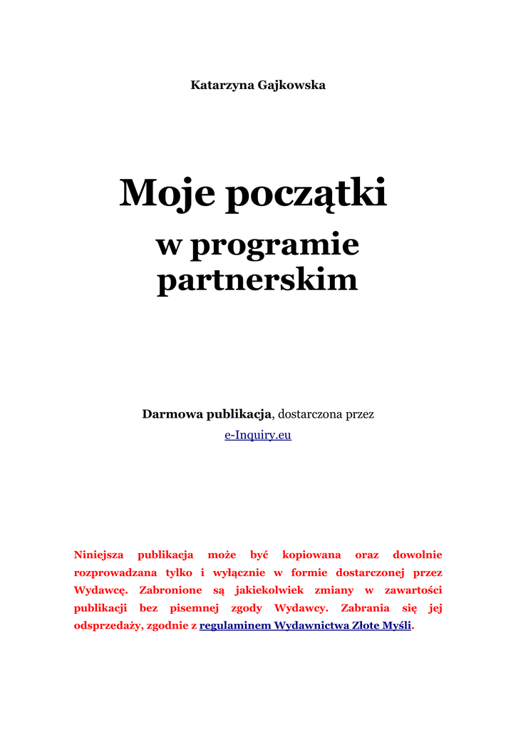 Katarzyna Gajkowska Moje początki w programie partnerskim Darmowa publikacja, dostarczona przez e-Inquiry.eu Niniejsza publikacja może być kopiowana oraz dowolnie rozprowadzana tylko i wyłącznie w formie dostarczonej przez Wydawcę. Zabronione publikacji bez są pisemnej jakiekolwiek zgody zmiany Wydawcy. w zawartości Zabrania się odsprzedaży, zgodnie z regulaminem Wydawnictwa Złote Myśli. jej © Copyright for Polish edition by Katarzyna Gajkowska & ZloteMysli.pl Data: 20.05.2007 Tytuł: Moje początki w programie partnerskim Autor: Katarzyna Gajkowska Wydanie II (uzupełnione) Korekta: Sylwia Fortuna Skład: Anna Popis-Witkowska Niniejsza publikacja może być kopiowana oraz dowolnie rozprowadzana tylko i wyłącznie w formie dostarczonej przez Wydawcę. Zabronione publikacji bez są pisemnej jakiekolwiek zgody zmiany Wydawcy. w zawartości Zabrania się odsprzedaży, zgodnie z regulaminem Wydawnictwa Złote Myśli. Dystrybucja w Internecie, za zgodą Autora Internetowe Wydawnictwo Złote Myśli Nwtina Sp. z o. o. ul. Daszyńskiego 5 44-100 Gliwice WWW: www.ZloteMysli.pl EMAIL: [email protected] Wszelkie prawa zastrzeżone. All rights reserved. jej SPIS TREŚCI CZĘŚĆ I..................................................................................................................4 WSTĘP...................................................................................................................5 CO TO JEST PROGRAM PARTNERSKI?...................................................................7 JAK TWORZYŁAM SWOJĄ PIERWSZĄ WŁASNĄ STRONĘ INTERNETOWĄ...........9 JAK UCZYŁAM SIĘ ROBIĆ LINKI PARTNERSKIE .................................................13 CO TO JEST MASKOWANIE LINKÓW PARTNERSKICH I PO CO SIĘ TO ROBI?......15 JAK POZNAŁAM AUTORESPONDER I ZROZUMIAŁAM JEGO DZIAŁANIE.....................................................................17 MOJE PIERWSZE ROZMOWY NA FORUM Z INNYMI PARTNERAMI......................................................................................21 CIĄGŁY BRAK REZULTATÓW MOICH DZIAŁAŃ POWODEM ZWĄTPIENIA.........23 REKLAMA DŹWIGNIĄ HANDLU – TAK MÓWIĄ...................................................25 EFEKTY SPRZEDAŻY PODOBNO PODNOSI MUZYKA NA STRONIE......................27 JAK ZAŁOŻYŁAM SWÓJ PIERWSZY W ŻYCIU BLOG............................................29 JAK ZAINSTALOWAĆ MAILERA...........................................................................31 JAK UMIEŚCIĆ ZDJĘCIA NA STRONIE WWW......................................................36 MOJE PIERWSZE SUKCESY.................................................................................38 ZAKOŃCZENIE.....................................................................................................39 CZĘŚĆ II...............................................................................................................44 JAK KOLEJNY RAZ CHCIAŁAM „UPIEC DWIE PIECZENIE NA JEDNYM OGNIU”. 45 MOJA WIARA W SUKCES I KREATYWNE PODEJŚCIE DO ŻYCIA NIE WYSTARCZA.................................................................................................49 LEKTUROMANIA.................................................................................................50 PIERWSZY „GENIALNY” POMYSŁ........................................................................55 DRUGI POMYSŁ: LINK 24.PL...............................................................................56 ZRÓB SOBIE MOTYWUJĄCY WYKRES EFEKTÓW................................................57 MOJA PRACA Z PORADNIKIEM „ZOSTAŃ SUPERPARTNEREM”.........................60 BIULETYN REBEKI..............................................................................................62 MOJE FORUM ZACZYNA ŻYĆ WŁASNYM ŻYCIEM...............................................64 ZAKOŃCZENIE.....................................................................................................65 CZĘŚĆ I MOJE POCZĄTKI W PROGRAMIE PARTNERSKIM Katarzyna Gajkowska ● str. 5 Wstęp Brakuje Ci pieniędzy do pierwszego? Chciałabyś zacząć zarabiać w Internecie? Zrób to! Polecam Ci programy partnerskie. Postanowiłam napisać tego ebooka dla osób, które tak jak ja pragnąc zmienić swoje życie, weszły do programu partnerskiego lub dopiero zamierzają to zrobić. Ja weszłam spontanicznie, nie zastanawiając się zbyt mocno, czy potrafię. To trochę tak, jakbym rzuciła się na głęboką wodę, ale moja przyjaciółka twierdzi, że tylko tak można nauczyć się czegoś nowego, kiedy trzeba podjąć wyzwanie. Kim jestem? Jestem zwykłą kobietą, choć ostatnio staram się myśleć o sobie, że niezwykłą. Po wielu nieciekawych przejściach osobistych znalazłam się w takim momencie mojego życia, że mam dwie drogi przed sobą. Albo poddać się i popaść w depresję, albo podjąć wyzwanie i walczyć. Samotnie wychowuję dwóch dorastających synów, którzy zjadają całą moją budżetową pensję. Żeby móc jakoś funkcjonować, muszę podjąć wyzwanie. Nigdy wcześniej nie miałam do czynienia z informatyką w takim zakresie. Obsługa komputera w stopniu podstawowym to wszystko, co potrafiłam. Dlatego próbowałam dowiedzieć się czegoś więcej zanim zacznę. Ale to okazało się niezwykle trudne. Ponieważ jestem z zawodu bibliotekarzem, mam nawyk sięgania do różnych źródeł informacji, aby uzyskać potrzebne dane. Oczywiście najpierw zajrzałam do podręczników informatycznych, po których prawie popadłam w depresję. Mam wrażenie, że większość publikacji jest pisana przez informatyków dla jednej kategorii osób - innych Copyright by Wydawnictwo Złote Myśli & Katarzyna Gajkowska MOJE POCZĄTKI W PROGRAMIE PARTNERSKIM Katarzyna Gajkowska ● str. 6 informatyków mniej douczonych. Przepraszam, ale takie jest moje zdanie. Amator, który próbuje odnaleźć w nich pomocną dłoń, może się tylko zniechęcić nie znając podstawowej term