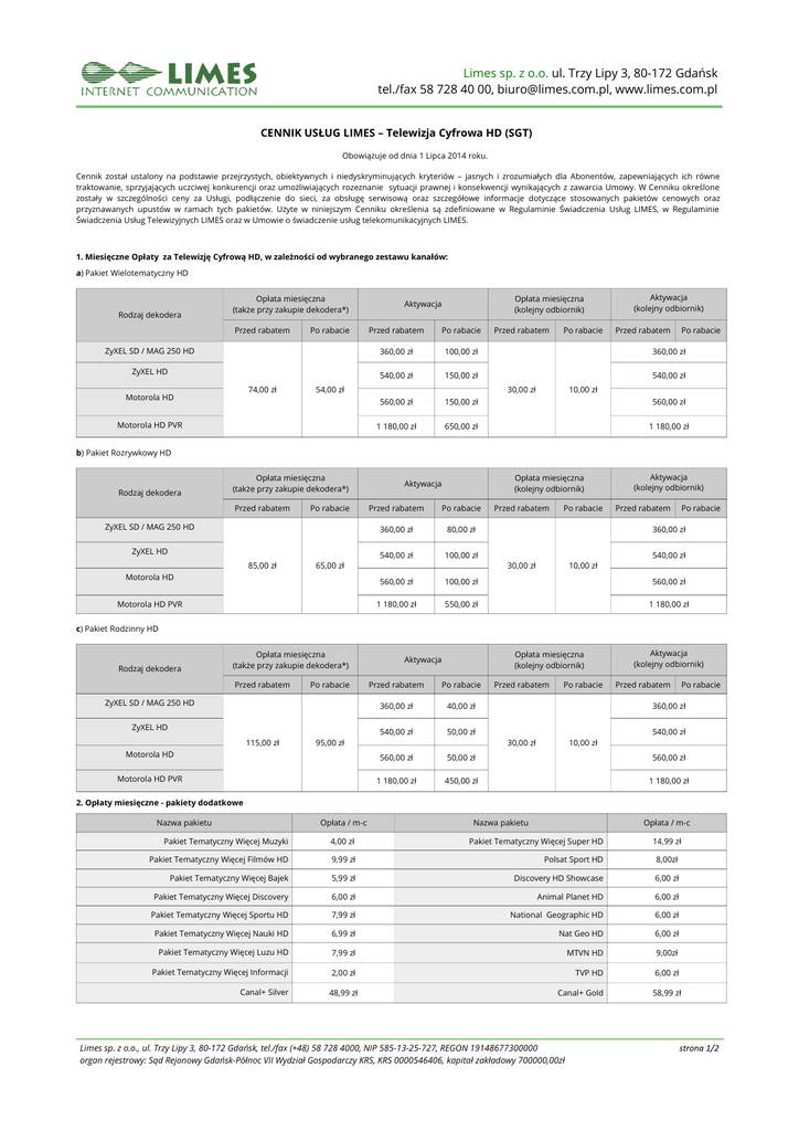 Limes sp. z o.o. ul. Trzy Lipy 3, 80-172 Gdańsk tel./fax 58 728 40 00, [email protected], www.limes.com.pl CENNIK USŁUG LIMES – Telewizja Cyfrowa HD (SGT) Obowiązuje od dnia 1 Lipca 2014 roku. Cennik został ustalony na podstawie przejrzystych, obiektywnych i niedyskryminujących kryteriów – jasnych i zrozumiałych dla Abonentów, zapewniających ich równe traktowanie, sprzyjających uczciwej konkurencji oraz umożliwiających rozeznanie sytuacji prawnej i konsekwencji wynikających z zawarcia Umowy. W Cenniku określone zostały w szczególności ceny za Usługi, podłączenie do sieci, za obsługę serwisową oraz szczegółowe informacje dotyczące stosowanych pakietów cenowych oraz przyznawanych upustów w ramach tych pakietów. Użyte w niniejszym Cenniku określenia są zdefiniowane w Regulaminie Świadczenia Usług LIMES, w Regulaminie Świadczenia Usług Telewizyjnych LIMES oraz w Umowie o świadczenie usług telekomunikacyjnych LIMES. 1. Miesięczne Opłaty za Telewizję Cyfrową HD, w zależności od wybranego zestawu kanałów: a) Pakiet Wielotematyczny HD Rodzaj dekodera Opłata miesięczna (także przy zakupie dekodera*) Przed rabatem Po rabacie ZyXEL SD / MAG 250 HD ZyXEL HD 74,00 zł Motorola HD Opłata miesięczna (kolejny odbiornik) Aktywacja Przed rabatem Po rabacie 360,00 zł 100,00 zł 540,00 zł 150,00 zł 54,00 zł Motorola HD PVR Przed rabatem Po rabacie Aktywacja (kolejny odbiornik) Przed rabatem Po rabacie 360,00 zł 540,00 zł 30,00 zł 10,00 zł 560,00 zł 150,00 zł 560,00 zł 1 180,00 zł 650,00 zł 1 180,00 zł b) Pakiet Rozrywkowy HD Rodzaj dekodera Opłata miesięczna (także przy zakupie dekodera*) Przed rabatem Po rabacie ZyXEL SD / MAG 250 HD ZyXEL HD 85,00 zł 65,00 zł Motorola HD Motorola HD PVR Opłata miesięczna (kolejny odbiornik) Aktywacja Przed rabatem Po rabacie Aktywacja (kolejny odbiornik) Przed rabatem Po rabacie Przed rabatem Po rabacie 360,00 zł 80,00 zł 540,00 zł 100,00 zł 560,00 zł 100,00 zł 560,00 zł 1 180,00 zł 550,00 zł 1 180,00 zł 360,00 zł 30,00 zł 10,00 zł 540,00 zł c) Pakiet Rodzinny HD Rodzaj dekodera Opłata miesięczna (także przy zakupie dekodera*) Przed rabatem Po rabacie ZyXEL SD / MAG 250 HD ZyXEL HD 115,00 zł Opłata miesięczna (kolejny odbiornik) Aktywacja Przed rabatem Po rabacie 360,00 zł 40,00 zł 540,00 zł 50,00 zł 95,00 zł Przed rabatem Po rabacie Aktywacja (kolejny odbiornik) Przed rabatem Po rabacie 360,00 zł 540,00 zł 30,00 zł 10,00 zł Motorola HD 560,00 zł 50,00 zł 560,00 zł Motorola HD PVR 1 180,00 zł 450,00 zł 1 180,00 zł 2. Opłaty miesięczne - pakiety dodatkowe Nazwa pakietu Opłata / m-c Nazwa pakietu Opłata / m-c Pakiet Tematyczny Więcej Muzyki 4,00 zł Pakiet Tematyczny Więcej Super HD Pakiet Tematyczny Więcej Filmów HD 9,99 zł Polsat Sport HD 14,99 zł 8,00zł Pakiet Tematyczny Więcej Bajek 5,99 zł Discovery HD Showcase 6,00 zł Pakiet Tematyczny Więcej Discovery 6,00 zł Animal Planet HD 6,00 zł Pakiet Tematyczny Więcej Sportu HD 7,99 zł National Geographic HD 6,00 zł Pakiet Tematyczny Więcej Nauki HD 6,99 zł Nat Geo HD 6,00 zł Pakiet Tematyczny Więcej Luzu HD 7,99 zł MTVN HD 9,00zł Pakiet Tematyczny Więcej Informacji 2,00 zł TVP HD 6,00 zł Canal+ Silver 48,99 zł Canal+ Gold Limes sp. z o.o., ul. Trzy Lipy 3, 80-172 Gdańsk, tel./fax (+48) 58 728 4000, NIP 585-13-25-727, REGON 19148677300000 organ rejestrowy: Sąd Rejonowy Gdańsk-Północ VII Wydział Gospodarczy KRS, KRS 0000546406, kapitał zakładowy 700000,00zł 58,99 zł strona 1/2 Limes sp. z o.o. ul. Trzy Lipy 3, 80-172 Gdańsk tel./fax 58 728 40 00, [email protected], www.limes.com.pl Canal+ Platinum 69,99 zł Pakiet NEXT 3D HD nSport HD 5,99 zł Zestaw Premium FILMBOX Republika TV 4,99 zł Nazwa pakietu 6,99 zł 15,00 zł Opłata / m-c Pakiet Premium HBO 29,99 zł Opcja HBO On Demand wyłącznie dla posiadaczy Pakietu Premium HBO 7,00 zł Pakiet Premium Cinemax 15,00 zł Pakiet Tematyczny Więcej Seriali 9,99 zł Pakiet Tematyczny VIASAT 9,99 zł 3. Opłaty jednorazowe ZyXEL SD / MAG 250 HD Nazwa Usługi Przed rabatem Aktywacja Usługi na kolejnym odbiorniku TV Po rabacie Zyxel HD Przed rabatem Motorola HD Po rabacie 360,00 zł 540,00 zł 360,00 zł 540,00 zł Instalacja Usługi Przed rabatem Motorola HD PVR Po rabacie Przed rabatem Po rabacie 560,00 zł 1 180,00 zł 560,00 zł 1 180,00 zł 1,00 zł Zakup dekodera Aktywacja Usługi przy zakupie dekodera przez Abonenta 99,00 zł Zamiana udostępnionego dekodera na dekoder z nagrywarką w trakcie trwania Umowy -ponowna Aktywacja Usługi 1,00 zł --------- 99,00 zł 1,00 zł --------- 99,00 zł 1,00 zł --------- 99,00 zł 1,00 zł 1 279,00 zł 400,00 zł 4. Opłaty serwisowe - jednorazowe Nazwa Usługi Naprawa uszkodzonego przez Abonenta dekodera (zamiana/nowy dekoder) ZyXEL SD / MAG 250 HD ZyXEL HD Motorola HD Motorola HD PVR 459,00 zł 639,00 zł 879,00 zł 1 279,00 zł Motorola HD Motorola HD PVR Nieuzasadnione wezwanie serwisu 50,00 zł Przeniesienie dekodera do drugiego miejsca w lokalu 50,00 zł Naprawa lub modernizacja sieci w lokalu Abonenta 60,00 zł 5. Inne Opłaty Nazwa Usługi ZyXEL SD / MAG 250 HD Cesja Umowy - bez zmiany miejsca instalacji - możliwa tylko w przypadku braku zaległości płatniczych względem Operatora 0,00 zł Samowolne podłączenie/udostępnienie Usług bez zgody Operatora Brak zwrotu udostępnionego dekodera po zakończeniu Umowy ZyXEL HD 2 000,00 zł 459,00 zł 639,00 zł 879,00 zł 1 279,00 zł Wszystkie wyżej wymienione Opłaty stanowią ceny podstawowe i zawierają podatek od towarów i usług. Operator nie wyklucza stosowania ulg na Opłaty, innych czasów określonych Umów oraz możliwości sprzedaży innych zestawów / pakietów kanałów niż wymienione w w/w Cenniku, po uprzednim ogłoszeniu takiego faktu. Kwoty określone w cenniku „Po rabacie” obowiązują w przypadku Usług łączonych tj. podłączenia usługi Telewizji Cyfrowej HD wraz z dostępem do Internetu w LIMES o prędko