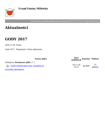 Urząd Gminy Milówka http://www.milowka.pl/aktualnosci/index/GODY-2017/idn:1185/printpdf.html Aktualności GODY 2017 2016-11-30, Środa Gody 2017 - Regulamin i Karta zgłoszenia Nazwa pliku Data Rozmiar Pobierz publikacji Kategoria: Powiązane pliki [ 1 ] GODY ŻYWIECKIE 2016- PLENER.rtf wszystkie aktualności 16-11-30 14:12 48.4KB pobierz