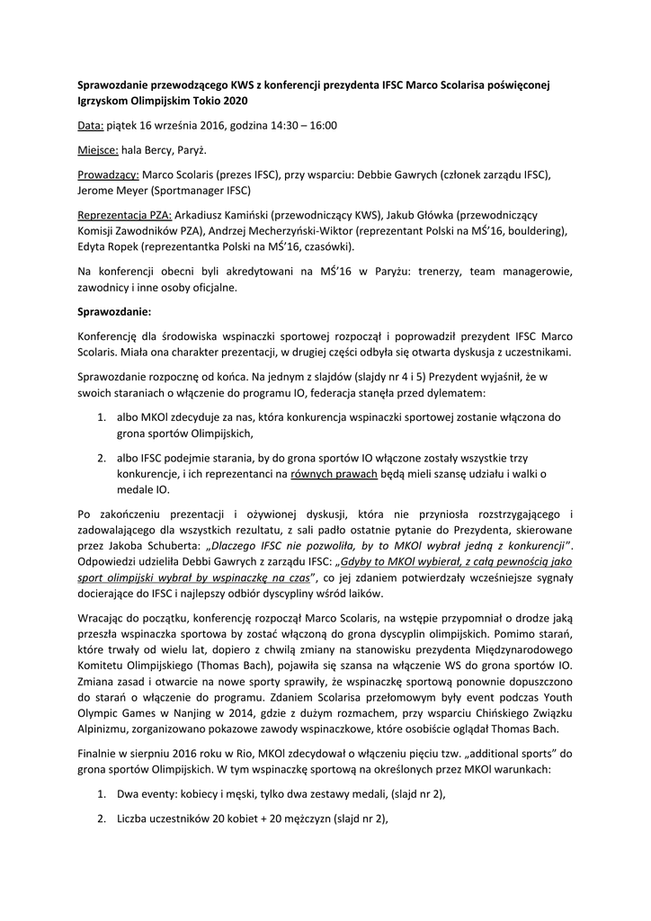 Sprawozdanie przewodzącego KWS z konferencji prezydenta IFSC Marco Scolarisa poświęconej Igrzyskom Olimpijskim Tokio 2020 Data: piątek 16 września 2016, godzina 14:30 – 16:00 Miejsce: hala Bercy, Paryż. Prowadzący: Marco Scolaris (prezes IFSC), przy wsparciu: Debbie Gawrych (członek zarządu IFSC), Jerome Meyer (Sportmanager IFSC) Reprezentacja PZA: Arkadiusz Kamiński (przewodniczący KWS), Jakub Główka (przewodniczący Komisji Zawodników PZA), Andrzej Mecherzyński-Wiktor (reprezentant Polski na MŚ’16, bouldering), Edyta Ropek (reprezentantka Polski na MŚ’16, czasówki). Na konferencji obecni byli akredytowani na MŚ’16 w Paryżu: trenerzy, team managerowie, zawodnicy i inne osoby oficjalne. Sprawozdanie: Konferencję dla środowiska wspinaczki sportowej rozpoczął i poprowadził prezydent IFSC Marco Scolaris. Miała ona charakter prezentacji, w drugiej części odbyła się otwarta dyskusja z uczestnikami. Sprawozdanie rozpocznę od końca. Na jednym z slajdów (slajdy nr 4 i 5) Prezydent wyjaśnił, że w swoich staraniach o włączenie do programu IO, federacja stanęła przed dylematem: 1. albo MKOl zdecyduje za nas, która konkurencja wspinaczki sportowej zostanie włączona do grona sportów Olimpijskich, 2. albo IFSC podejmie starania, by do grona sportów IO włączone zostały wszystkie trzy konkurencje, i ich reprezentanci na równych prawach będą mieli szansę udziału i walki o medale IO. Po zakończeniu prezentacji i ożywionej dyskusji, która nie przyniosła rozstrzygającego i zadowalającego dla wszystkich rezultatu, z sali padło ostatnie pytanie do Prezydenta, skierowane przez Jakoba Schuberta: „Dlaczego IFSC nie pozwoliła, by to MKOl wybrał jedną z konkurencji”. Odpowiedzi udzieliła Debbi Gawrych z zarządu IFSC: „Gdyby to MKOl wybierał, z całą pewnością jako sport olimpijski wybrał by wspinaczkę na czas”, co jej zdaniem potwierdzały wcześniejsze sygnały docierające do IFSC i najlepszy odbiór dyscypliny wśród laików. Wracając do początku, konferencję rozpoczął Marco Scolaris, na wstępie przypomniał o drodze jaką przeszła wspinaczka sportowa by zostać włączoną do grona dyscyplin olimpijskich. Pomimo starań, które trwały od wielu lat, dopiero z chwilą zmiany na stanowisku prezydenta Międzynarodowego Komitetu Olimpijskiego (Thomas Bach), pojawiła się szansa na włączenie WS do grona sportów IO. Zmiana zasad i otwarcie na nowe sporty sprawiły, że wspinaczkę sportową ponownie dopuszczono do starań o włączenie do programu. Zdaniem Scolarisa przełomowym były event podczas Youth Olympic Games w Nanjing w 2014, gdzie z dużym rozmachem, przy wsparciu Chińskiego Związku Alpinizmu, zorganizowano pokazowe zawody wspinaczkowe, które osobiście oglądał Thomas Bach. Finalnie w sierpniu 2016 roku w Rio, MKOl zdecydował o włączeniu pięciu tzw. „additional sports” do grona sportów Olimpijskich. W tym wspinaczkę sportową na określonych przez MKOl warunkach: 1. Dwa eventy: kobiecy i męski, tylko dwa zestawy medali, (slajd nr 2), 2. Liczba uczestników 20 kobiet + 20 mężczyzn (slajd nr 2), 3. Najlepsi zawodnicy (mistrzowie świata) z każdej z trzech konkurencji muszą mieć możliwość udziału i zostać zakwalifikowania do IO, 4. Zawody podczas IO muszą być rozgrywane w istniejącej już dyscyplinie, wg. istniejących zasad. Jak wyjaśnił Marco Scolaris oznacza to, że z chwilą włączenia do programu IO, IFSC nie może sztucznie stworzyć nowego sportu, nowej konkurencji, nadając mu tym samym nowy priorytet, 5. Zwycięzcy IO muszą być wyłonieni podczas ostatniego eventu (konkurencji) rozgrywanego ostatniego dnia na IO – czytelność w odbiorze dla publiczności (nie może być tak, że zwycięzcę IO znamy już po rozegraniu dwóch, z trzech konkurencji), 6. Format zawodów podczas IO musi być tak skonstruowany, by napięcie wzrastało aż do ostatniego dnia i ostatniej minuty zawodów, 7. Sposób liczenia klasyfikacji po każdej z konkurencji musi być jak najprostszy, czytelny i jasny w odbiorze dla laików, 8. Czas trwania IO we wspinaczce – 3 dni. Propozycja za którą lobbuje zarząd IFSC: 1 dzień eliminacje: czasówki, 2 dzień półfinał: bouldery, 3 dzień finał: prowadzenie – wyłania medalistów IO. Jednocześnie Scolaris zwrócił uwagę na fakt, że format rozgrywania zawodów musi być dostosowany do wymagań produkcji telewizyjnej, określonych przez MKOl. Zwrócił również uwagę na fakt, że IO w Tokio odbędą się w miesiącu sierpniu w środku upalnego lata, przy ogromnej wilgotności, w związku z czym konkurencje nie mogą być rozgrywane w niektórych porach dnia np. w południe. Oba w/w warunki mają istotny wpływ na format IO. Prezydent omówił dylemat przed jakim stanęła IFSC, w przypadku wyrażenia zgody na to by to MKOl decydował, która z dyscyplin zostanie wybrana do programu IO, istniało bardzo dużo prawdopodobieństwo zmarginalizowania pozostałych konkurencji wspinaczki sportowej. Z jednoczesnym nadaniem wysokiego priorytety dyscyplinie olimpijskiej, zarówno na poziomie międzynarodowym, jak i na szczeblu poszczególnych federacji zrzeszonych w IFSC. Przełożyłoby się to na liczbę imprez, ilość zawodników, zainteresowanie mediów, sponsorów a także wsparcie ze strony samorządów czy państwa – prawdopodobnie bouldering i prowadzenie zostałyby zmarginalizowane. Zarząd IFSC zdecydował, by biorąc pod uwagę dotychczasowe tradycje związane z rozgrywaniem poszczególnych dyscyplin wspinaczkowych, zapewnić równe szanse dla wszystkich trzech konkurencji wspinaczki sportowej i ich reprezentantów do walki o medal IO (slajdy 5 i 6). Jednocześnie Marco Scolrais zaznaczył, że celem dla IFSC jest utrzymanie się w / włączenie na stałe wspinaczki sportowej do grona sportów olimpijskich, z wywalczeniem „mores space for us”, większej liczby uczestników i możliwości nagradzania medalami IO zwycięzców ka