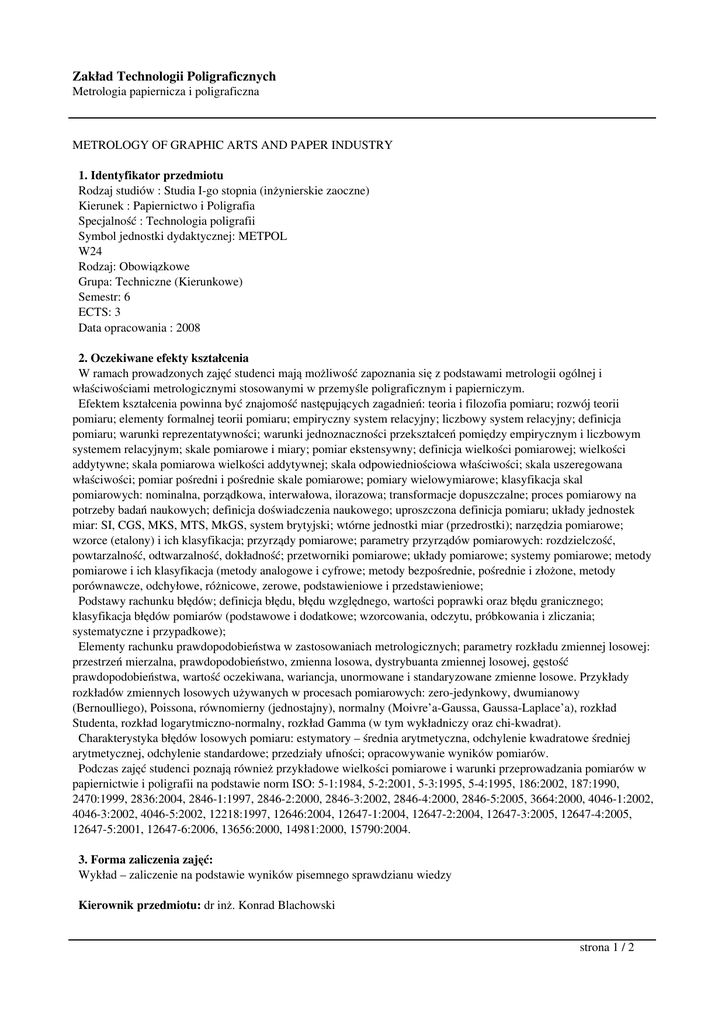Zakład Technologii Poligraficznych Metrologia papiernicza i poligraficzna METROLOGY OF GRAPHIC ARTS AND PAPER INDUSTRY 1. Identyfikator przedmiotu Rodzaj studiów : Studia I-go stopnia (inżynierskie zaoczne) Kierunek : Papiernictwo i Poligrafia Specjalność : Technologia poligrafii Symbol jednostki dydaktycznej: METPOL W24 Rodzaj: Obowiązkowe Grupa: Techniczne (Kierunkowe) Semestr: 6 ECTS: 3 Data opracowania : 2008 2. Oczekiwane efekty kształcenia W ramach prowadzonych zajęć studenci mają możliwość zapoznania się z podstawami metrologii ogólnej i właściwościami metrologicznymi stosowanymi w przemyśle poligraficznym i papierniczym. Efektem kształcenia powinna być znajomość następujących zagadnień: teoria i filozofia pomiaru; rozwój teorii pomiaru; elementy formalnej teorii pomiaru; empiryczny system relacyjny; liczbowy system relacyjny; definicja pomiaru; warunki reprezentatywności; warunki jednoznaczności przekształceń pomiędzy empirycznym i liczbowym systemem relacyjnym; skale pomiarowe i miary; pomiar ekstensywny; definicja wielkości pomiarowej; wielkości addytywne; skala pomiarowa wielkości addytywnej; skala odpowiedniościowa właściwości; skala uszeregowana właściwości; pomiar pośredni i pośrednie skale pomiarowe; pomiary wielowymiarowe; klasyfikacja skal pomiarowych: nominalna, porządkowa, interwałowa, ilorazowa; transformacje dopuszczalne; proces pomiarowy na potrzeby badań naukowych; definicja doświadczenia naukowego; uproszczona definicja pomiaru; układy jednostek miar: SI, CGS, MKS, MTS, MkGS, system brytyjski; wtórne jednostki miar (przedrostki); narzędzia pomiarowe; wzorce (etalony) i ich klasyfikacja; przyrządy pomiarowe; parametry przyrządów pomiarowych: rozdzielczość, powtarzalność, odtwarzalność, dokładność; przetworniki pomiarowe; układy pomiarowe; systemy pomiarowe; metody pomiarowe i ich klasyfikacja (metody analogowe i cyfrowe; metody bezpośrednie, pośrednie i złożone, metody porównawcze, odchyłowe, różnicowe, zerowe, podstawieniowe i przedstawieniowe; Podstawy rachunku błędów; definicja błędu, błędu względnego, wartości poprawki oraz błędu granicznego; klasyfikacja błędów pomiarów (podstawowe i dodatkowe; wzorcowania, odczytu, próbkowania i zliczania; systematyczne i przypadkowe); Elementy rachunku prawdopodobieństwa w zastosowaniach metrologicznych; parametry rozkładu zmiennej losowej: przestrzeń mierzalna, prawdopodobieństwo, zmienna losowa, dystrybuanta zmiennej losowej, gęstość prawdopodobieństwa, wartość oczekiwana, wariancja, unormowane i standaryzowane zmienne losowe. Przykłady rozkładów zmiennych losowych używanych w procesach pomiarowych: zero-jedynkowy, dwumianowy (Bernoulliego), Poissona, równomierny (jednostajny), normalny (Moivre’a-Gaussa, Gaussa-Laplace’a), rozkład Studenta, rozkład logarytmiczno-normalny, rozkład Gamma (w tym wykładniczy oraz chi-kwadrat). Charakterystyka błędów losowych pomiaru: estymatory – średnia arytmetyczna, odchylenie kwadratowe średniej arytmetycznej, odchylenie standardowe; przedziały ufności; opracowywanie wyników pomiarów. Podczas zajęć studenci poznają również przykładowe wielkości pomiarowe i warunki przeprowadzania pomiarów w papiernictwie i poligrafii na podstawie norm ISO: 5-1:1984, 5-2:2001, 5-3:1995, 5-4:1995, 186:2002, 187:1990, 2470:1999, 2836:2004, 2846-1:1997, 2846-2:2000, 2846-3:2002, 2846-4:2000, 2846-5:2005, 3664:2000, 4046-1:2002, 4046-3:2002, 4046-5:2002, 12218:1997, 12646:2004, 12647-1:2004, 12647-2:2004, 12647-3:2005, 12647-4:2005, 12647-5:2001, 12647-6:2006, 13656:2000, 14981:2000, 15790:2004. 3. Forma zaliczenia zajęć: Wykład – zaliczenie na podstawie wyników pisemnego sprawdzianu wiedzy Kierownik przedmiotu: dr inż. Konrad Blachowski strona 1 / 2 Zakład Technologii Poligraficznych Metrologia papiernicza i poligraficzna strona 2 / 2