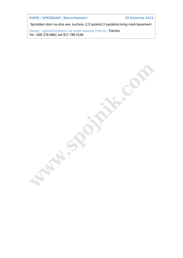 KUPIĘ / SPRZEDAM | Nieruchomości 20 Kwietnia 2015 Sprzedam dom na ohio ave. kuchnia ;2,5 lazienki;3 sypialnie;living room;besement w w w .s po jn ik .c o m Uwaga - ogloszeniodawca nie podał swojego imienia., Trenton Tel.: 609 278 8961 lub 917 789 0190