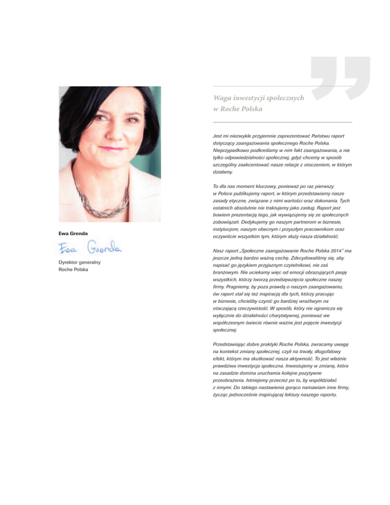 ,, Waga inwestycji społecznych w Roche Polska Jest mi niezwykle przyjemnie zaprezentować Państwu raport dotyczący zaangażowania społecznego Roche Polska. Nieprzypadkowo podkreślamy w nim fakt zaangażowania, a nie tylko odpowiedzialności społecznej, gdyż chcemy w sposób szczególny zaakcentować nasze relacje z otoczeniem, w którym działamy. To dla nas moment kluczowy, ponieważ po raz pierwszy w Polsce publikujemy raport, w którym przedstawiamy nasze zasady etyczne, związane z nimi wartości oraz dokonania. Tych ostatnich absolutnie nie traktujemy jako zasług. Raport jest bowiem prezentacją tego, jak wywiązujemy się ze społecznych zobowiązań. Dedykujemy go naszym partnerom w biznesie, Ewa Grenda instytucjom, naszym obecnym i przyszłym pracownikom oraz oczywiście wszystkim tym, którym służy nasza działalność. Nasz raport „Społeczne zaangażowanie Roche Polska 2014” ma Dyrektor generalny Roche Polska jeszcze jedną bardzo ważną cechę. Zdecydowaliśmy się, aby napisać go językiem przyjaznym czytelnikowi, nie zaś branżowym. Nie uciekamy więc od emocji obrazujących pasję wszystkich, którzy tworzą przedsięwzięcia społeczne naszej firmy. Pragniemy, by poza prawdą o naszym zaangażowaniu, ów raport stał się też inspiracją dla tych, którzy pracując w biznesie, chcieliby czynić go bardziej wrażliwym na otaczającą rzeczywistość. W sposób, który nie ogranicza się wyłącznie do działalności charytatywnej, ponieważ we współczesnym świecie równie ważne jest pojęcie inwestycji społecznej. Przedstawiając dobre praktyki Roche Polska, zwracamy uwagę na kontekst zmiany społecznej, czyli na trwały, długofalowy efekt, którym ma skutkować nasza aktywność. To jest właśnie prawdziwa inwestycja społeczna. Inwestujemy w zmianę, która na zasadzie domina uruchamia kolejne pozytywne przeobrażenia. Istniejemy przecież po to, by współdziałać z innymi. Do takiego nastawienia gorąco namawiam inne firmy, życząc jednocześnie inspirującej lektury naszego raportu.