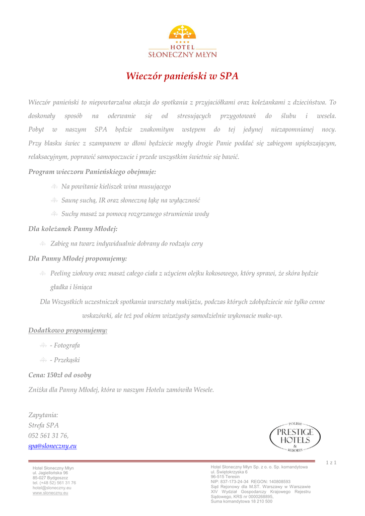 Wieczór panieński w SPA Wieczór panieński to niepowtarzalna okazja do spotkania z przyjaciółkami oraz koleżankami z dzieciństwa. To doskonały sposób Pobyt naszym w na SPA oderwanie będzie się od znakomitym stresujących wstępem przygotowań do tej jedynej do ślubu i wesela. niezapomnianej nocy. Przy blasku świec z szampanem w dłoni będziecie mogły drogie Panie poddać się zabiegom upiększającym, relaksacyjnym, poprawić samopoczucie i przede wszystkim świetnie się bawić. Program wieczoru Panieńskiego obejmuje: Na powitanie kieliszek wina musującego Saunę suchą, IR oraz słoneczną łąkę na wyłączność Suchy masaż za pomocą rozgrzanego strumienia wody Dla koleżanek Panny Młodej: Zabieg na twarz indywidualnie dobrany do rodzaju cery Dla Panny Młodej proponujemy: Peeling ziołowy oraz masaż całego ciała z użyciem olejku kokosowego, który sprawi, że skóra będzie gładka i lśniąca Dla Wszystkich uczestniczek spotkania warsztaty makijażu, podczas których zdobędziecie nie tylko cenne wskazówki, ale też pod okiem wizażysty samodzielnie wykonacie make-up. Dodatkowo proponujemy: - Fotografa - Przekąski Cena: 150zł od osoby Zniżka dla Panny Młodej, która w naszym Hotelu zamówiła Wesele. Zapytania: Strefa SPA 052 561 31 76, [email protected] Hotel Słoneczny Młyn ul. Jagiellońska 96 85-027 Bydgoszcz tel. (+48 52) 561 31 76 [email protected] www.sloneczny.eu Hotel Słoneczny Młyn Sp. z o. o. Sp. komandytowa ul. Świętokrzyska 6 96-515 Teresin NIP: 837-173-24-34 REGON: 140808593 Sąd Rejonowy dla M.ST. Warszawy w Warszawie XIV Wydział Gospodarczy Krajowego Rejestru Sądowego, KRS nr 0000268895, Suma komandytowa 18 210 500 1z1
